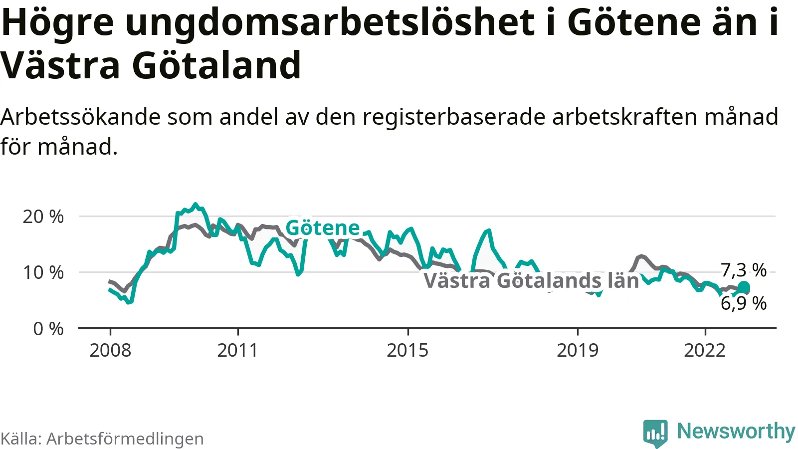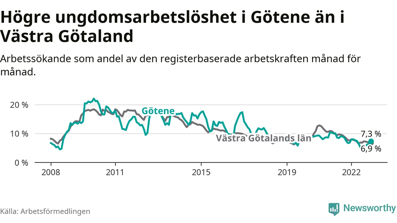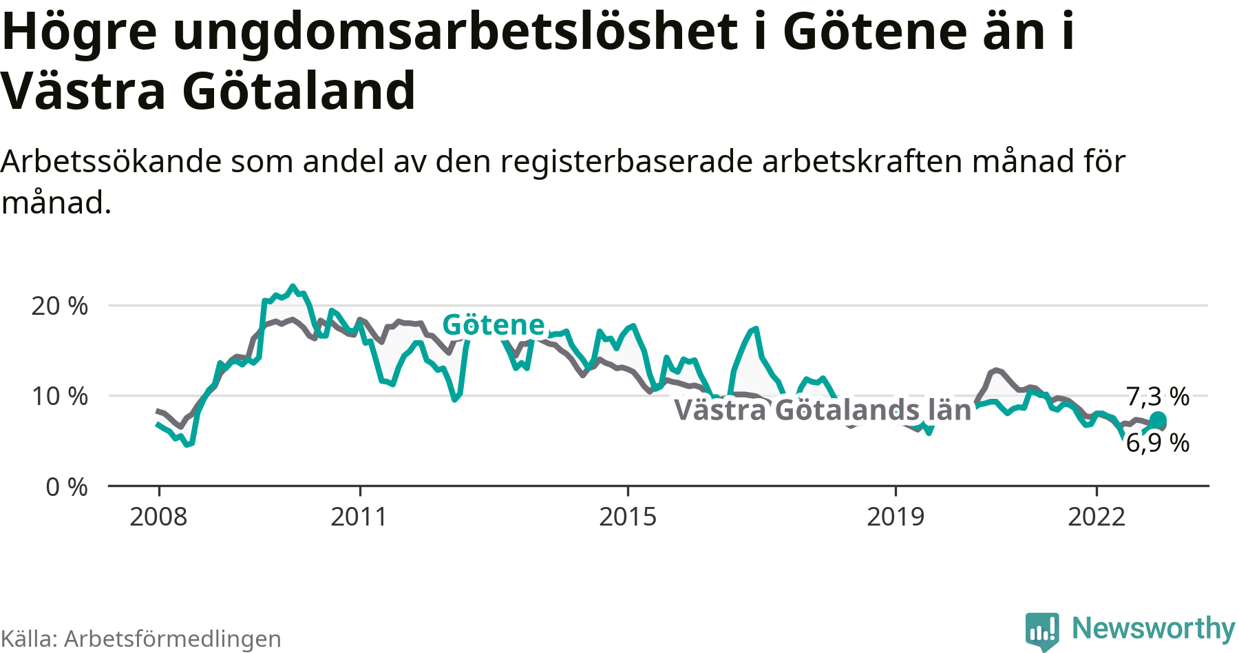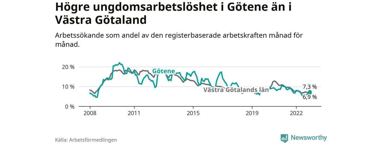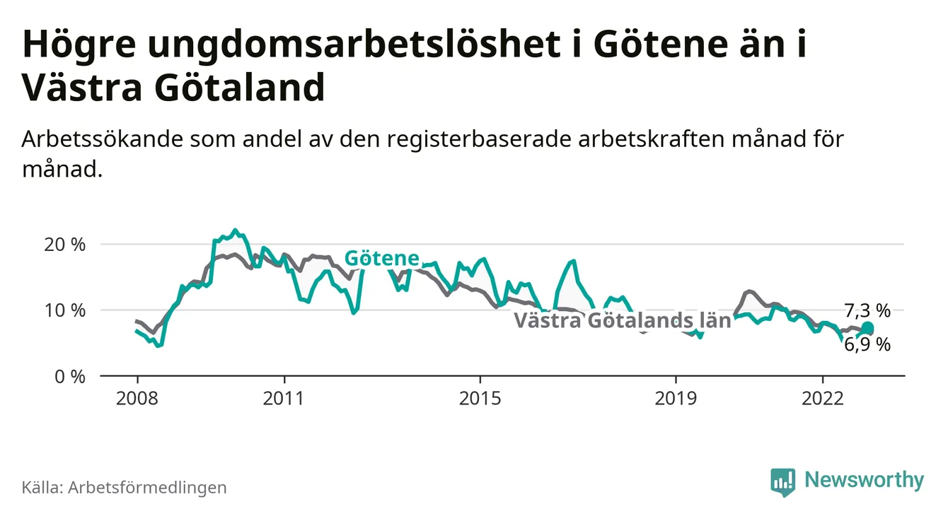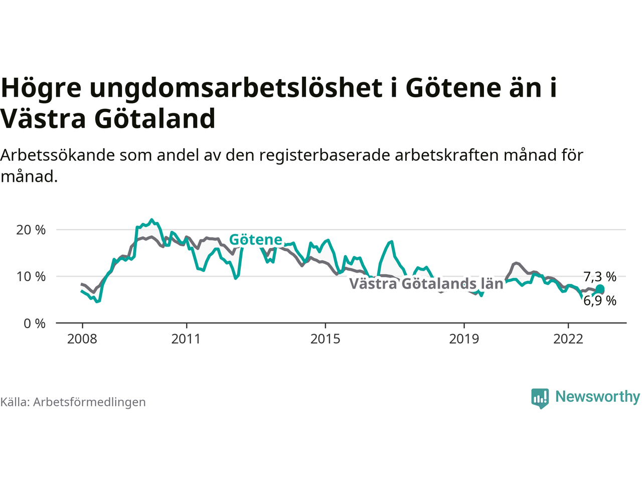 Medan Götene har lägre total arbetslöshet än Västra Götaland, ligger ungdomsarbetslösheten 0,4 procentenheter högre i Götene.