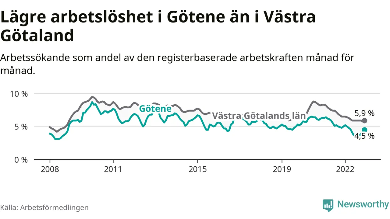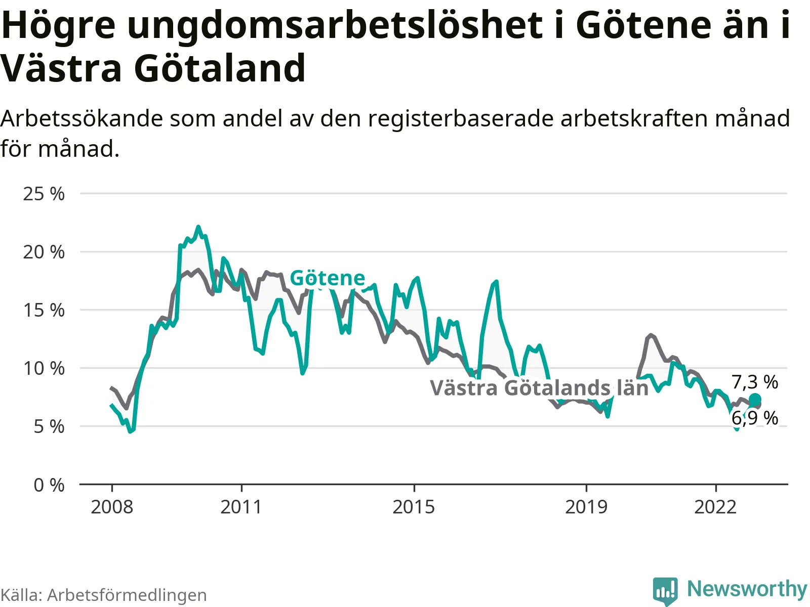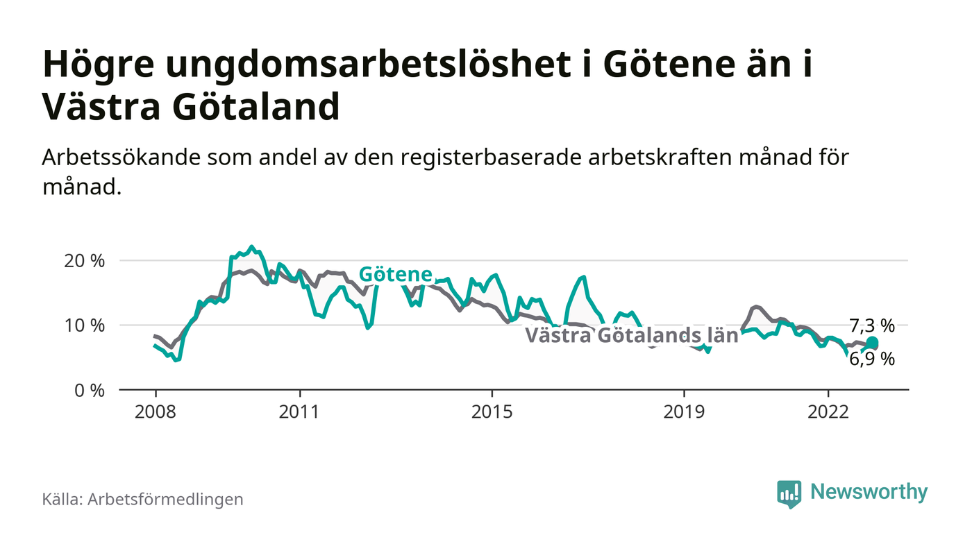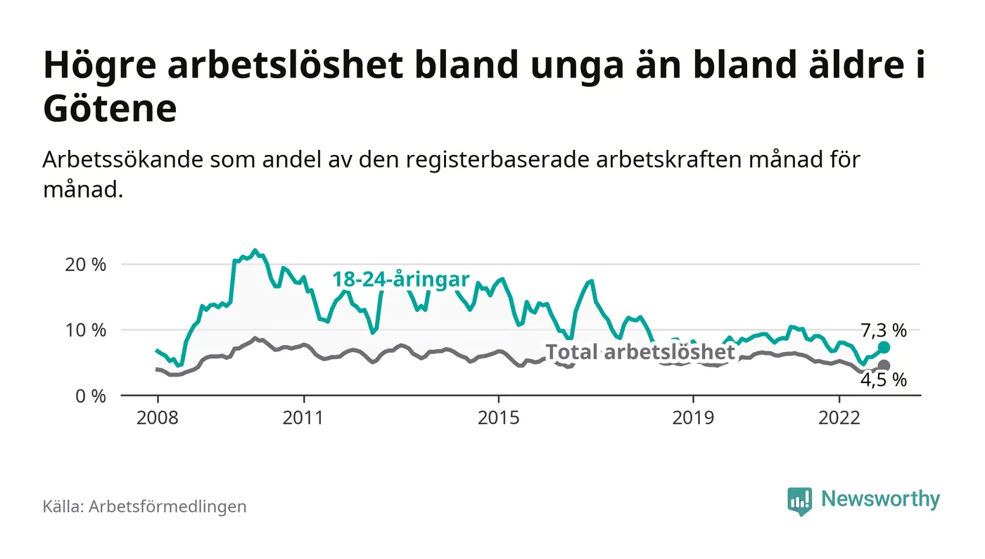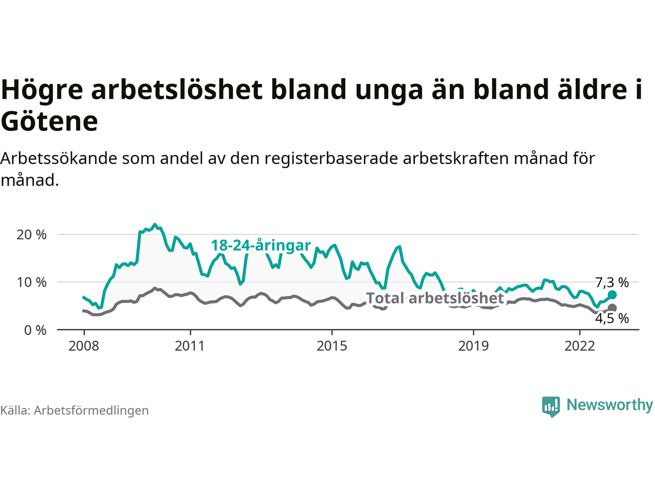 Medan Götene har lägre total arbetslöshet än Västra Götaland, ligger ungdomsarbetslösheten 0,4 procentenheter högre i Götene.