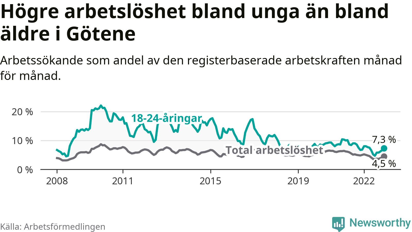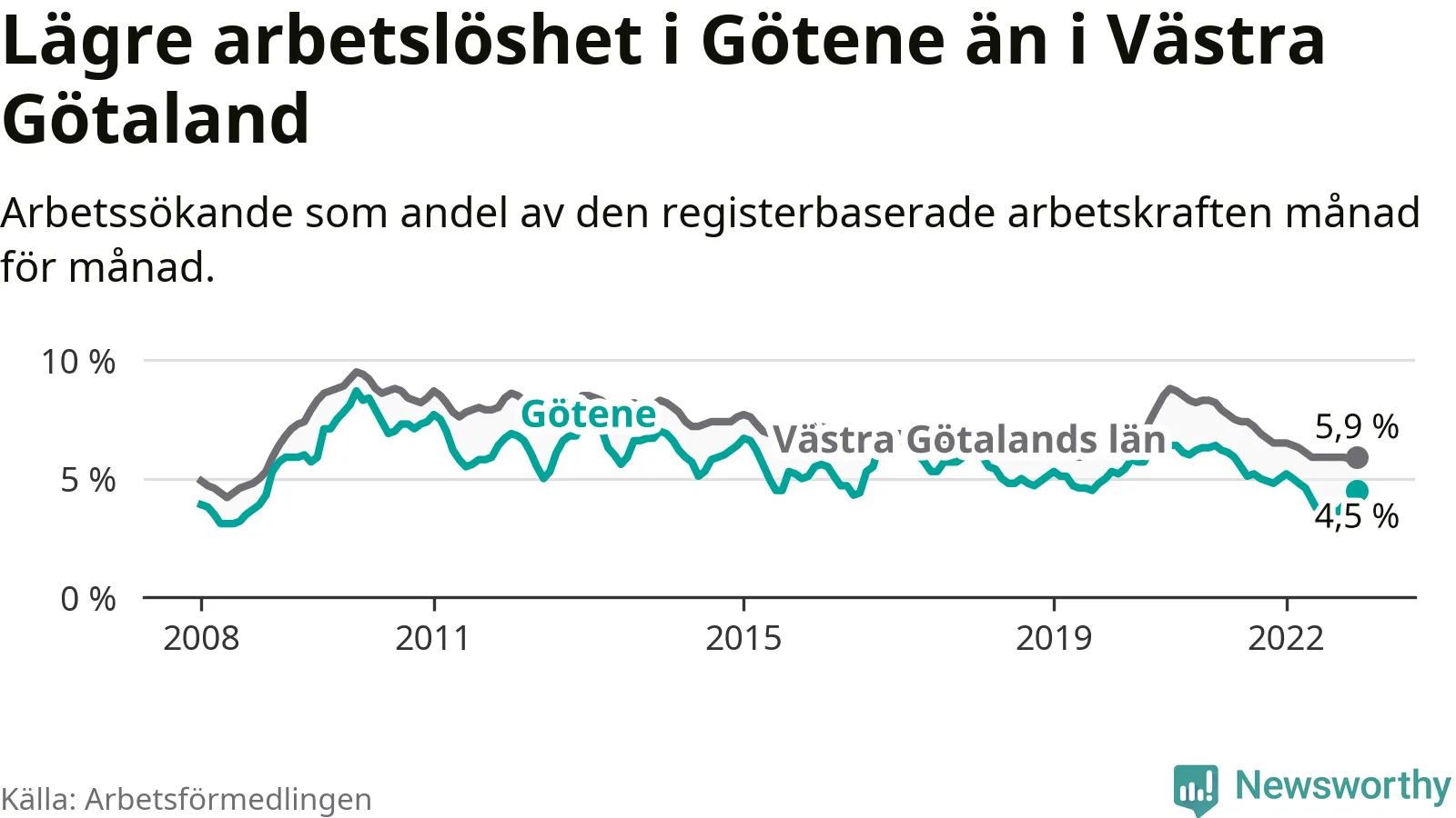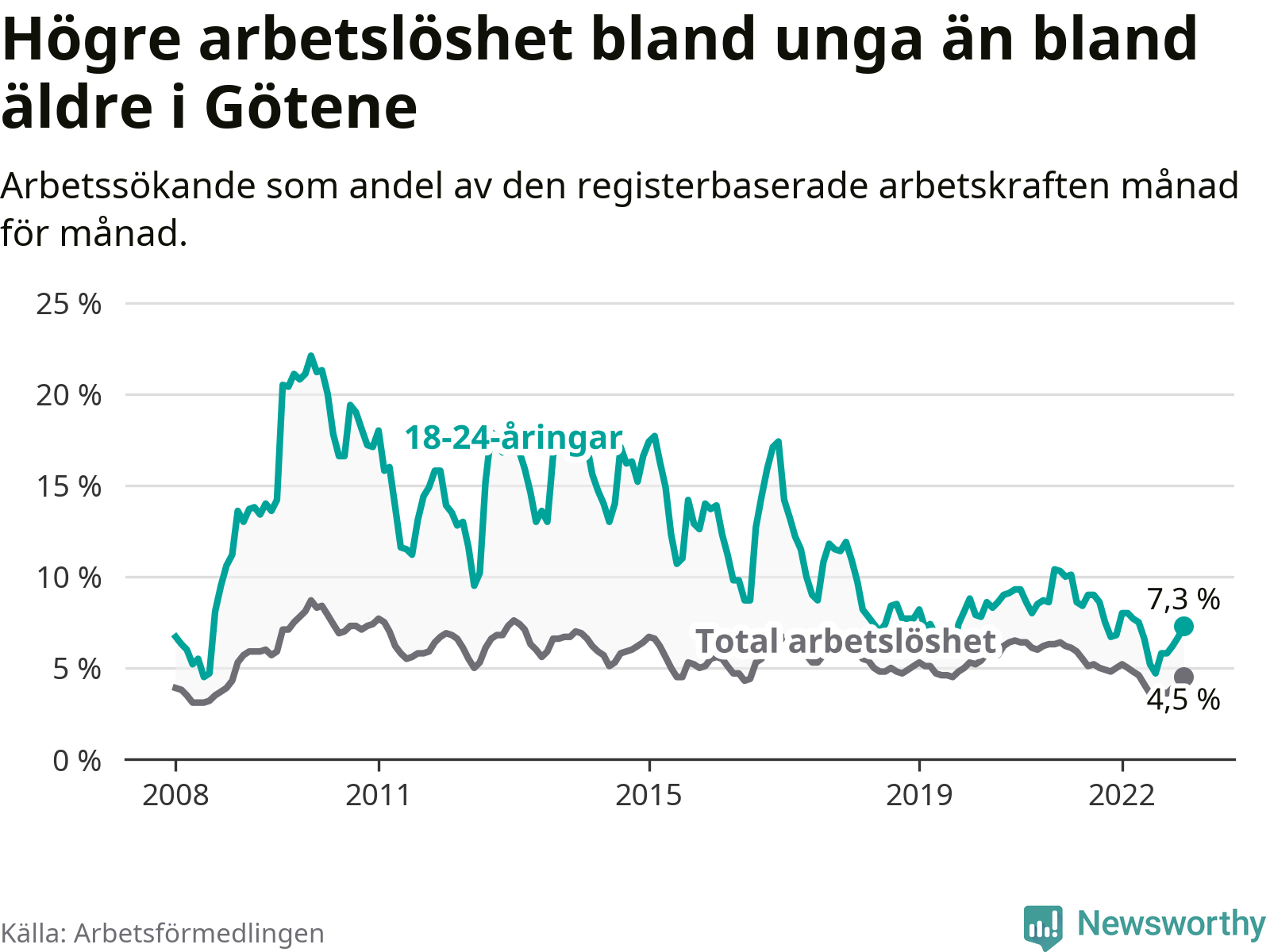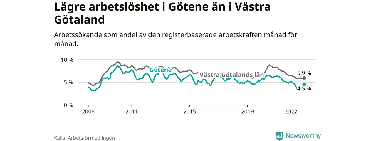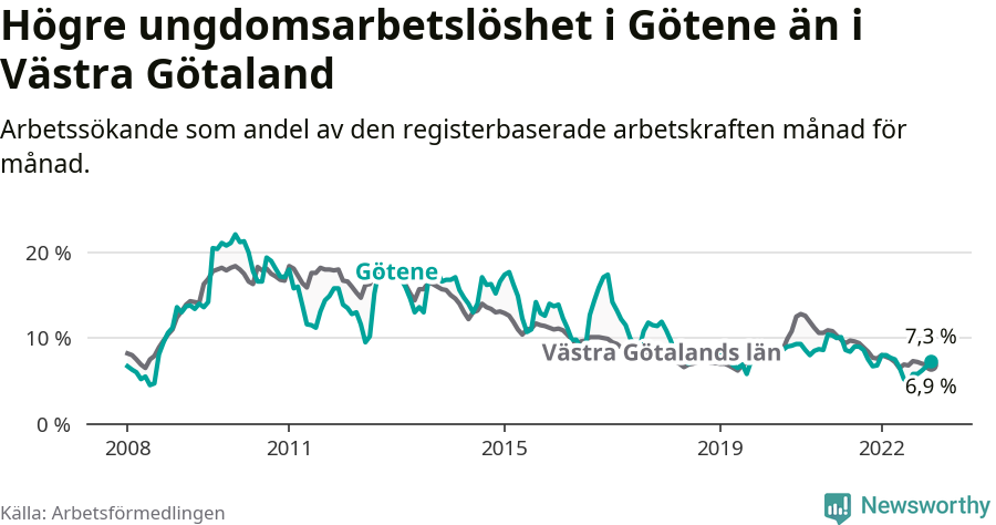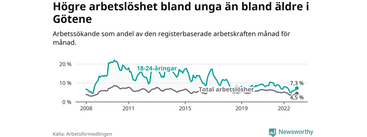 Medan Götene har lägre total arbetslöshet än Västra Götaland, ligger ungdomsarbetslösheten 0,4 procentenheter högre i Götene.