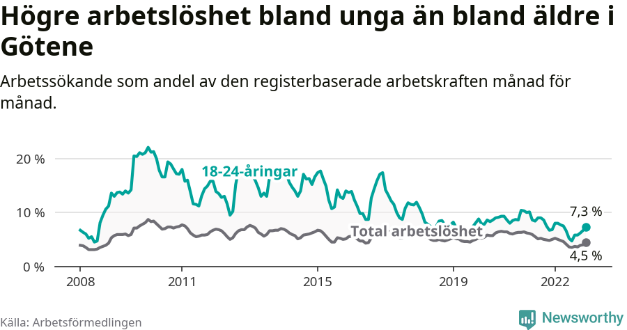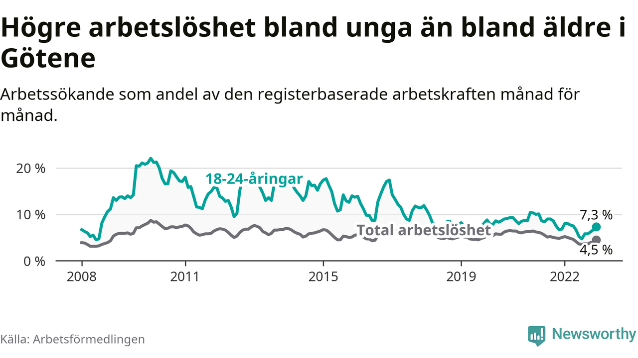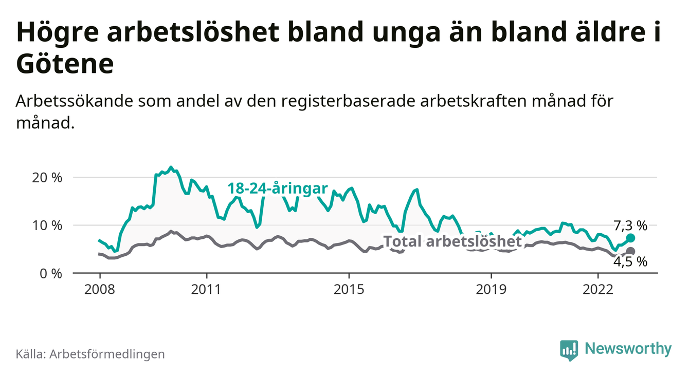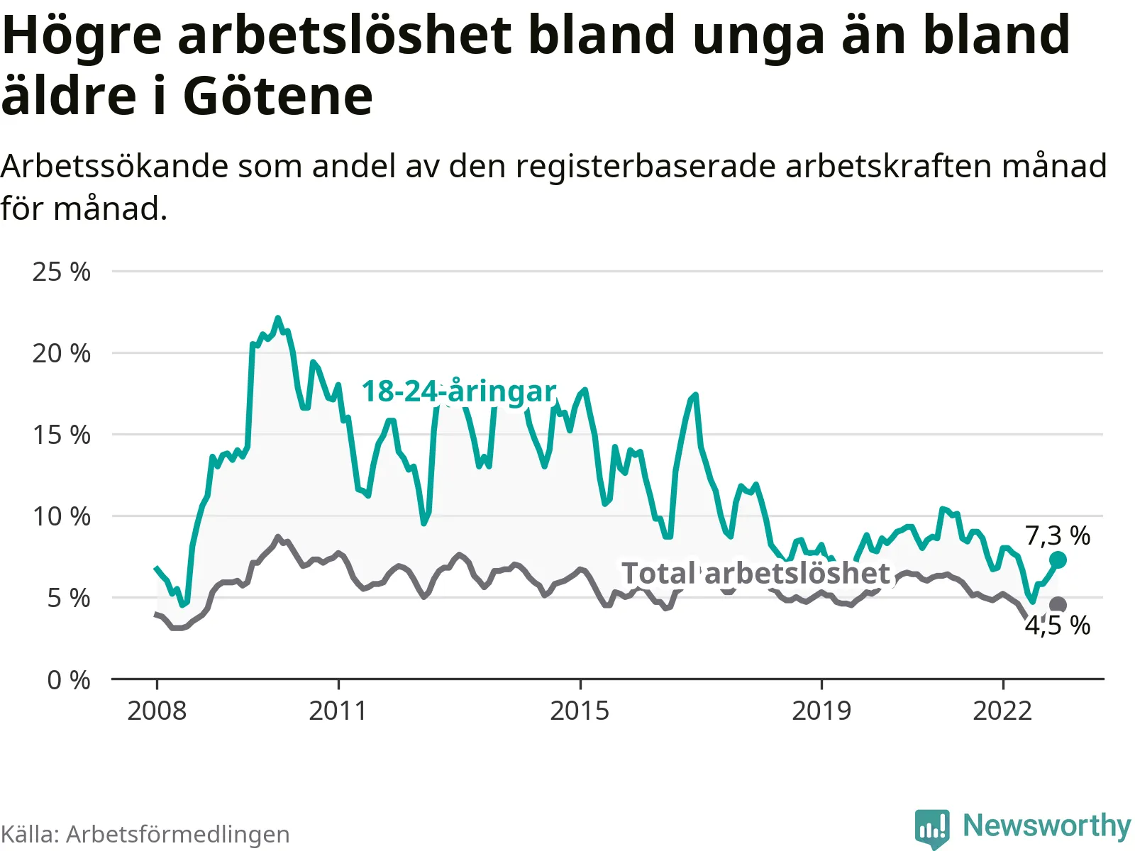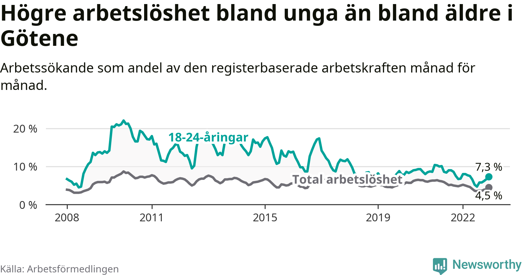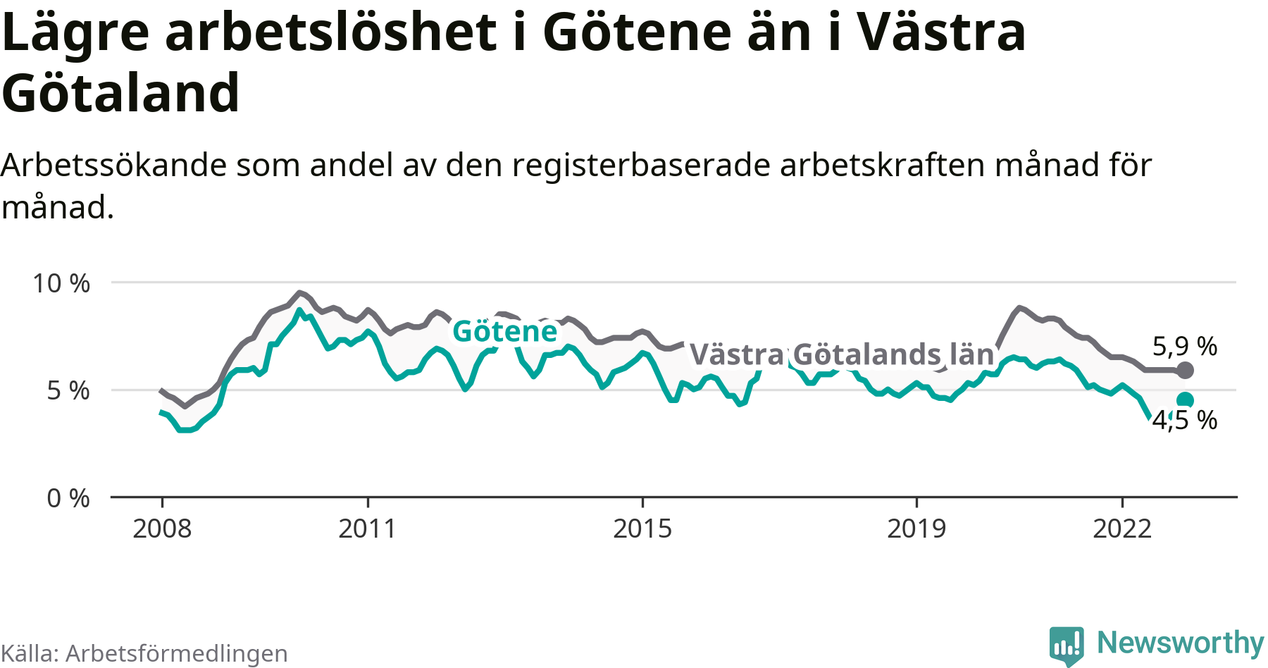 Medan Götene har lägre total arbetslöshet än Västra Götaland, ligger ungdomsarbetslösheten 0,4 procentenheter högre i Götene.
