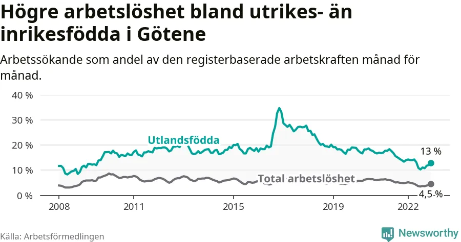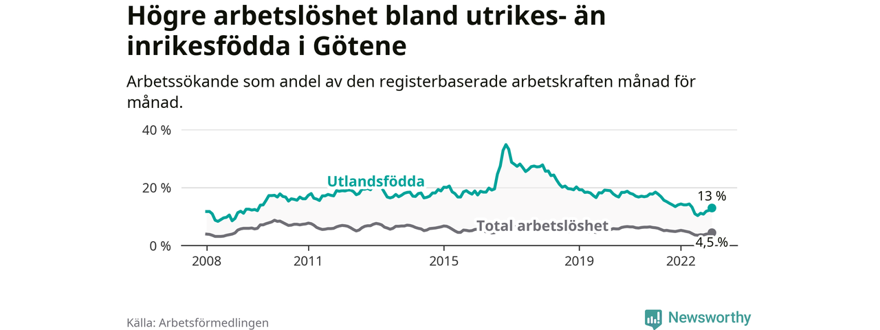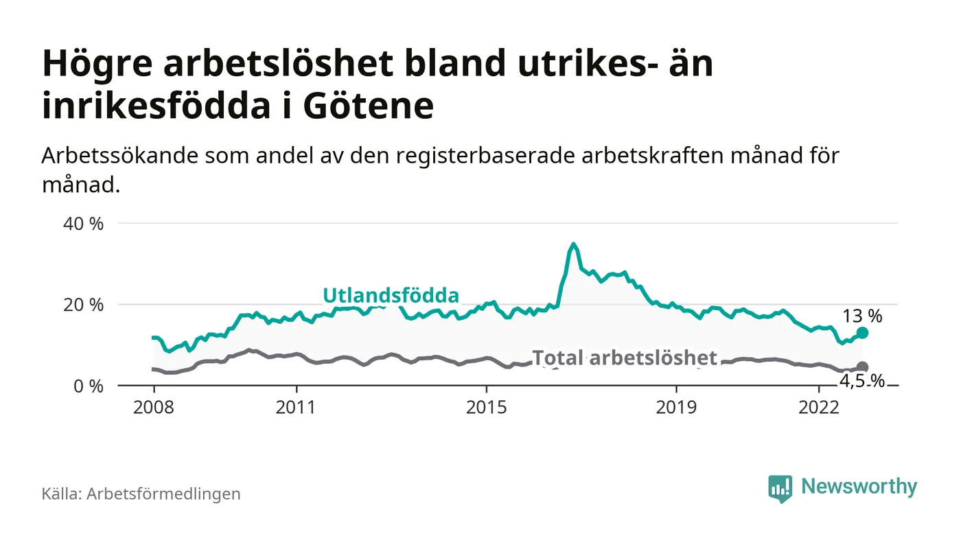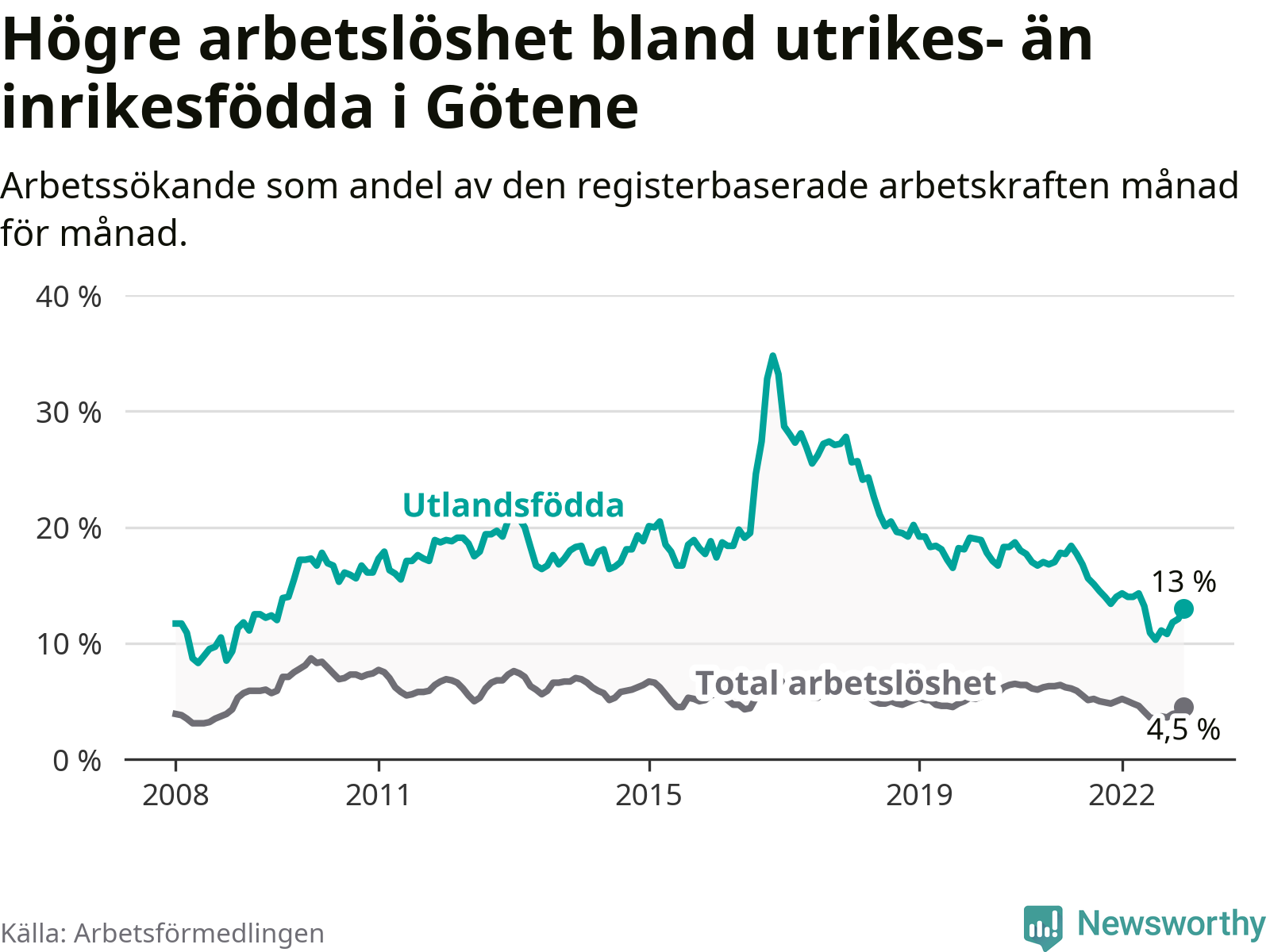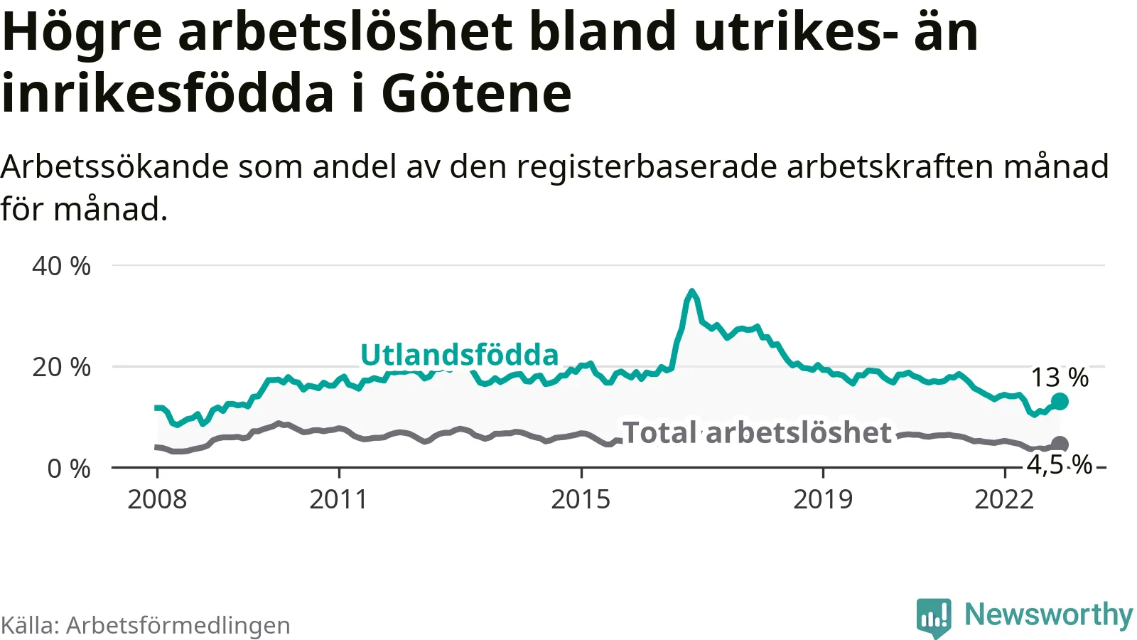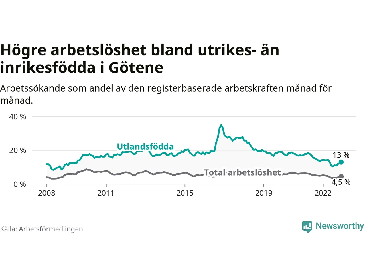 Arbetslösheten bland utlandsfödda var 13,0 procent i Götene under december månad, motsvarande 105 av 808 personer. Det är 1,0 procentenheter färre än vid samma tidpunkt i fjol (−8 om man räknar personer). Därmed är de utlandsföddas arbetslöshet lägre än vid samma tidpunkt i fjol för 20:e månaden i följd. Sedan april 2021 har arbetslösheten bland utlandsfödda minskat från 18,4 till 13,0 procent.