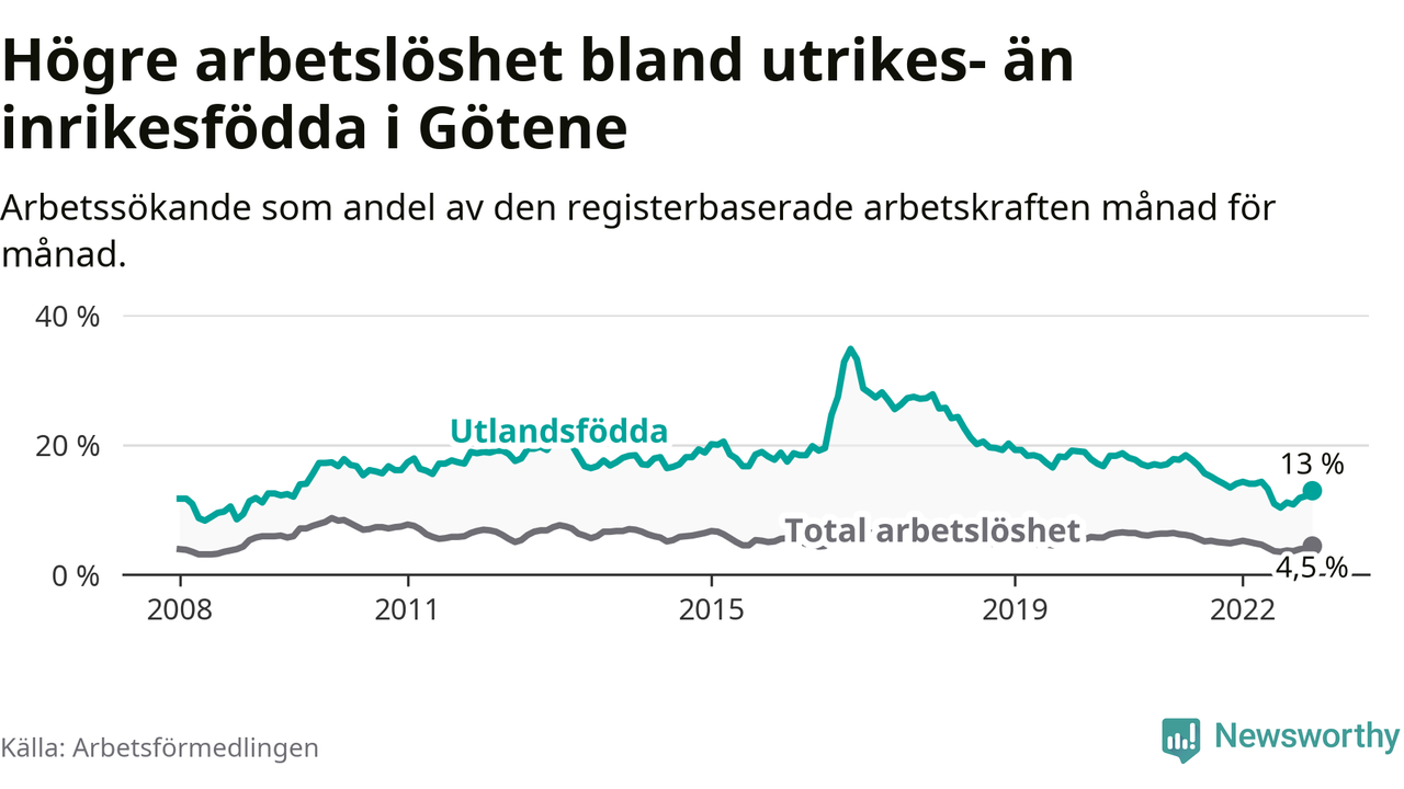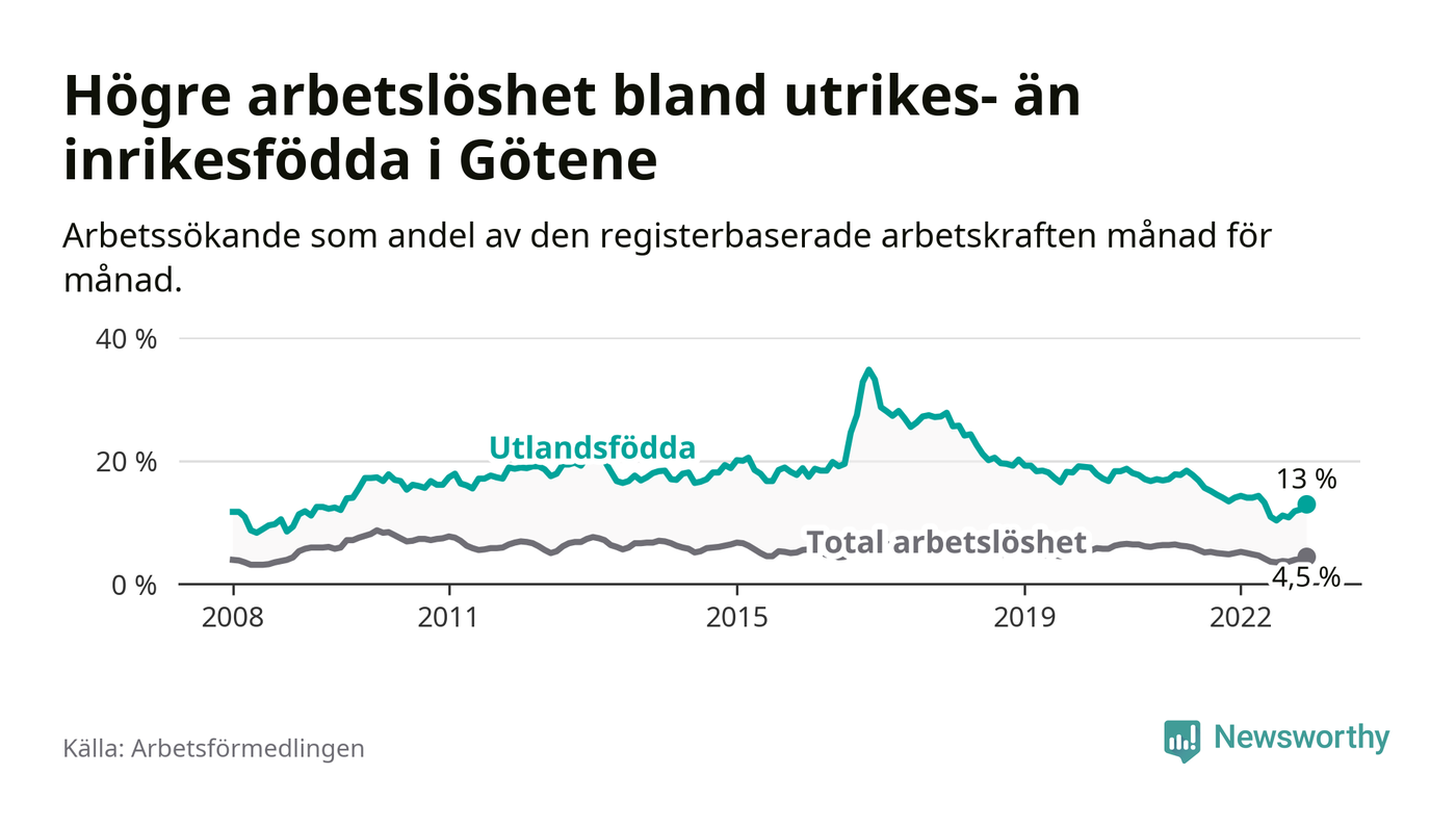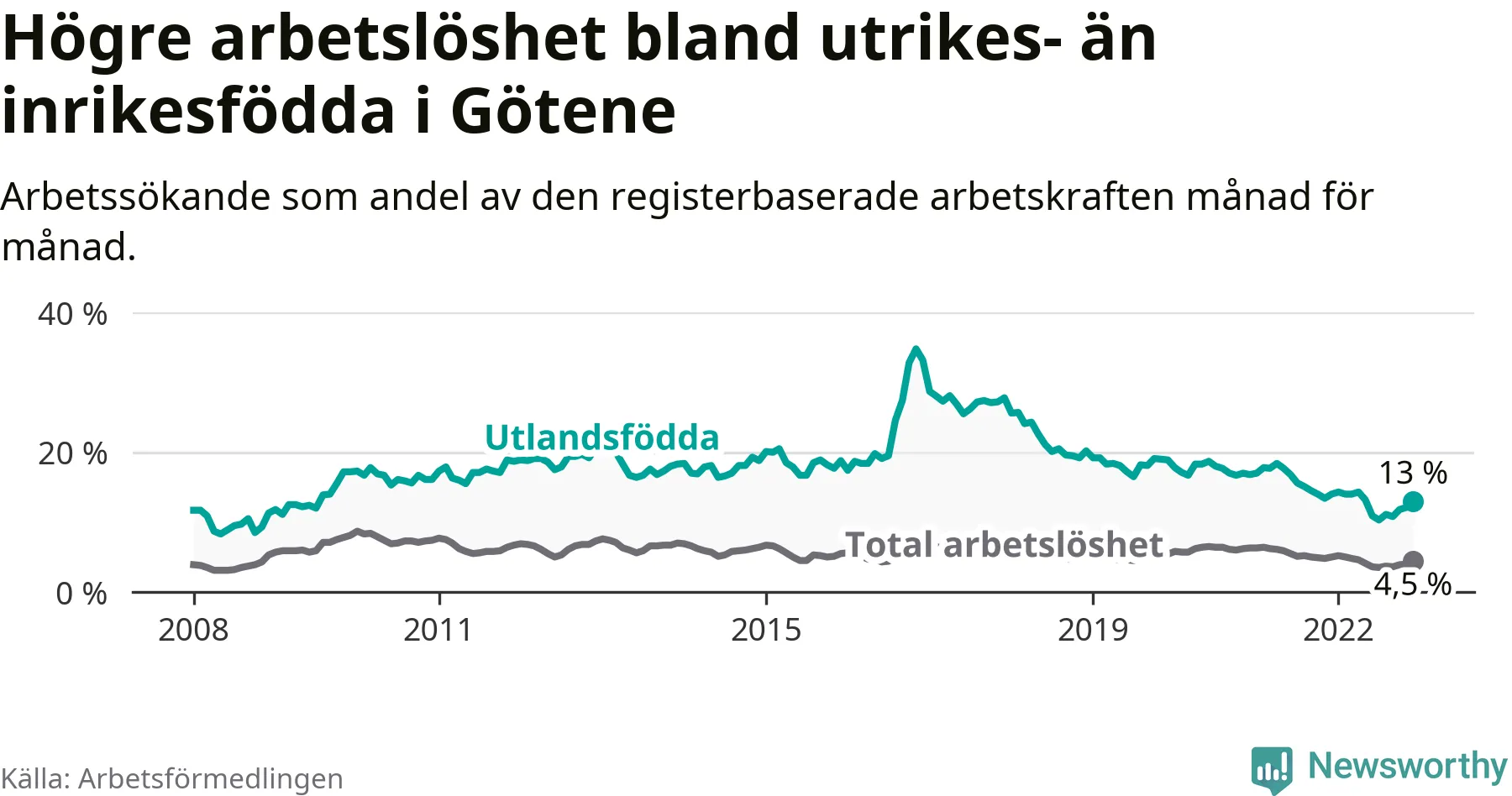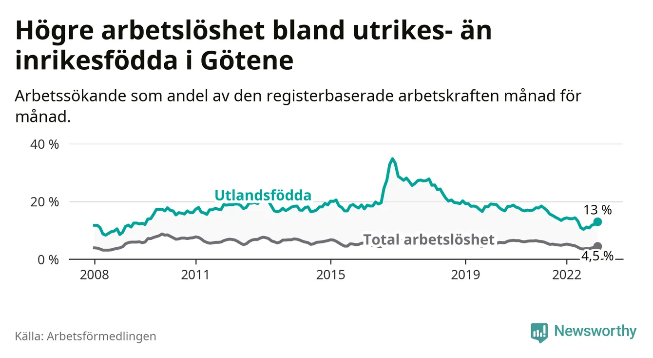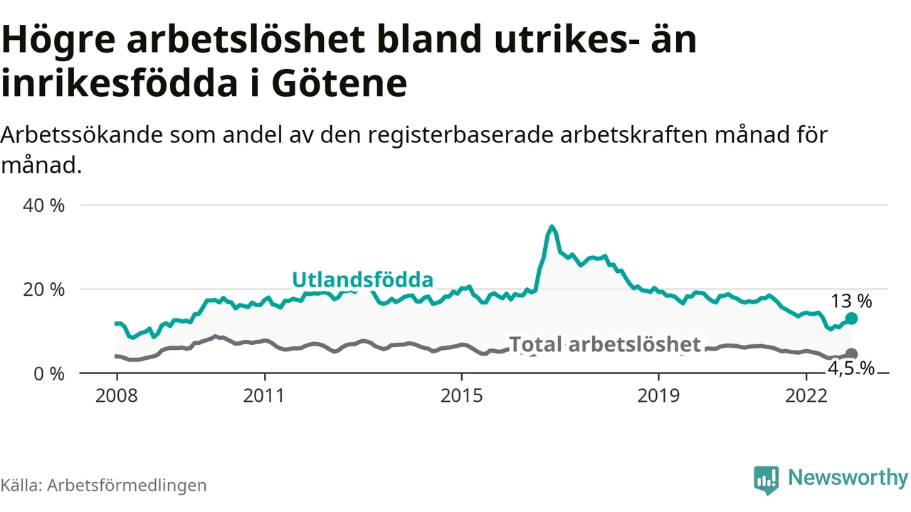 | Bland utlandsfödda | 13,0 % | −1,0 % ▼ | 15,0 % | −1,4 % ▼ | 16,6 % | −1,2 % ▼ |