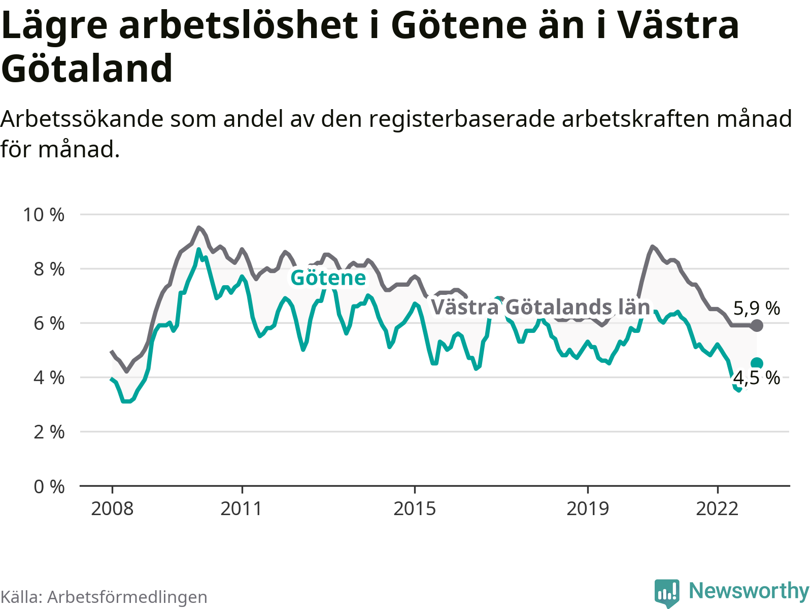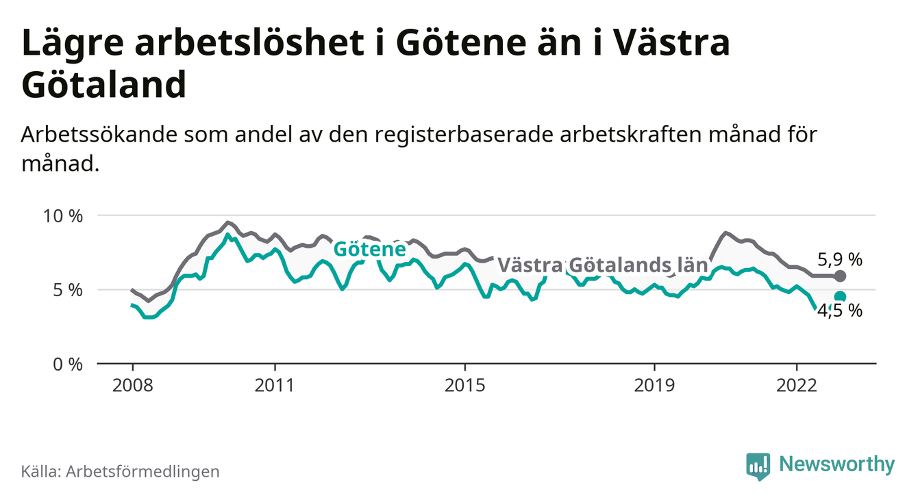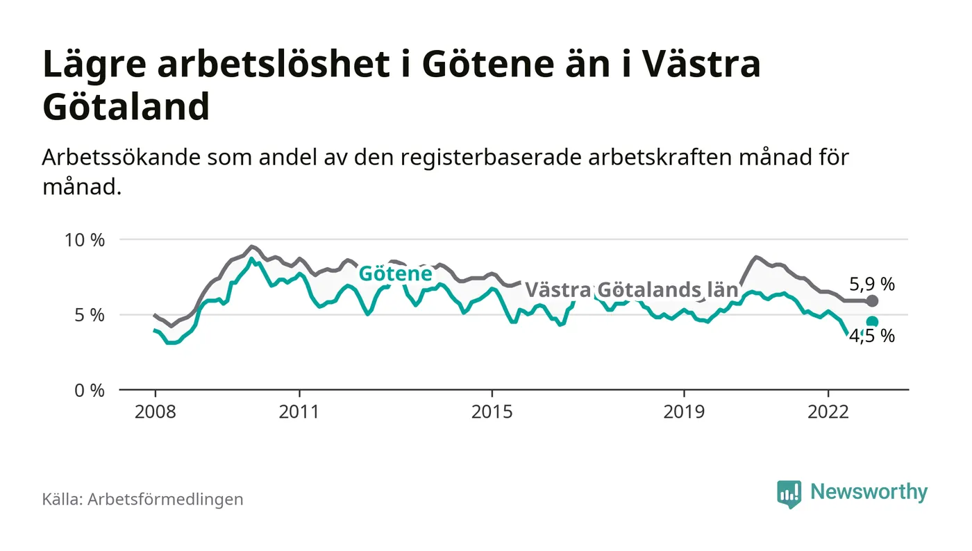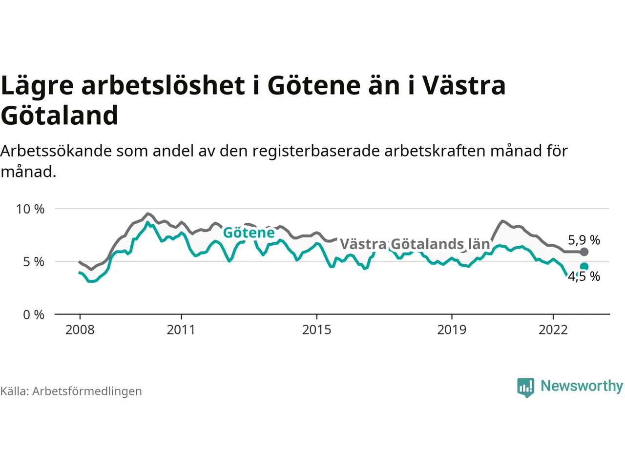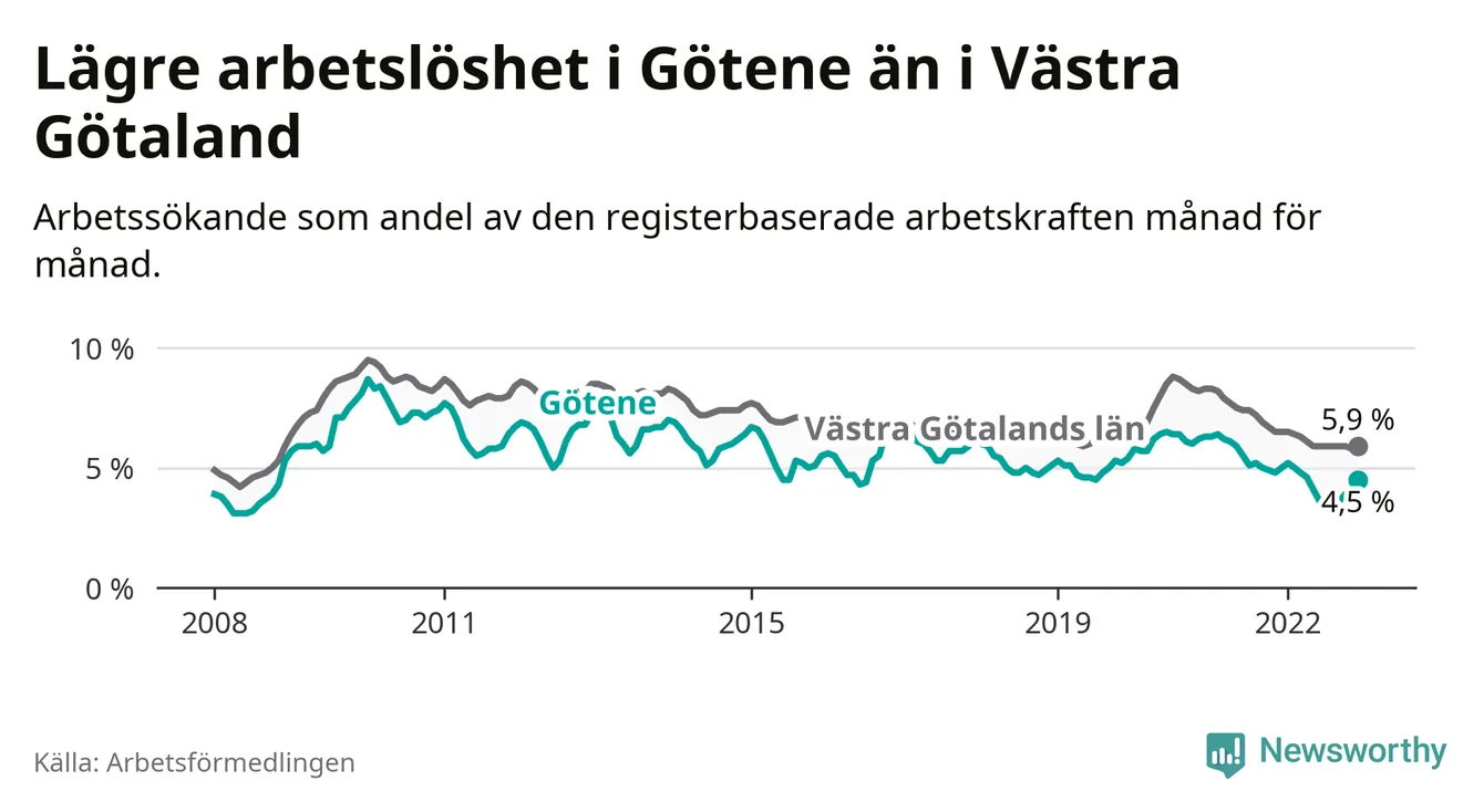 Götene hade redan tidigare lägre arbetslöshet än snittet i hela Västra Götalands län och nu växer klyftan (4,5 procent i kommunen, jämfört med 5,9 procent i hela länet). Tjörn och Öckerö har den lägsta arbetslösheten i länet (2,6 procent), medan Trollhättan har den högsta (9,1 procent). För att Götene skulle komma ner i samma arbetslöshetsnivå som Tjörn och Öckerö skulle 117 personer behöva sysselsättas.