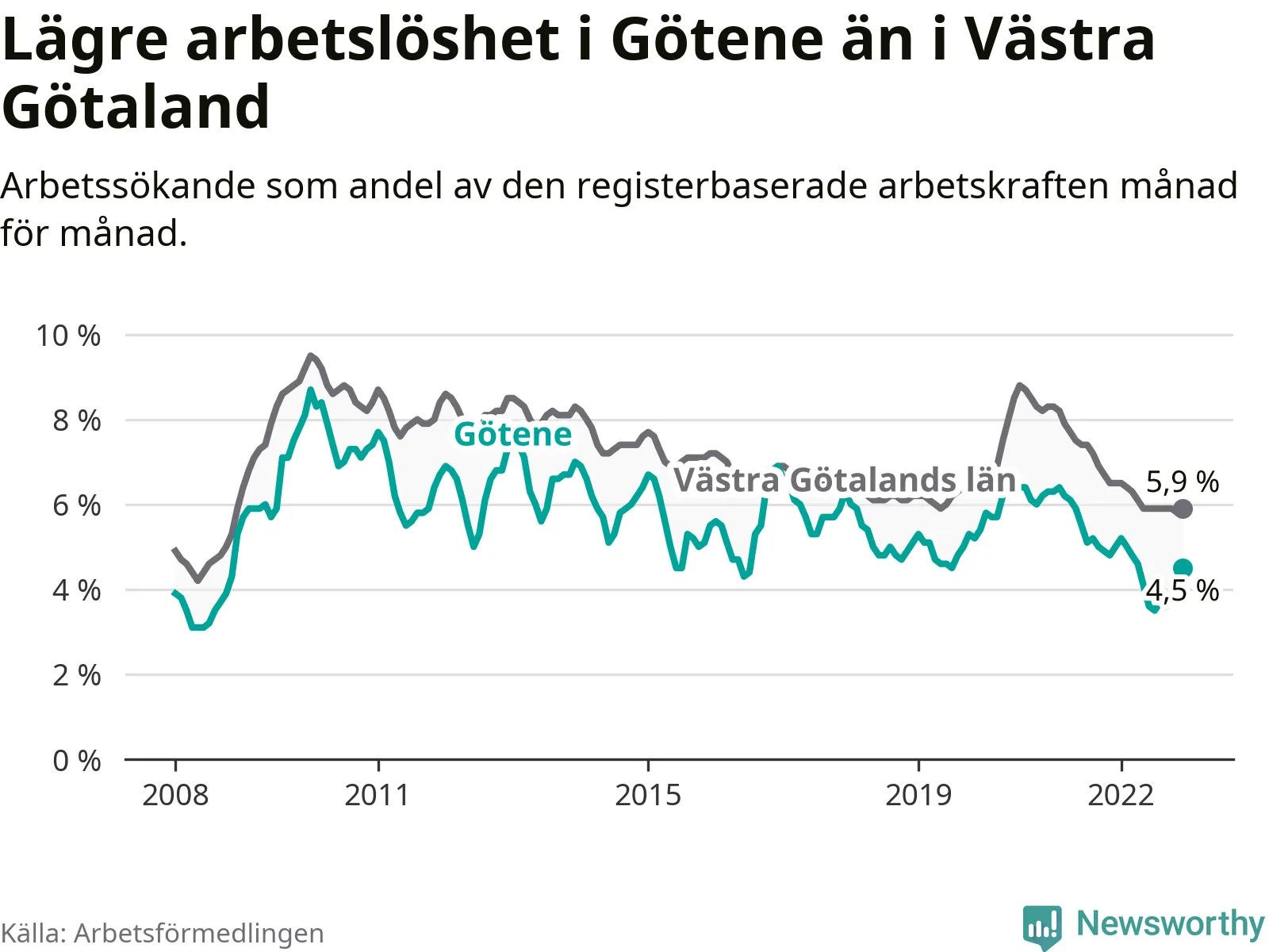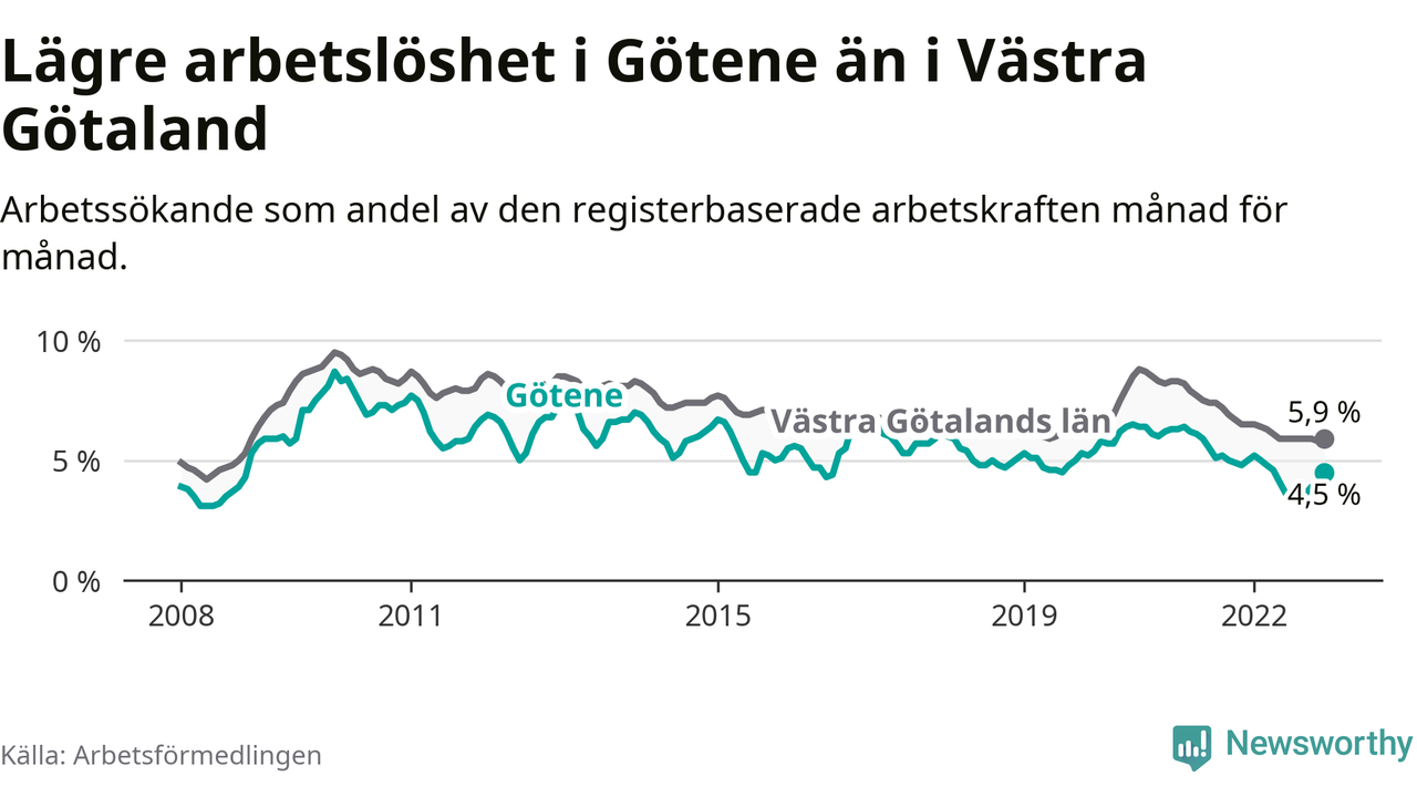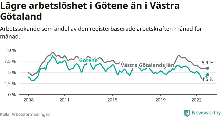 Under december månad rapporterade Götene kommun en total arbetslöshet på 4,5 procent. Det är en minskning jämfört med samma tidpunkt i fjol (−0,5 procentenheter). Även i Västra Götalands län sjunker arbetslösheten .