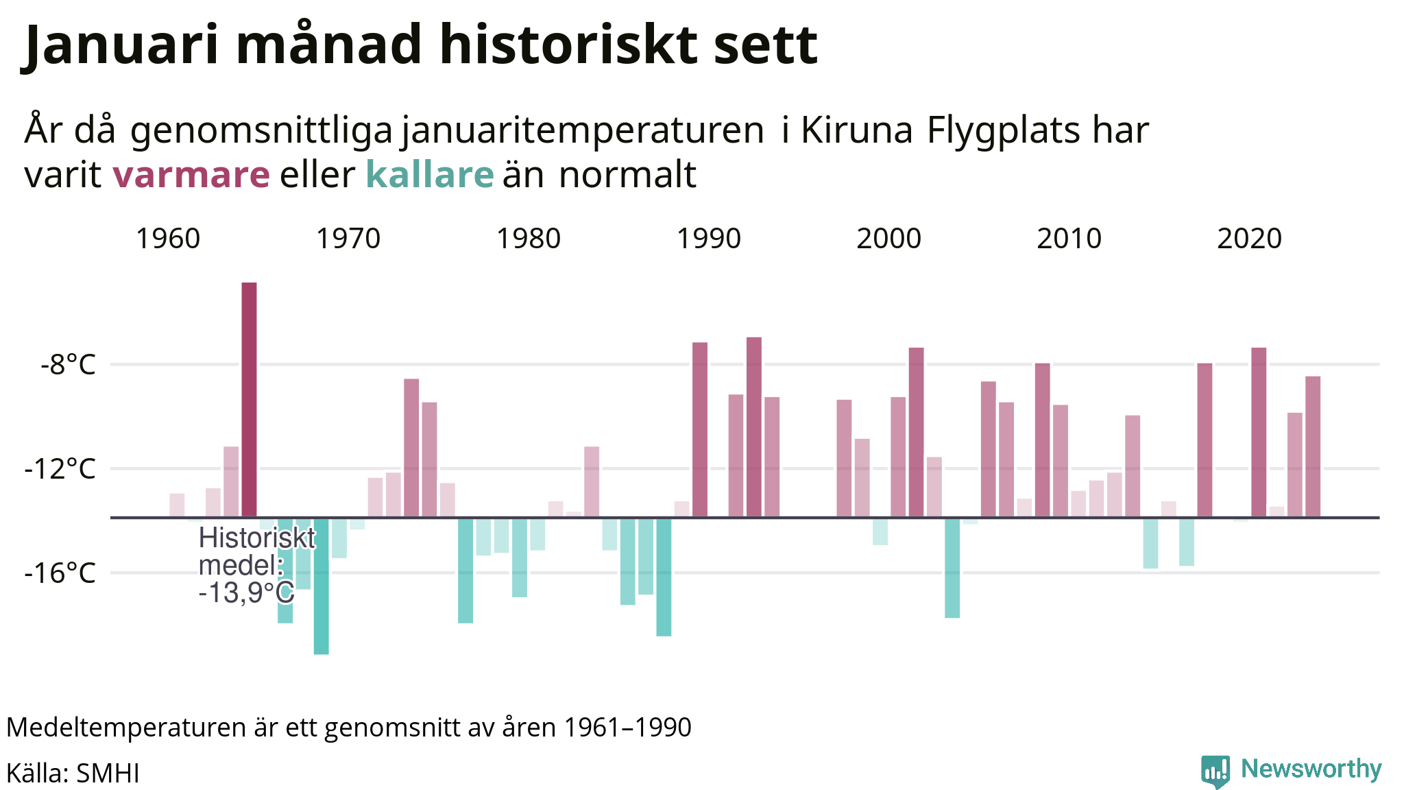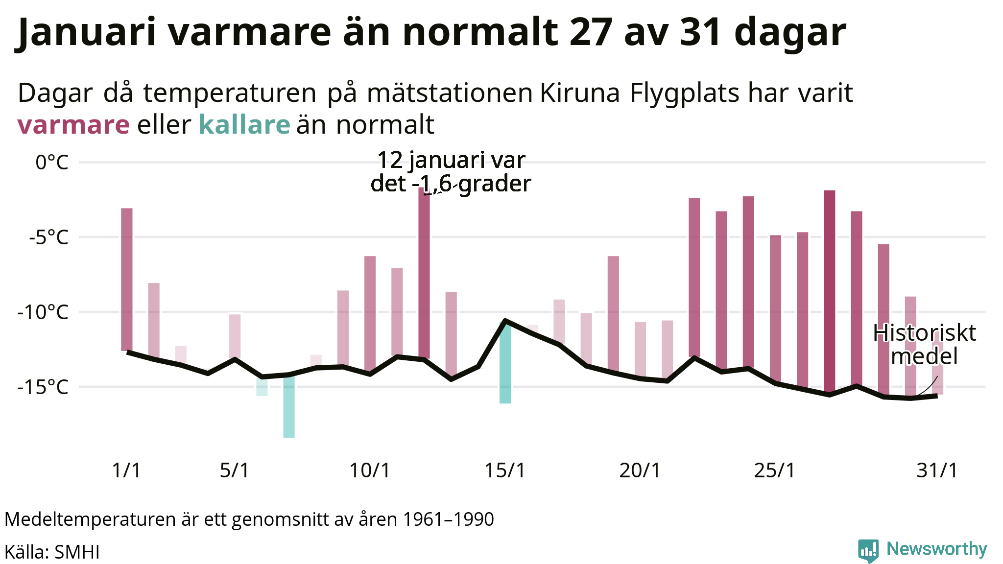 Januari var betydligt mildare än normalt i Kiruna kommun. Under 27 av 31 dagar låg dygnsmedeltemperaturen över det historiska snittet.