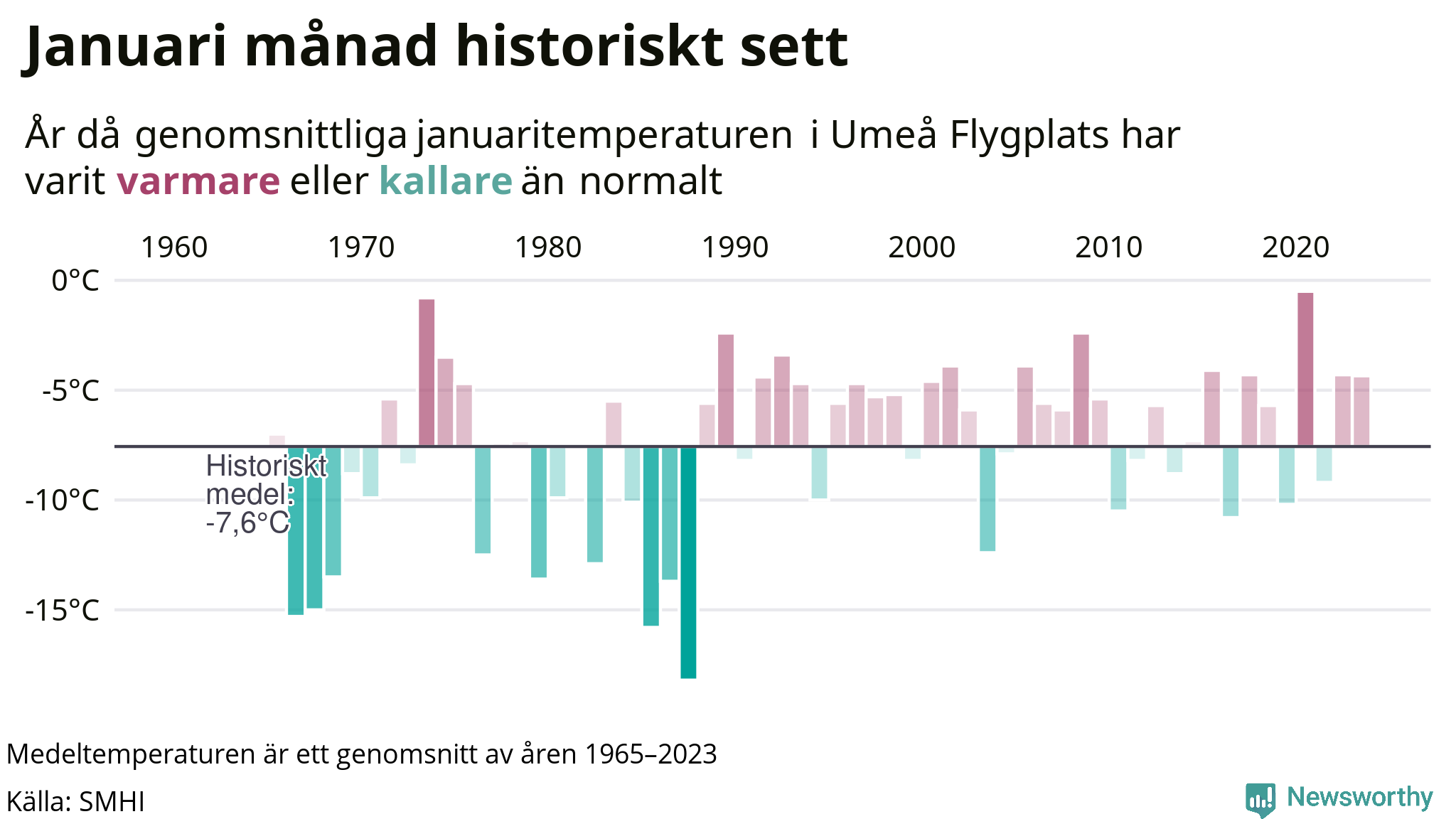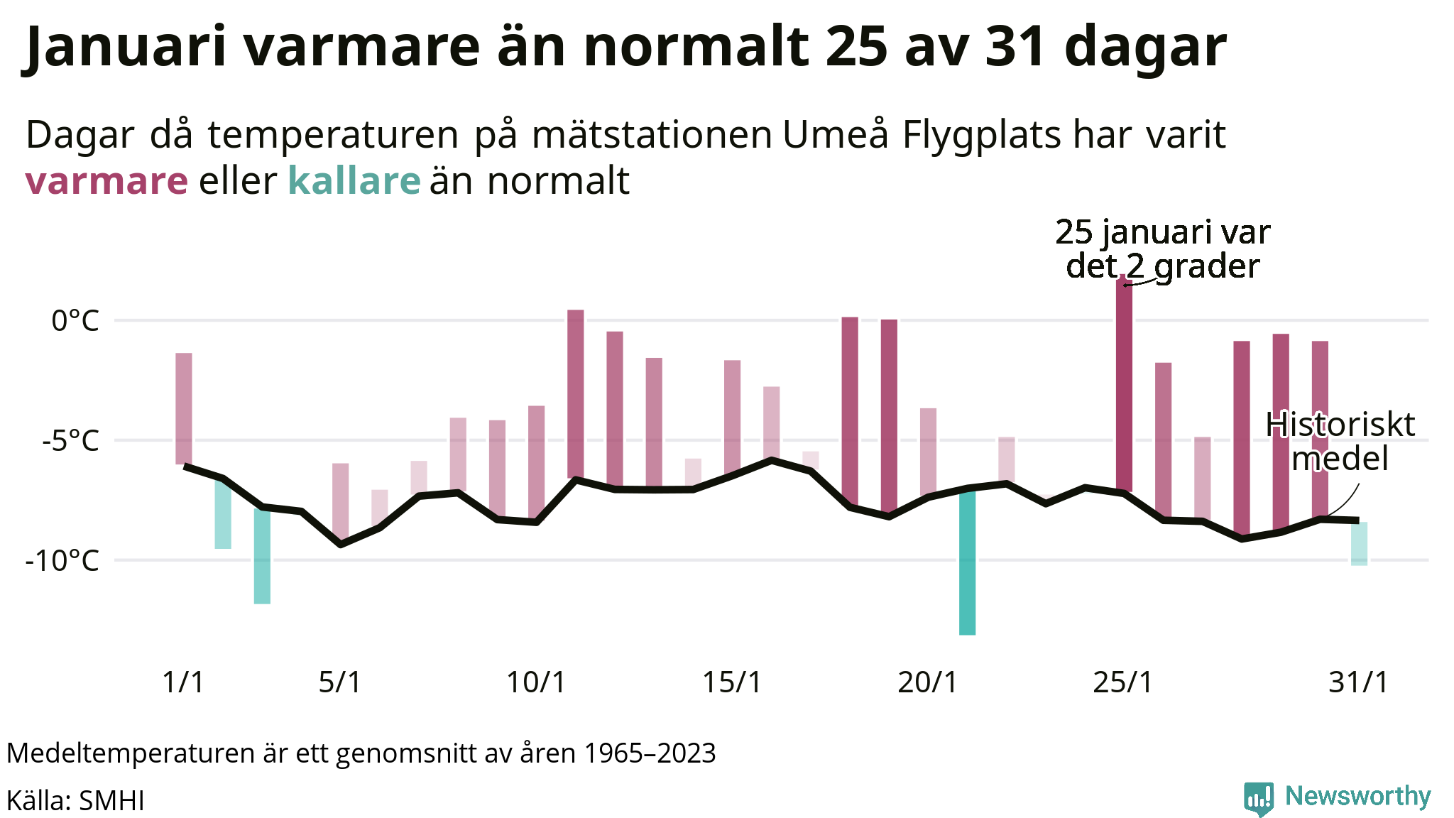 Januari var betydligt mildare än normalt i Umeå kommun. Under 25 av 31 dagar låg dygnsmedeltemperaturen över det historiska snittet.