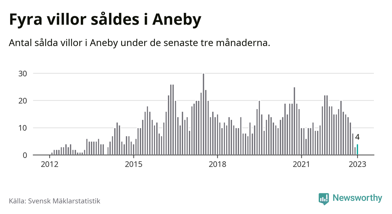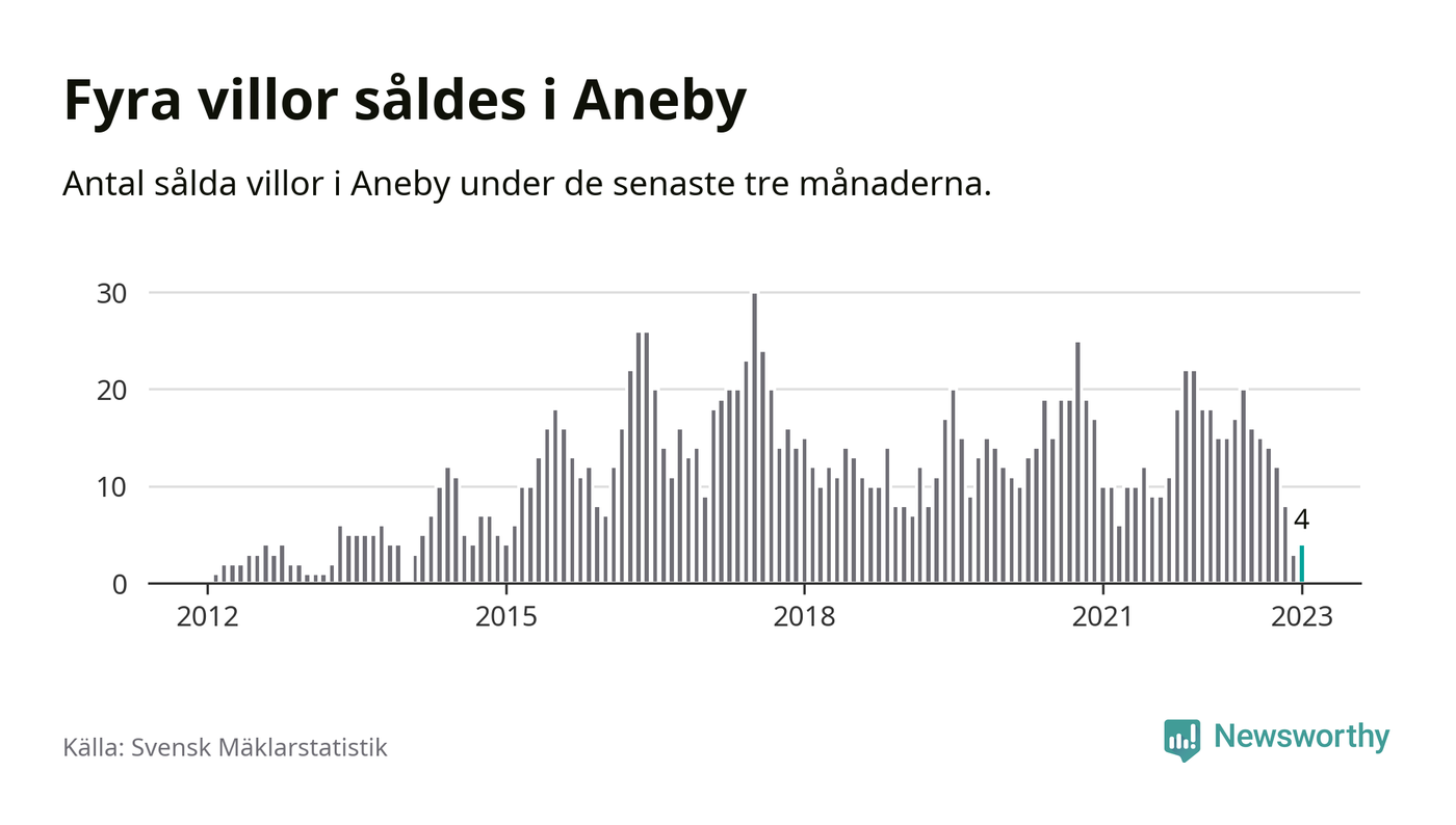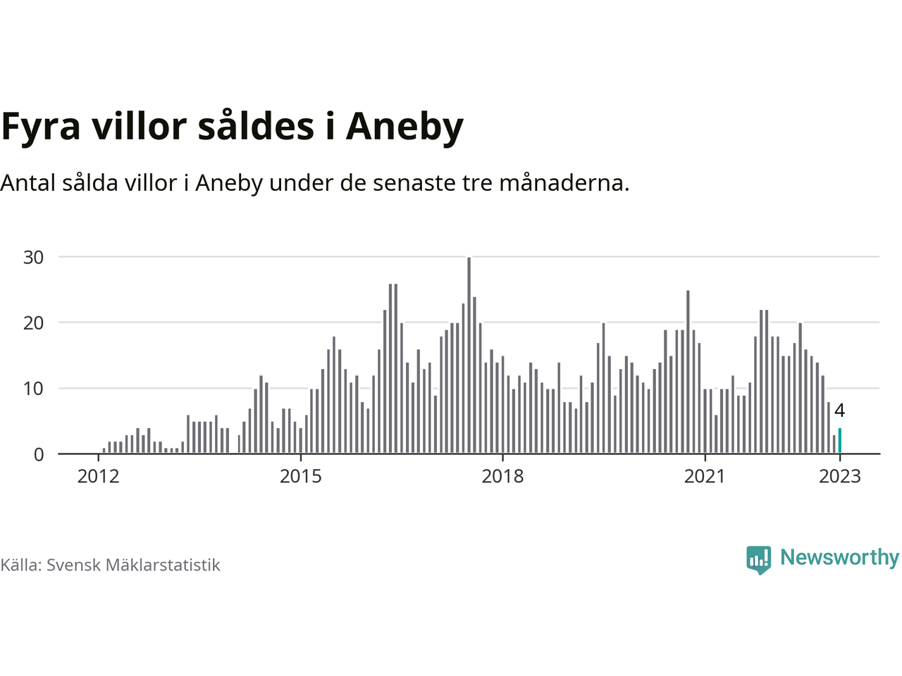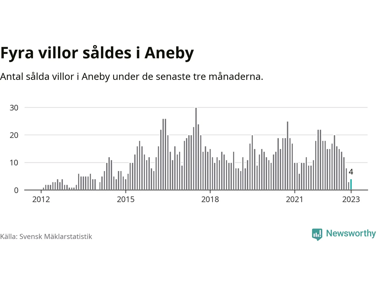 Mellan november och januari gjordes sammanlagt fyra affärer med villor i Aneby kommun. Det kan jämföras med 18 vid motsvarande tid i fjol.