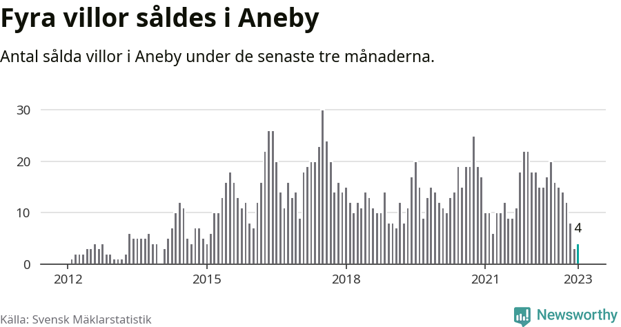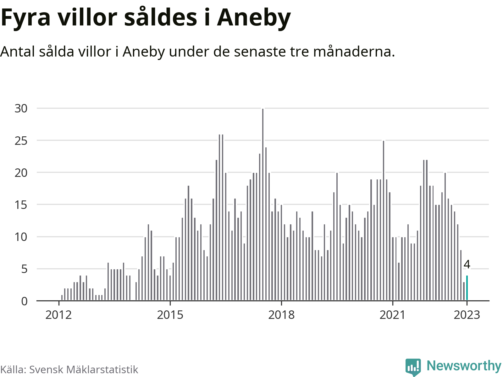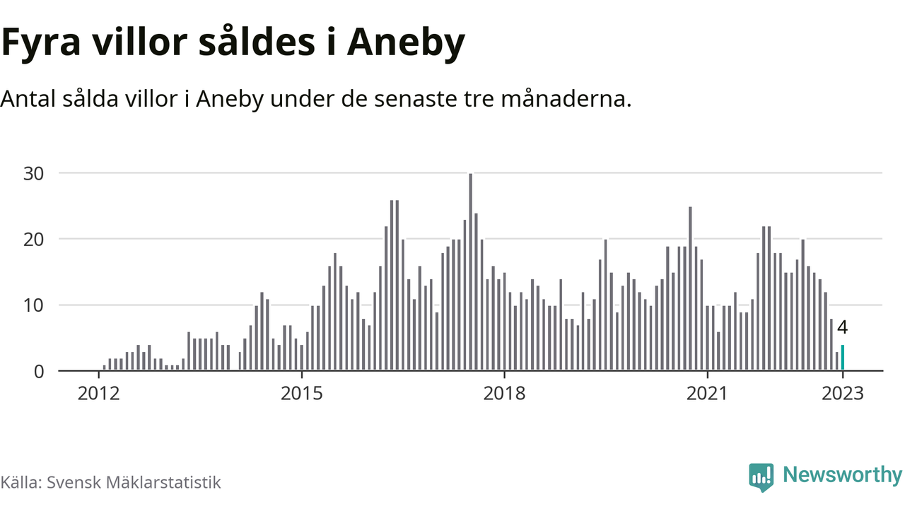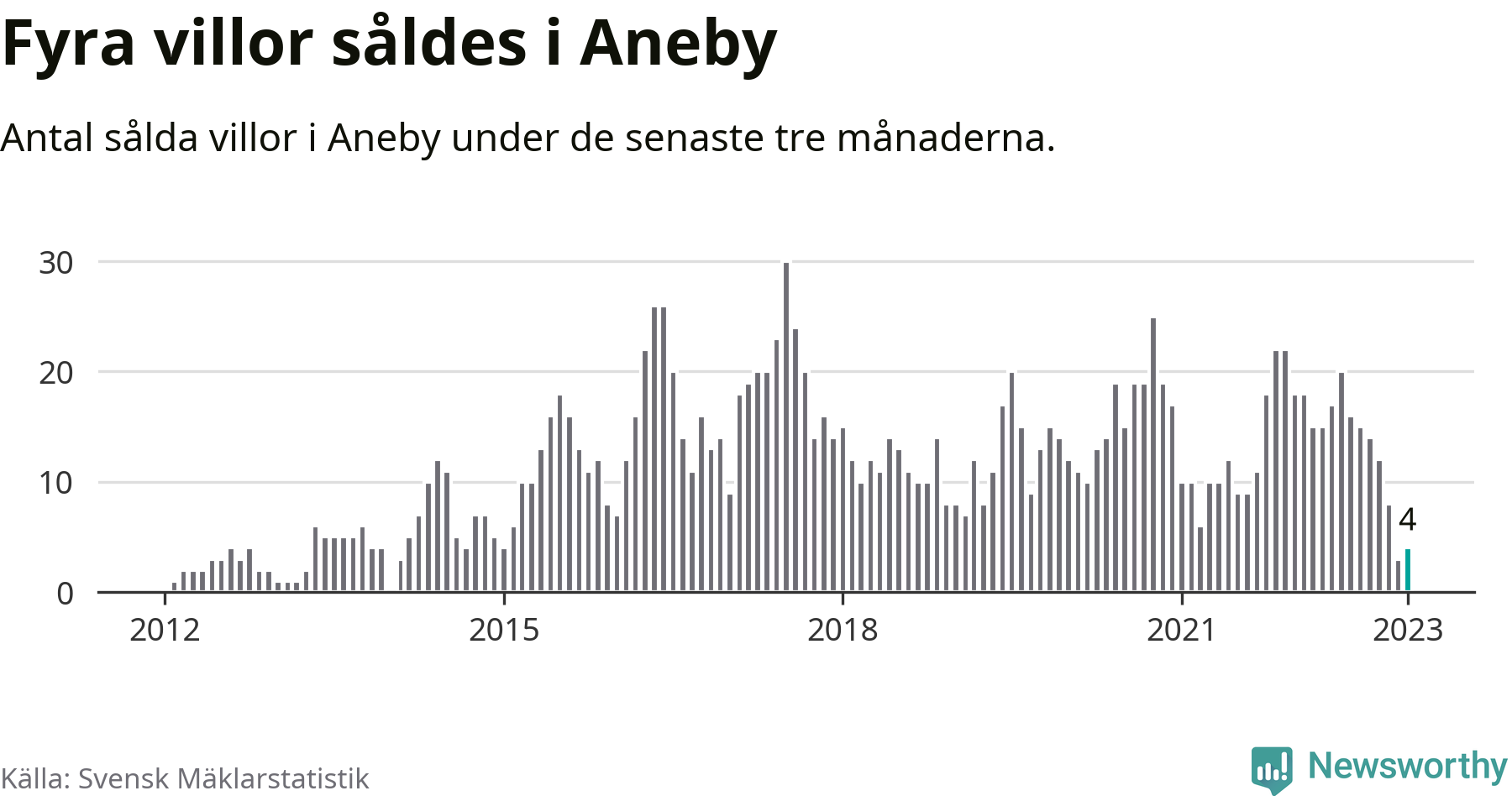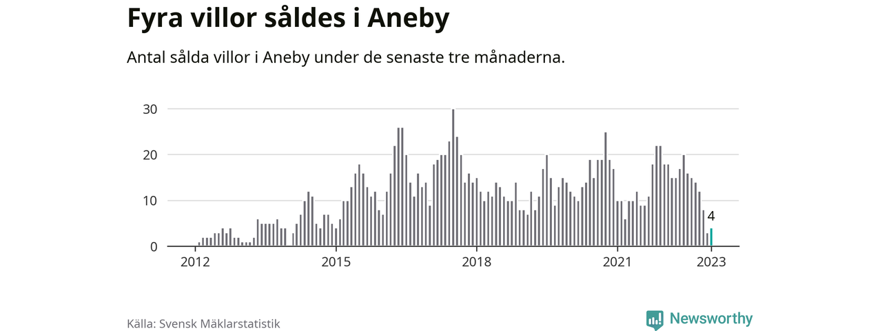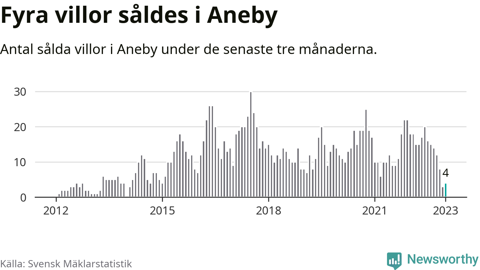 Mellan november och januari gjordes sammanlagt fyra affärer med villor i Aneby kommun. Det kan jämföras med 18 vid motsvarande tid i fjol.