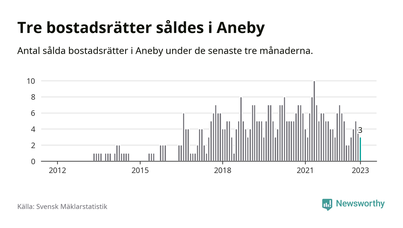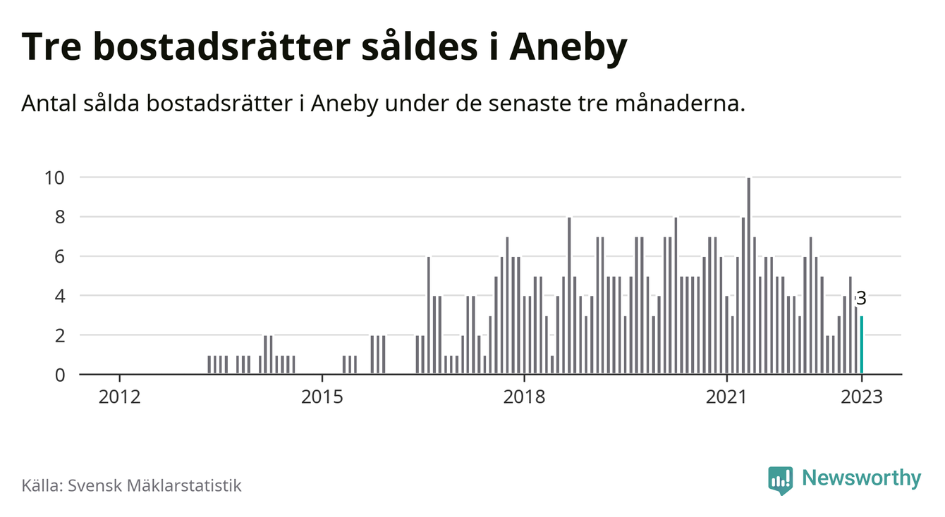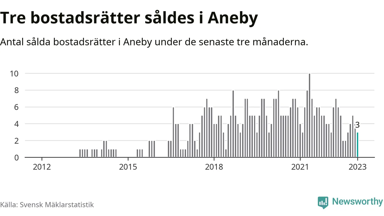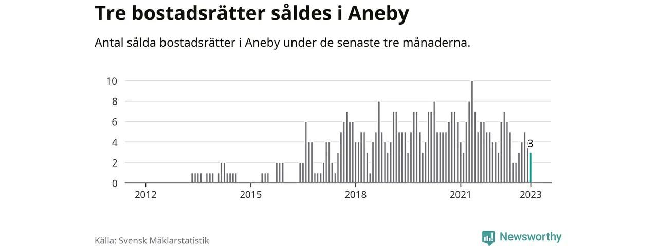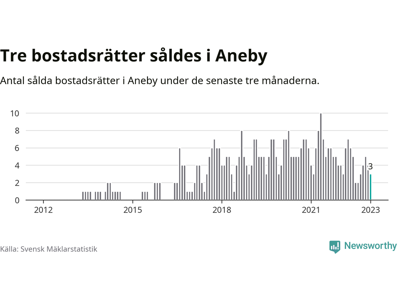 Mellan november och januari gjordes sammanlagt tre affärer med bostadsrätter i Aneby kommun. Det kan jämföras med fyra vid motsvarande tid i fjol.