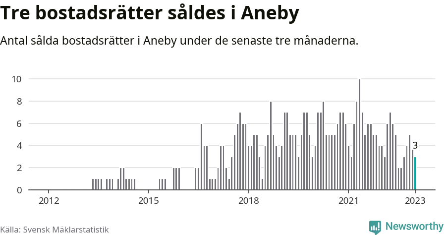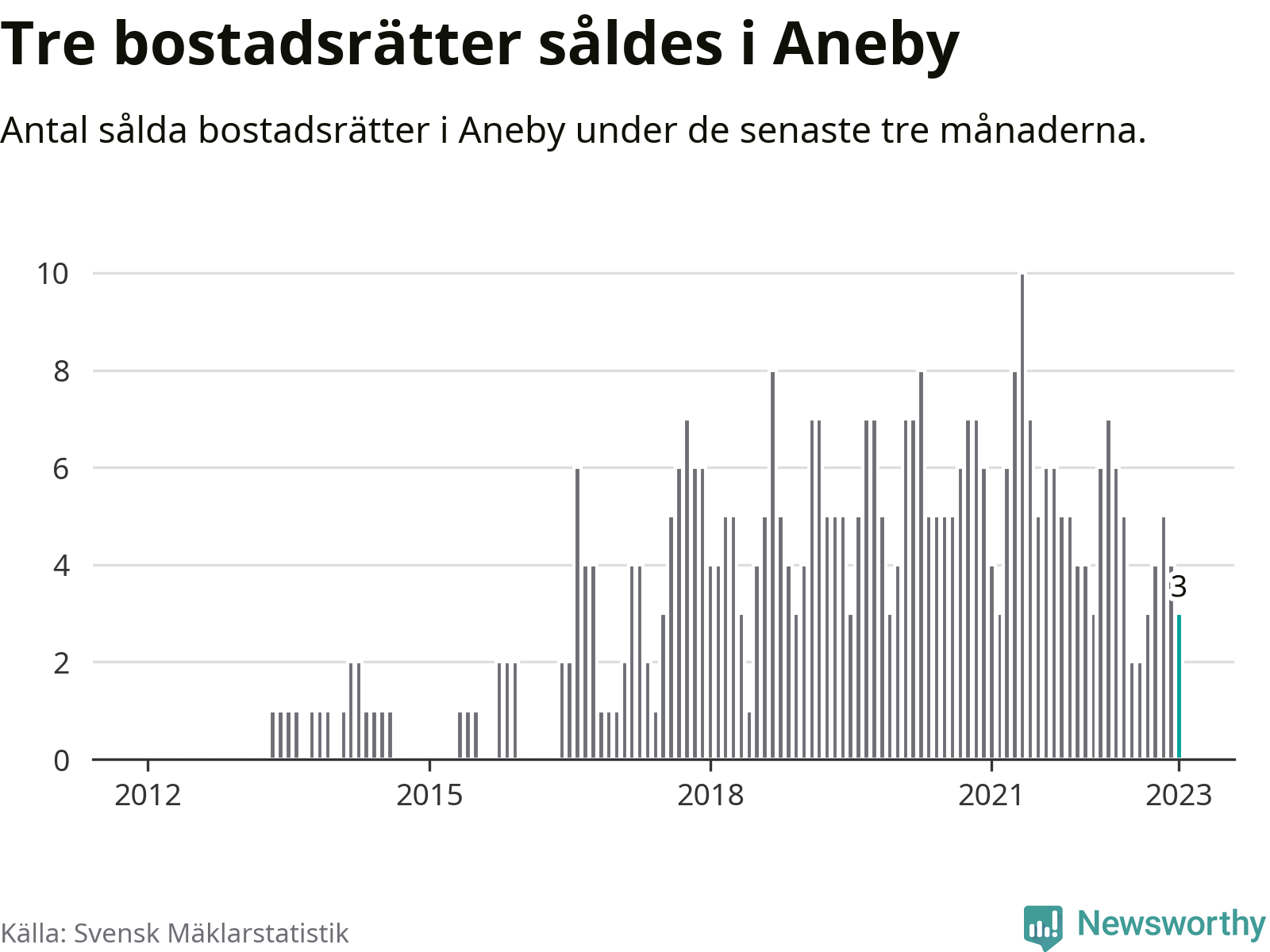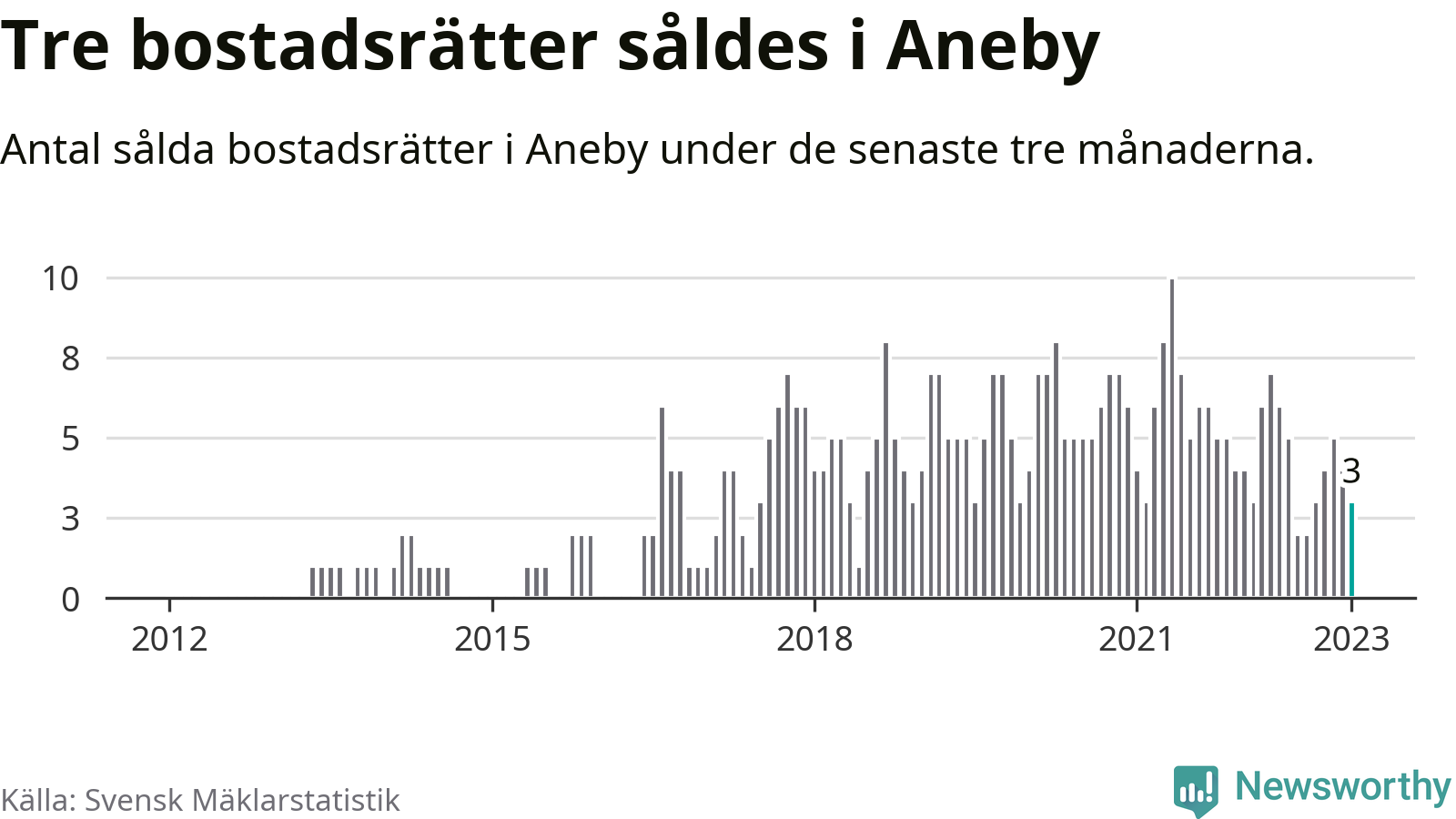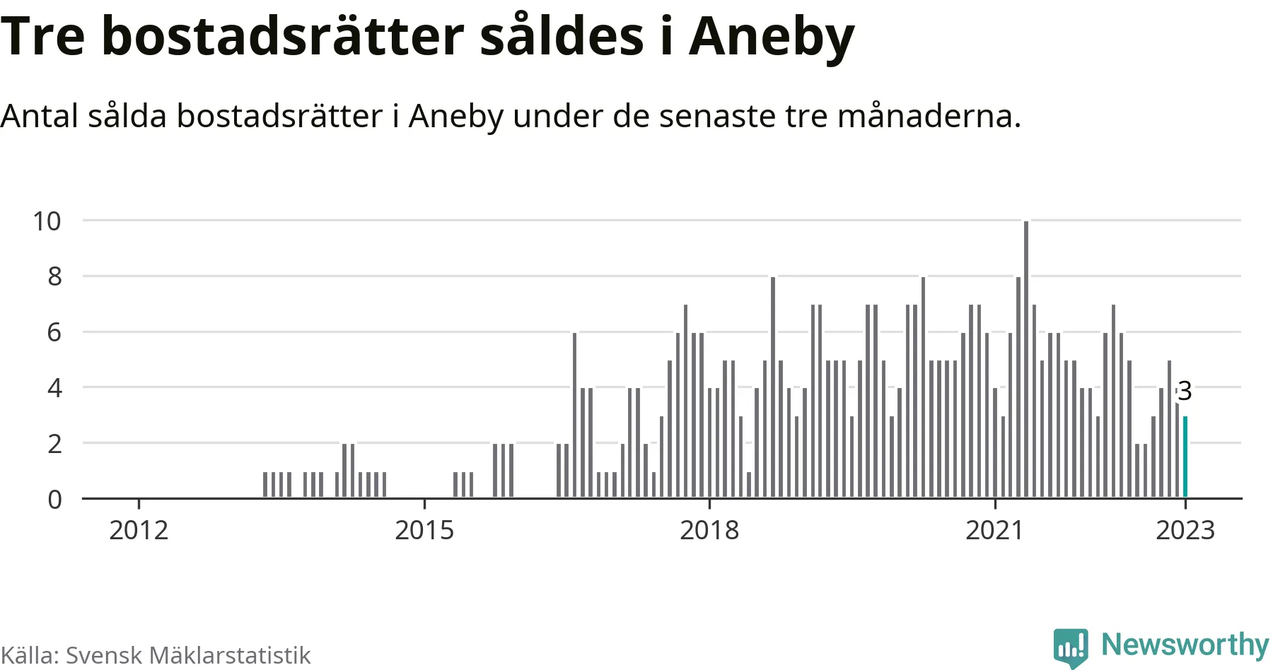 Mellan november och januari gjordes sammanlagt tre affärer med bostadsrätter i Aneby kommun. Det kan jämföras med fyra vid motsvarande tid i fjol.