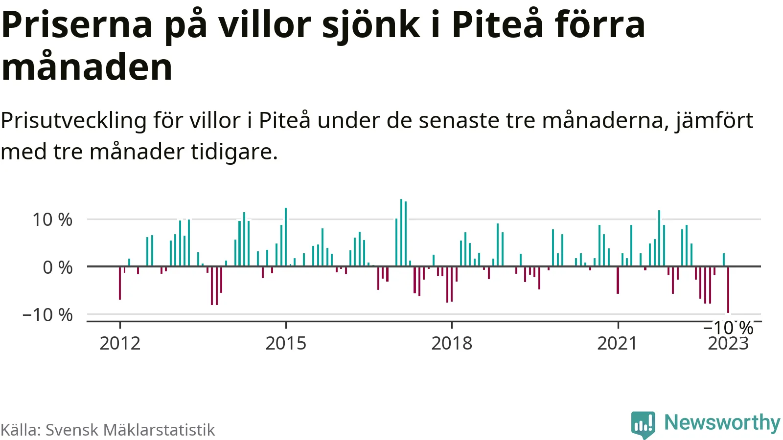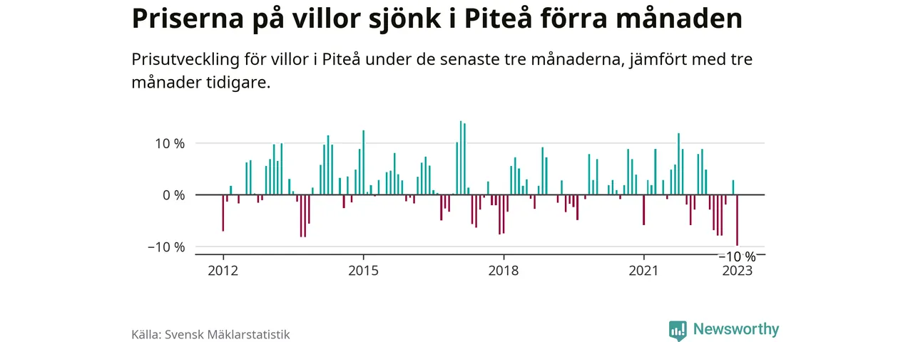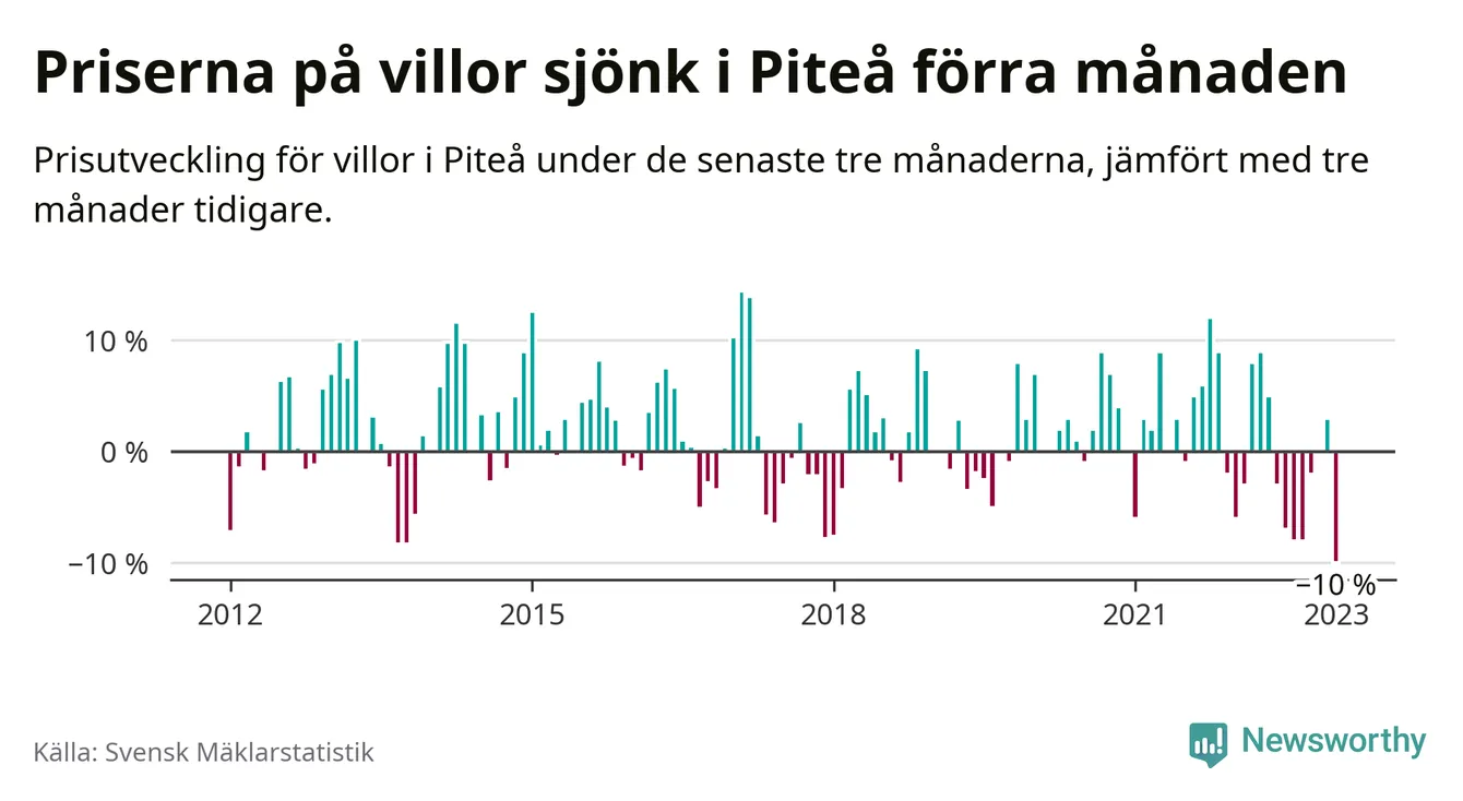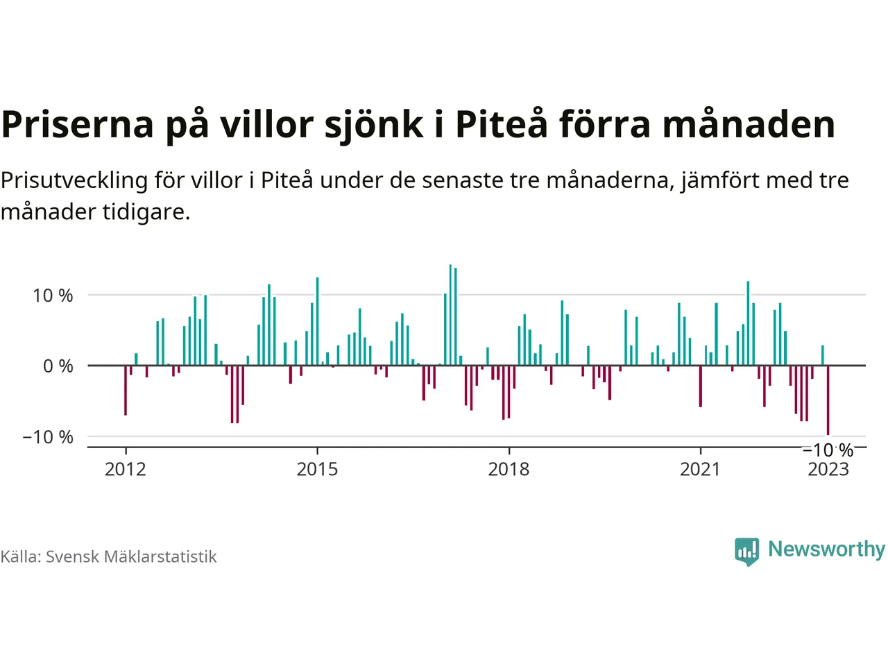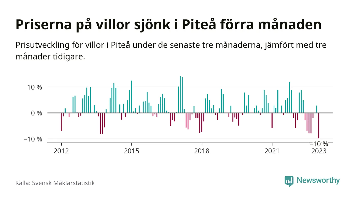 Villapriserna sjönk med 10 procent i Piteå kommun under de senaste tre månaderna. Det är den svagaste prisutvecklingen sedan 2012.