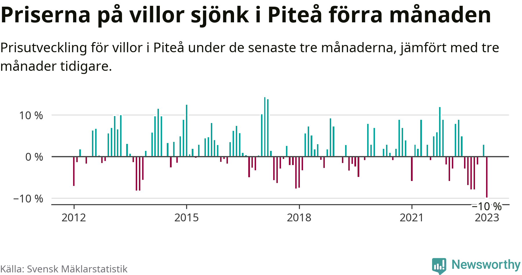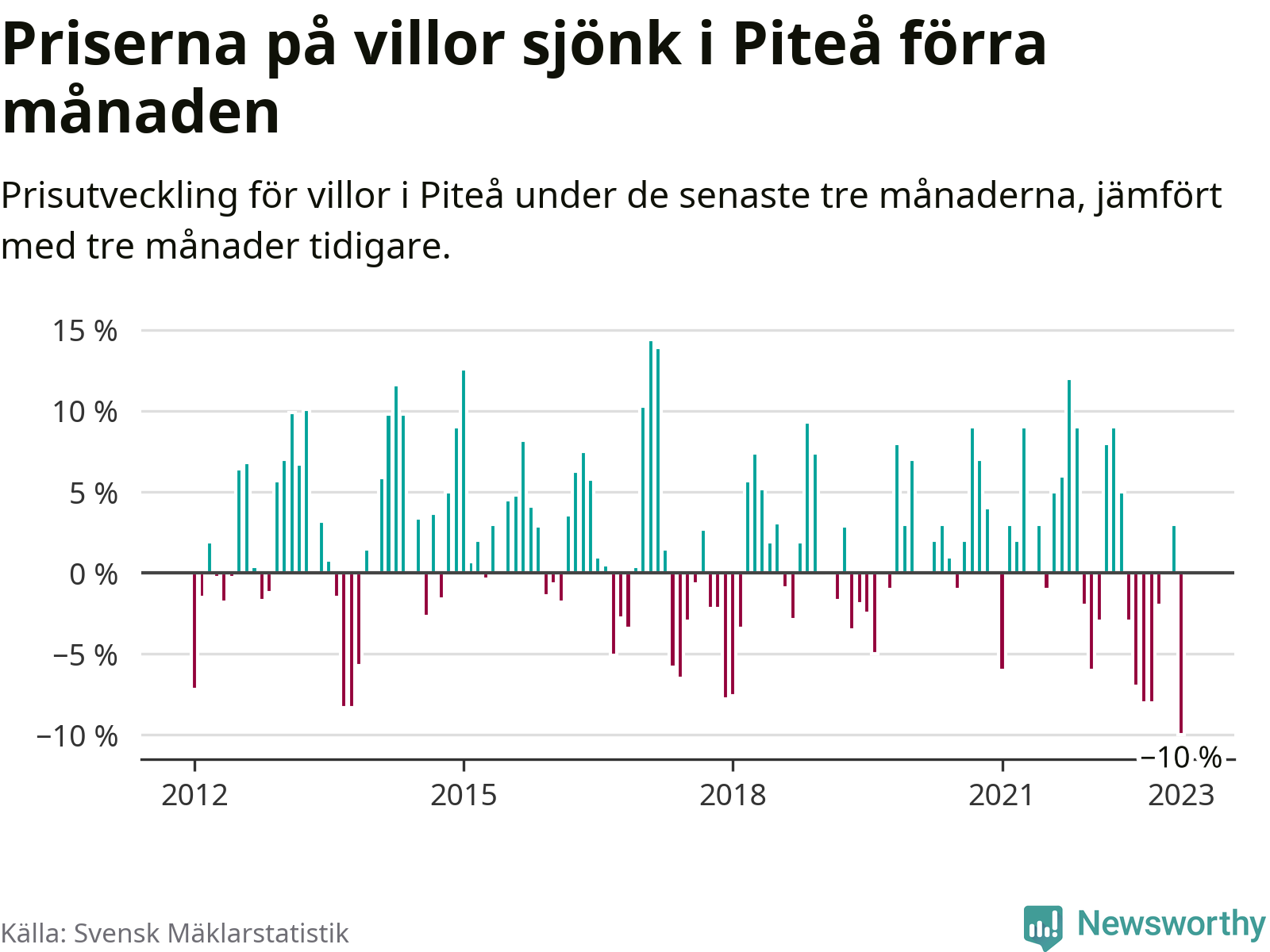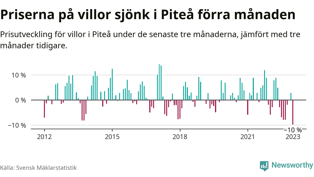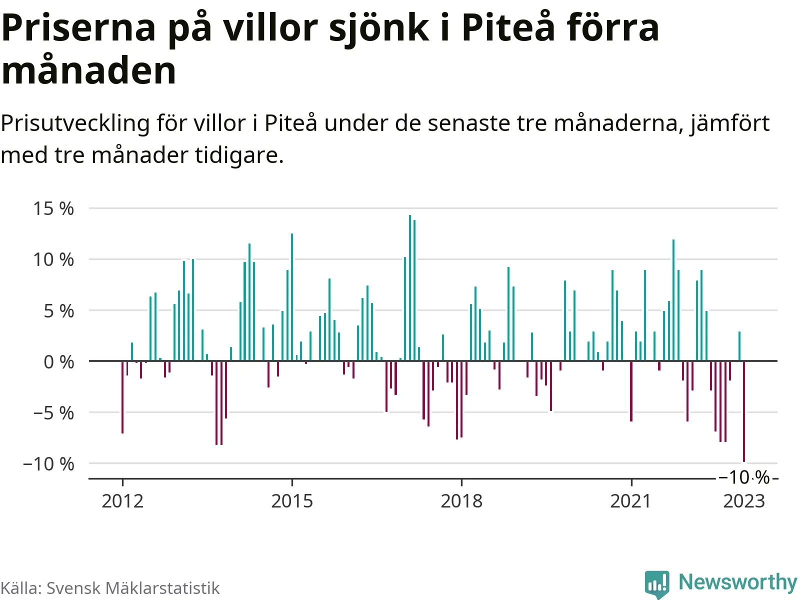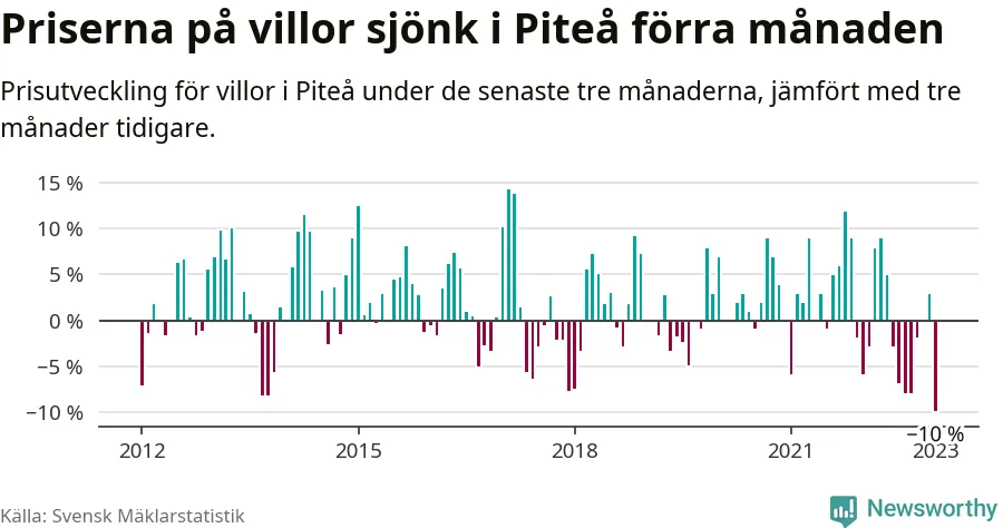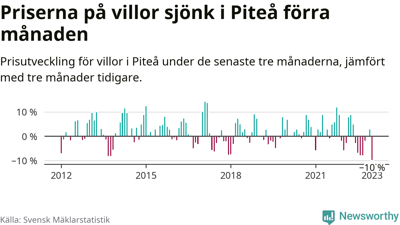 Villapriserna sjönk med 10 procent i Piteå kommun under de senaste tre månaderna. Det är den svagaste prisutvecklingen sedan 2012.