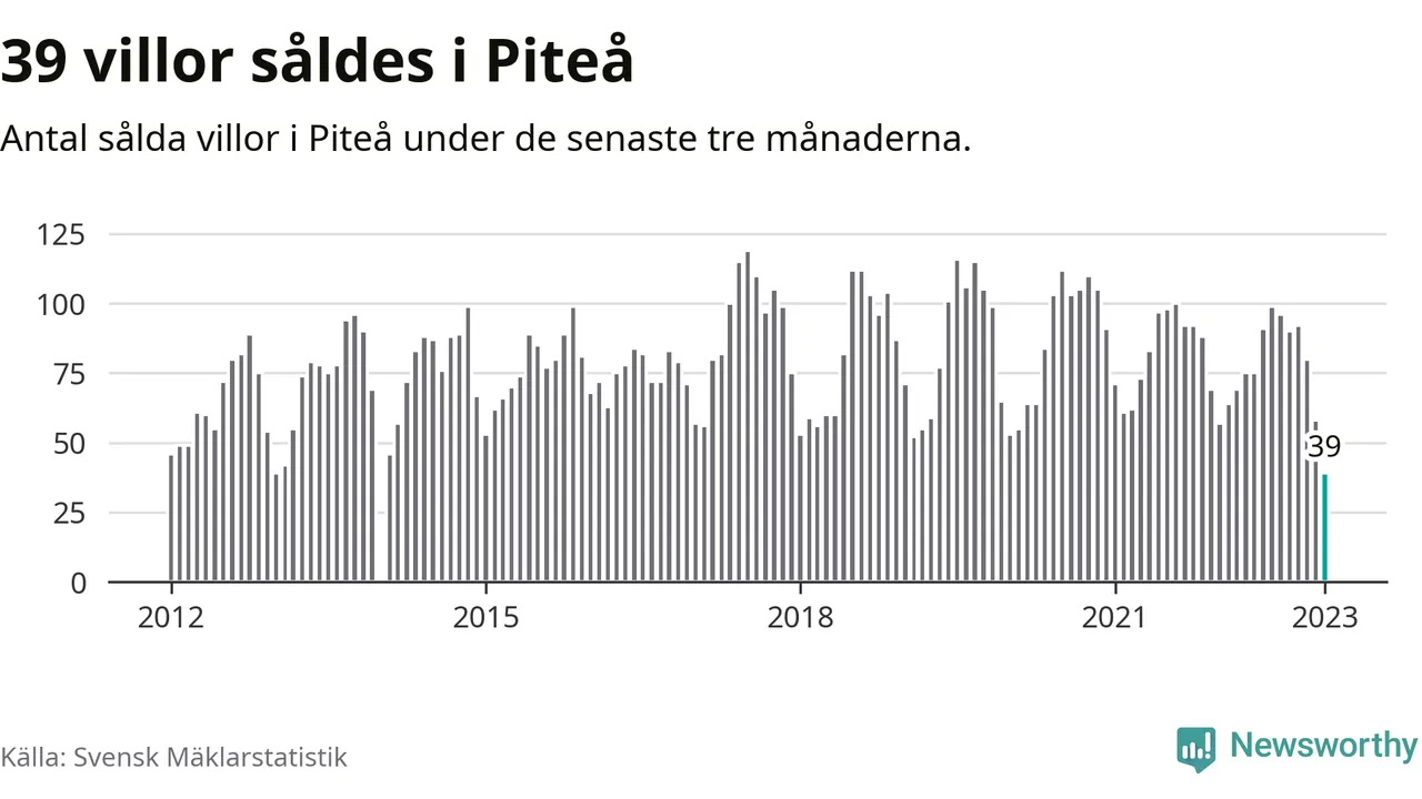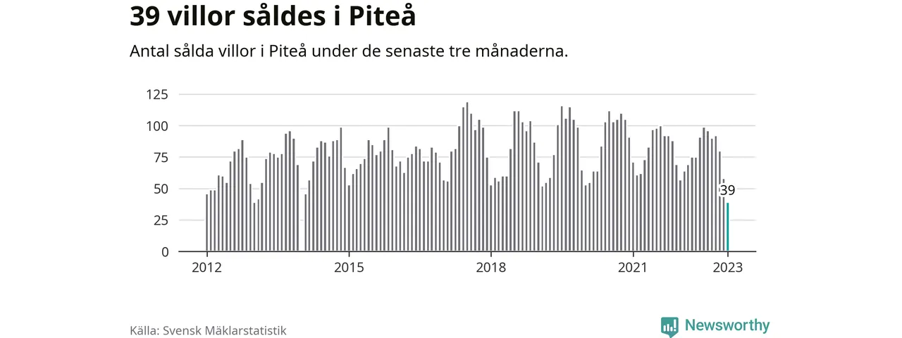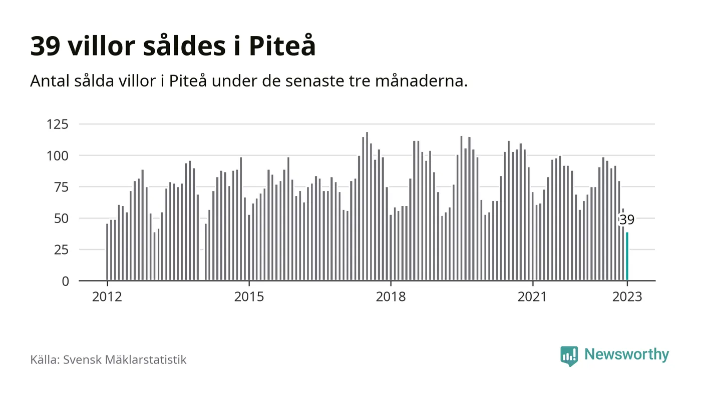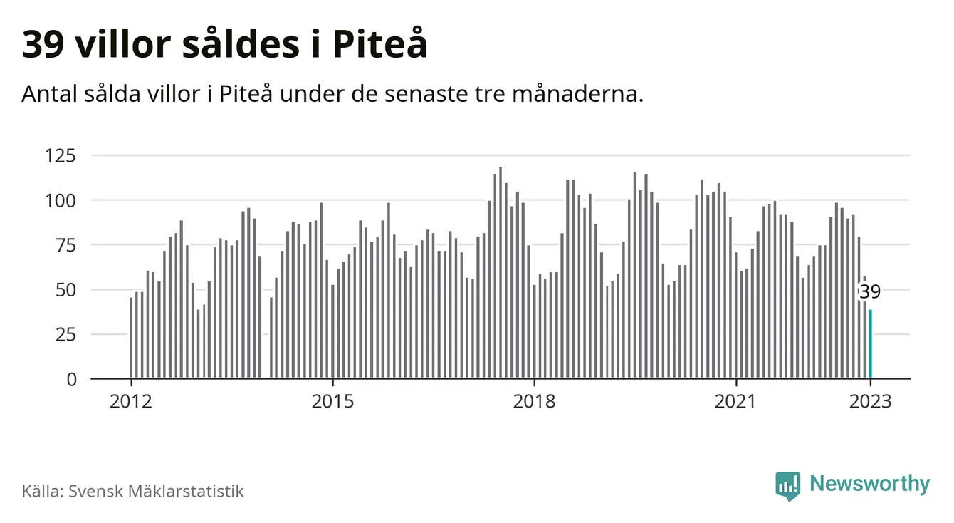 Sammanlagt såldes 39 villor i Piteå kommun mellan november och januari till ett genomsnittligt pris på 1,9 miljoner kronor. Det är fler försäljningar än på tio år. I fjol gjordes 57 affärer vid den här tiden på året.