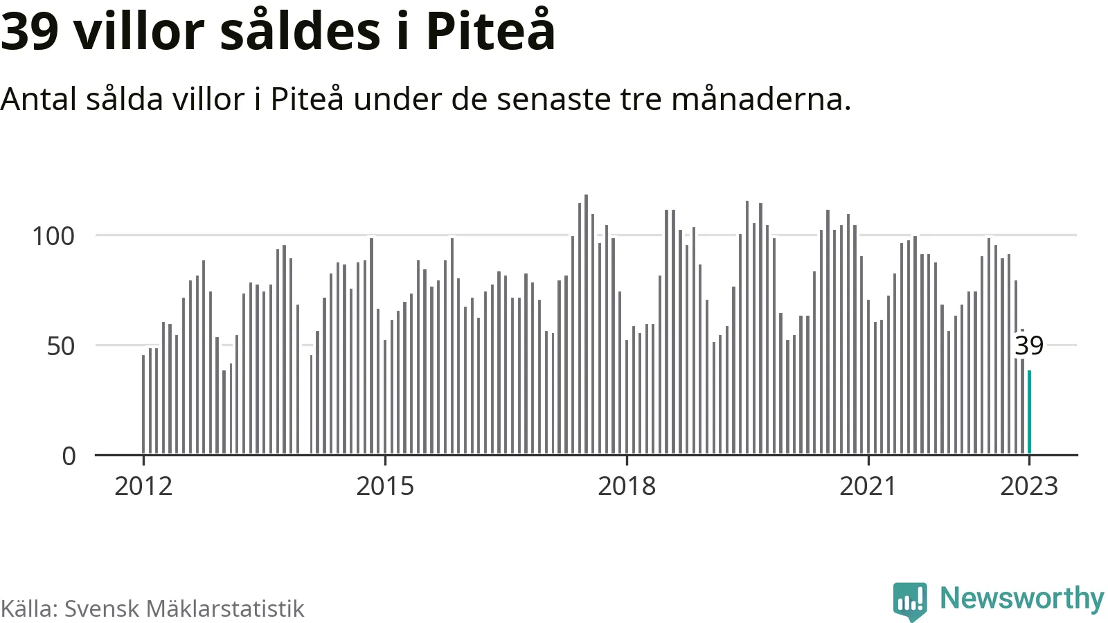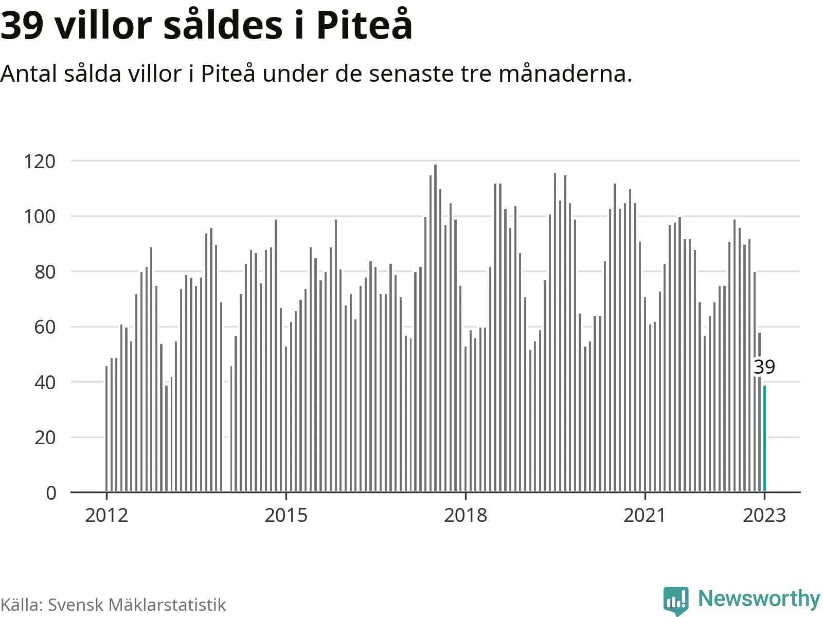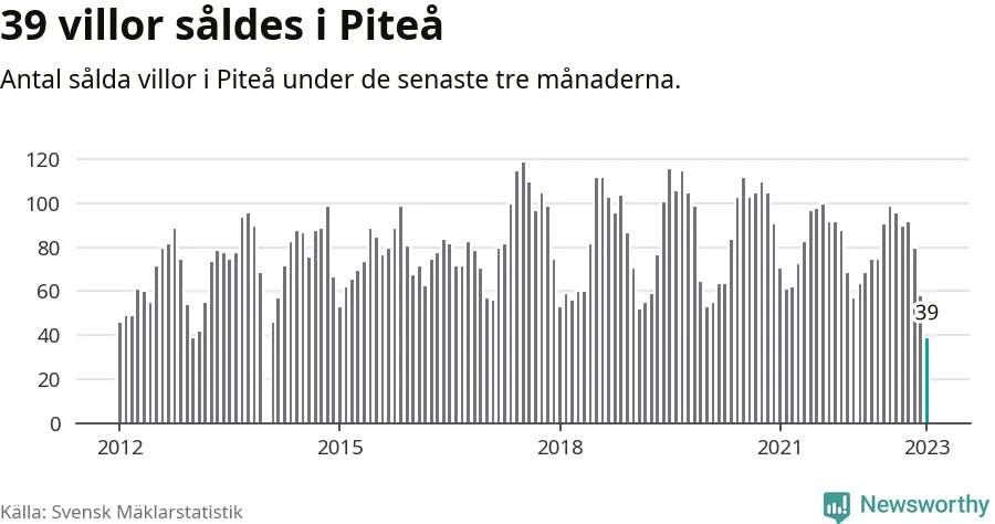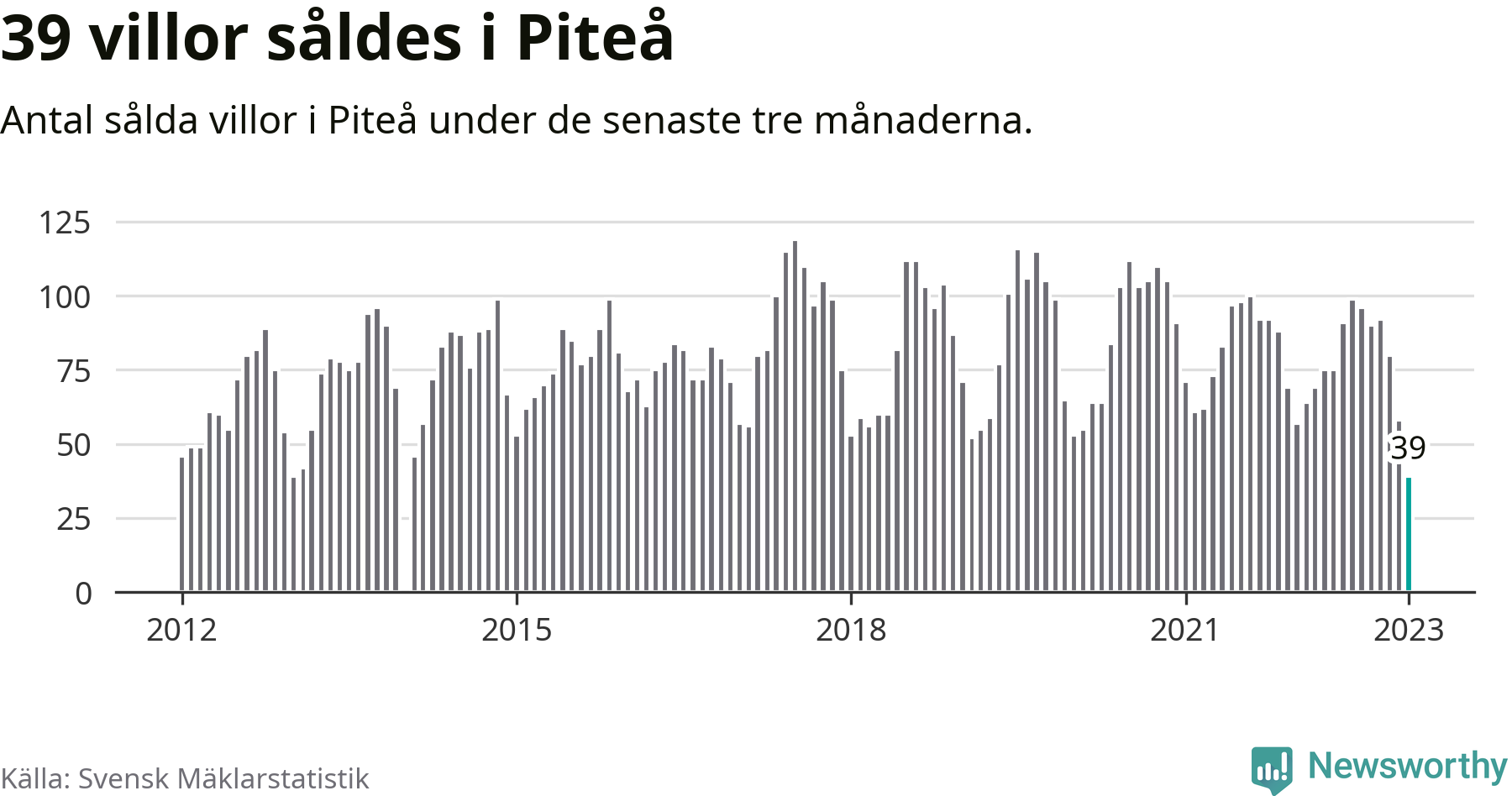 Sammanlagt såldes 39 villor i Piteå kommun mellan november och januari till ett genomsnittligt pris på 1,9 miljoner kronor. Det är fler försäljningar än på tio år. I fjol gjordes 57 affärer vid den här tiden på året.