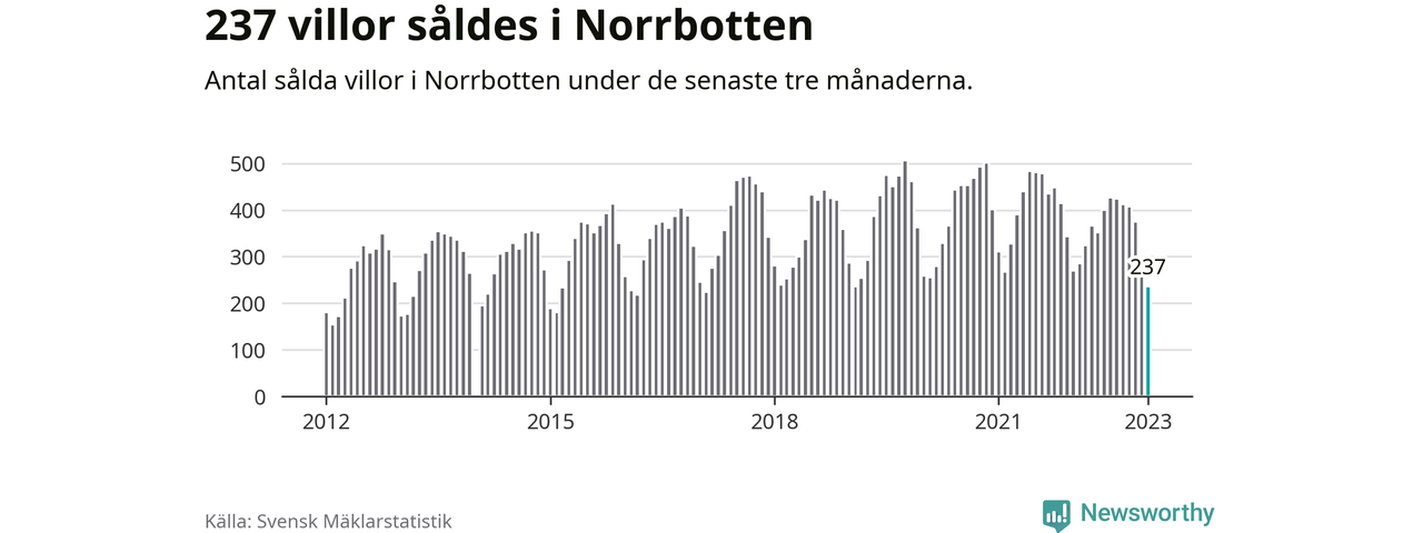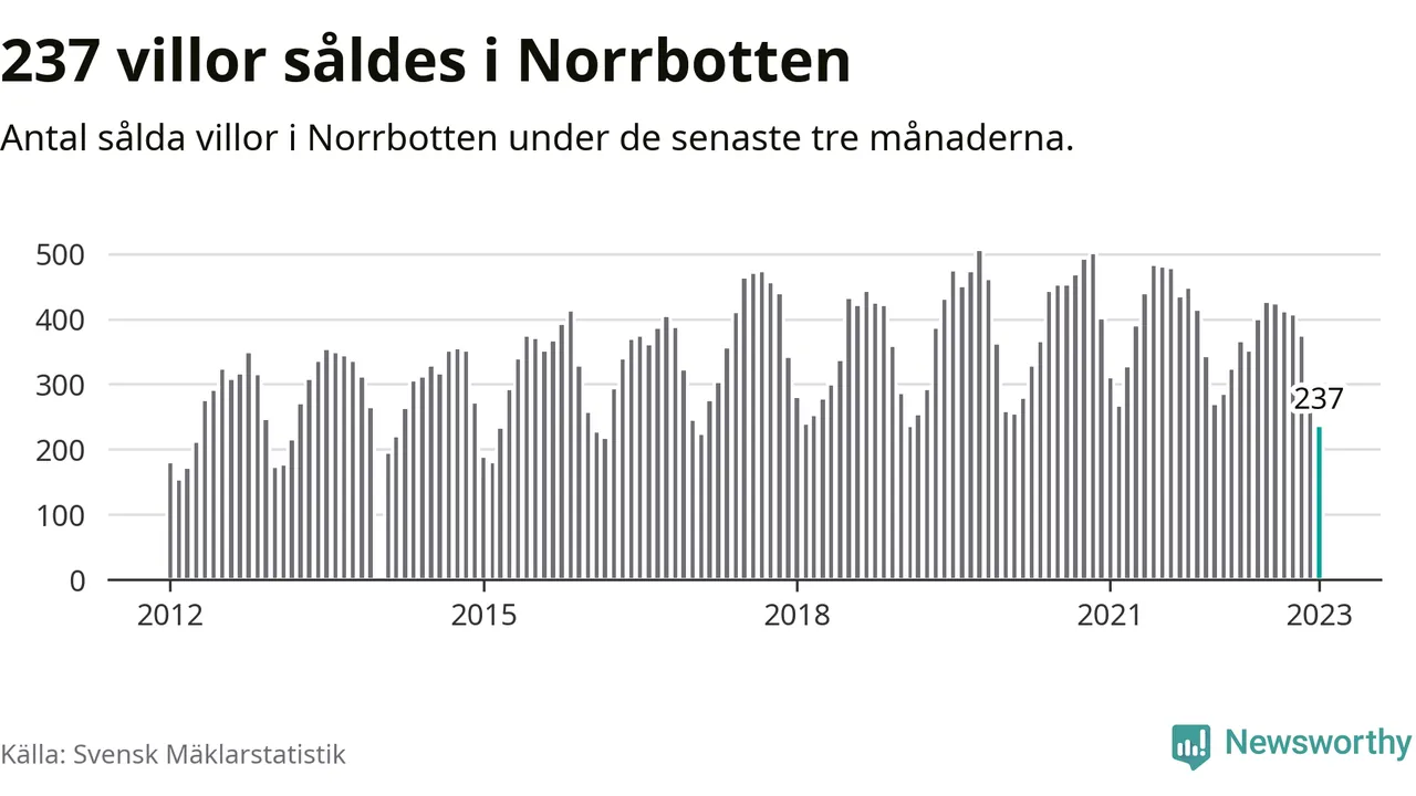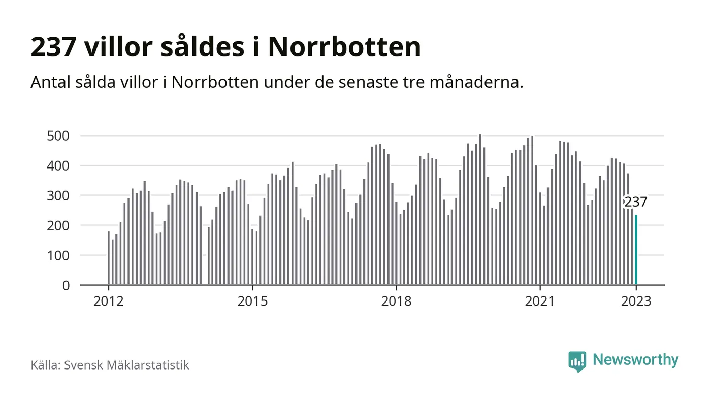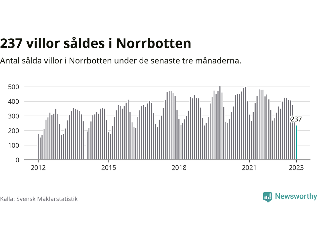 Mellan november och januari såldes 237 villor i Norrbottens län. Det är färre än någon tremånadersperiod sedan 2019.