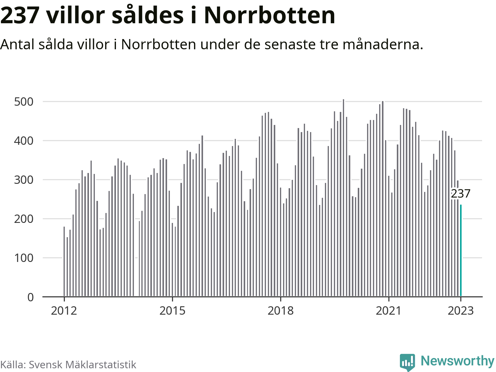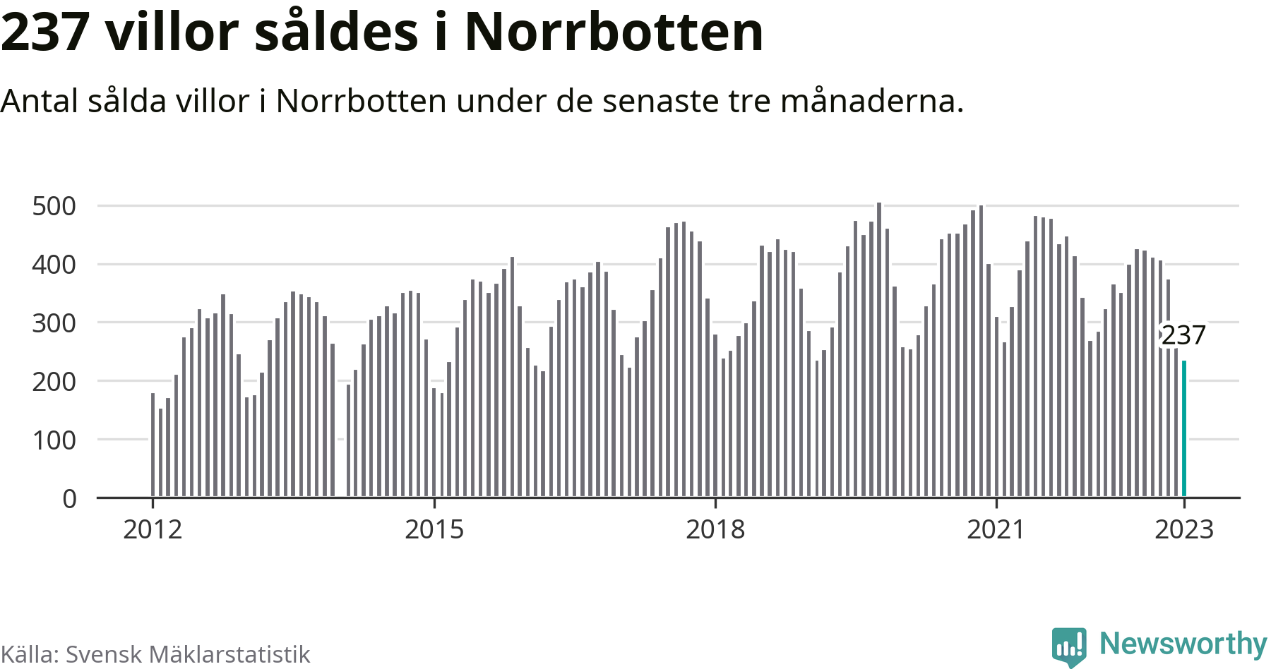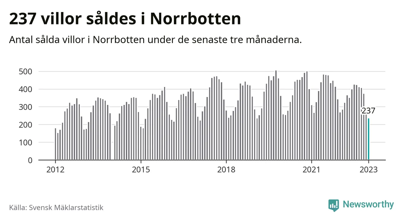 Mellan november och januari såldes 237 villor i Norrbottens län. Det är färre än någon tremånadersperiod sedan 2019.