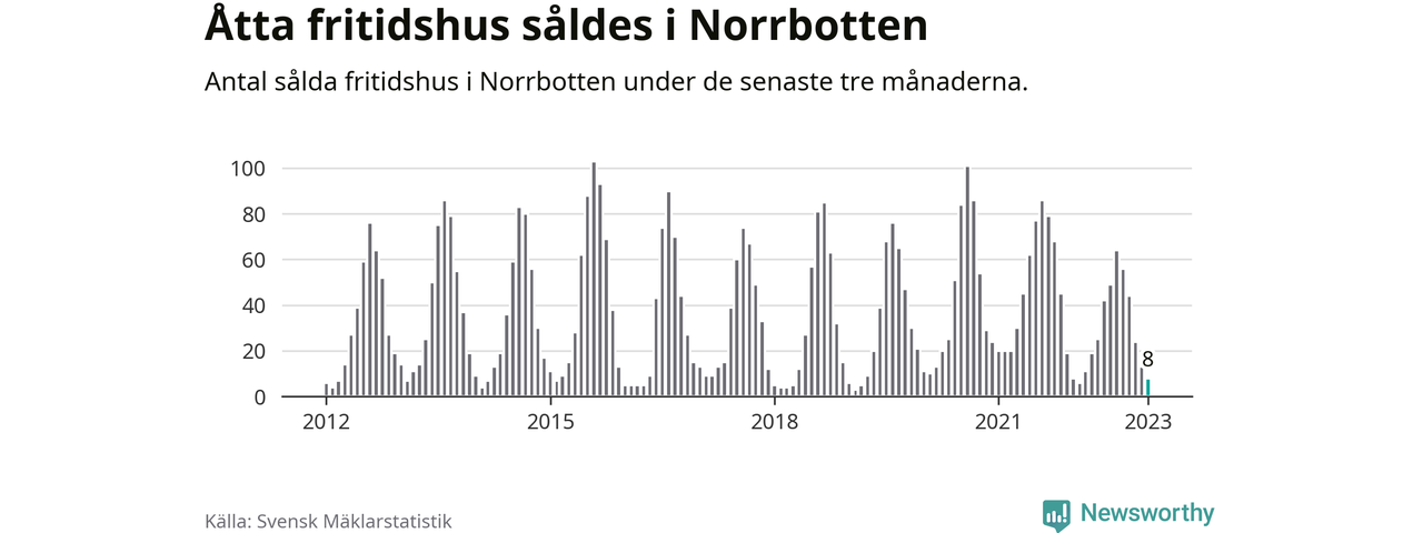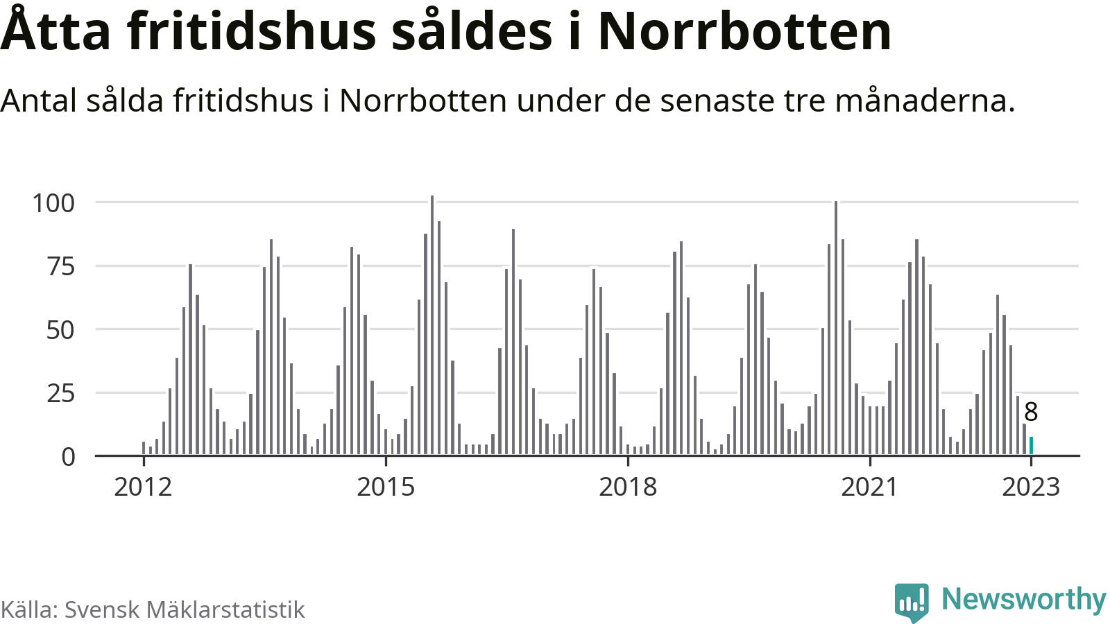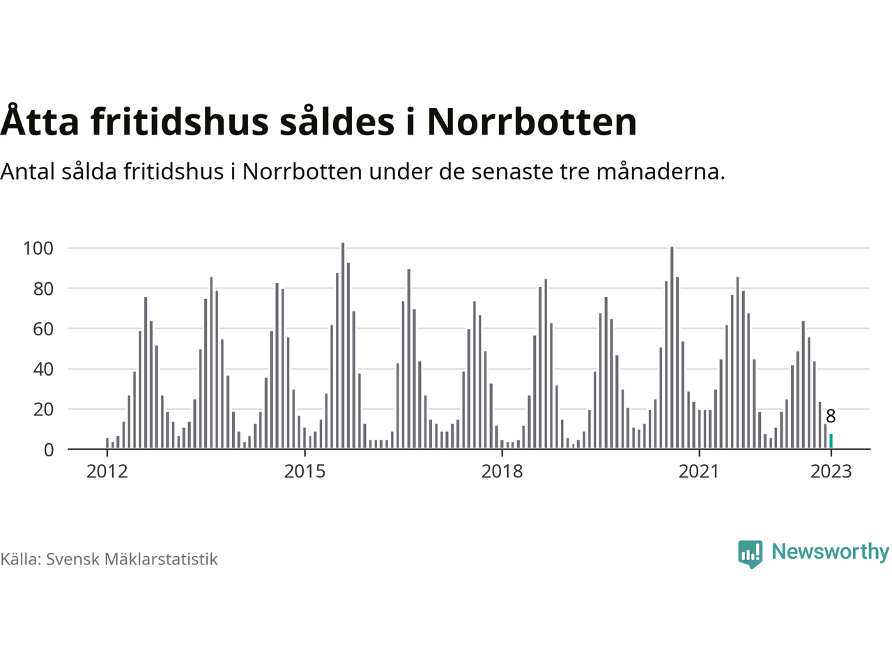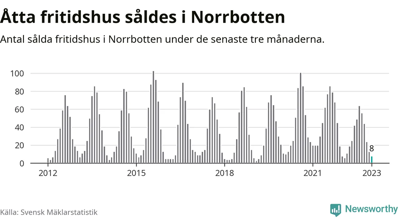 Sammanlagt såldes åtta fritidshus i Norrbottens län mellan november 2022 och januari till ett genomsnittligt pris på 1,4 miljoner kronor. I fjol gjordes åtta affärer vid den här tiden på året.