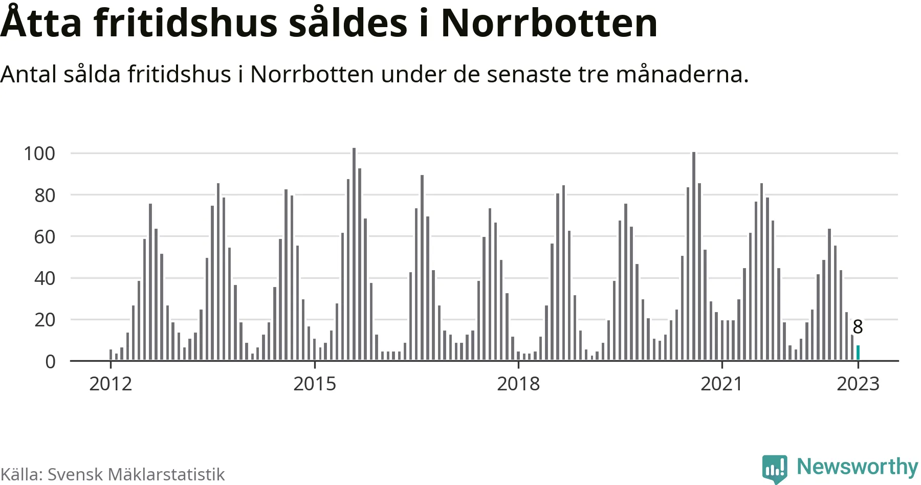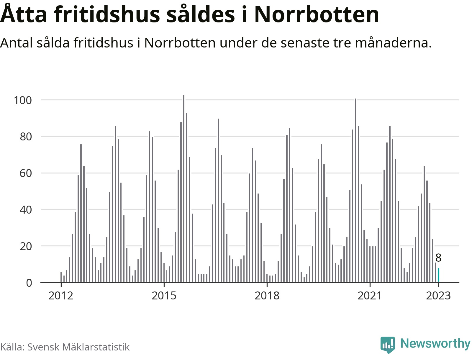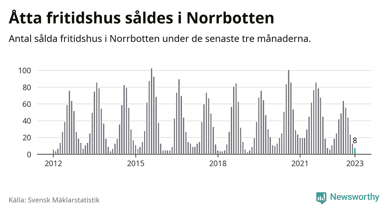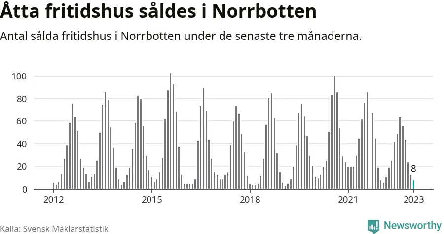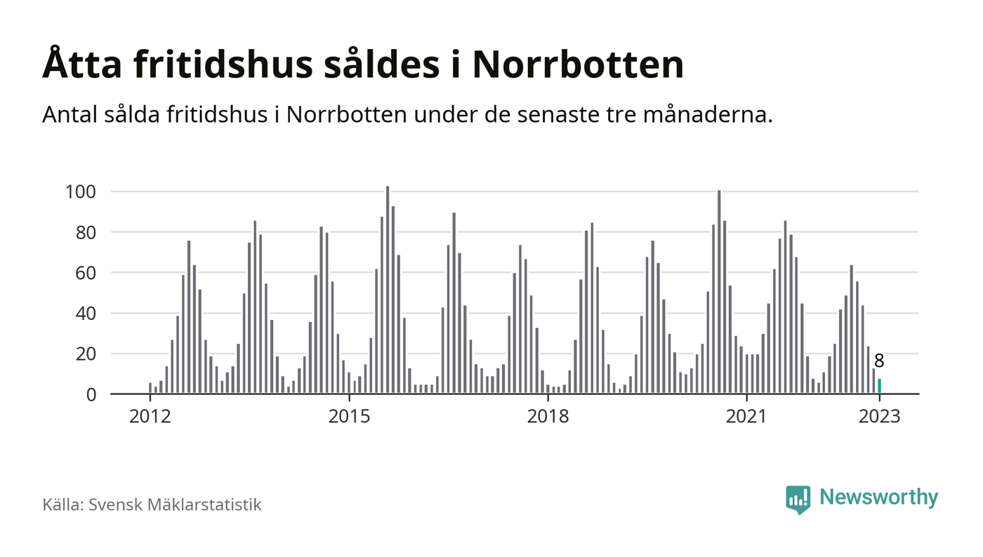 Sammanlagt såldes åtta fritidshus i Norrbottens län mellan november 2022 och januari till ett genomsnittligt pris på 1,4 miljoner kronor. I fjol gjordes åtta affärer vid den här tiden på året.