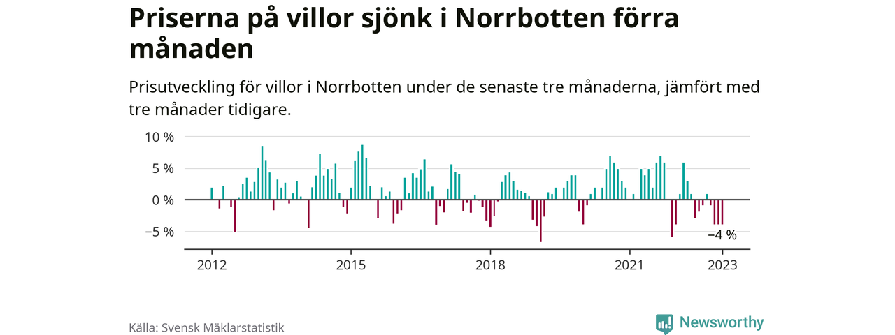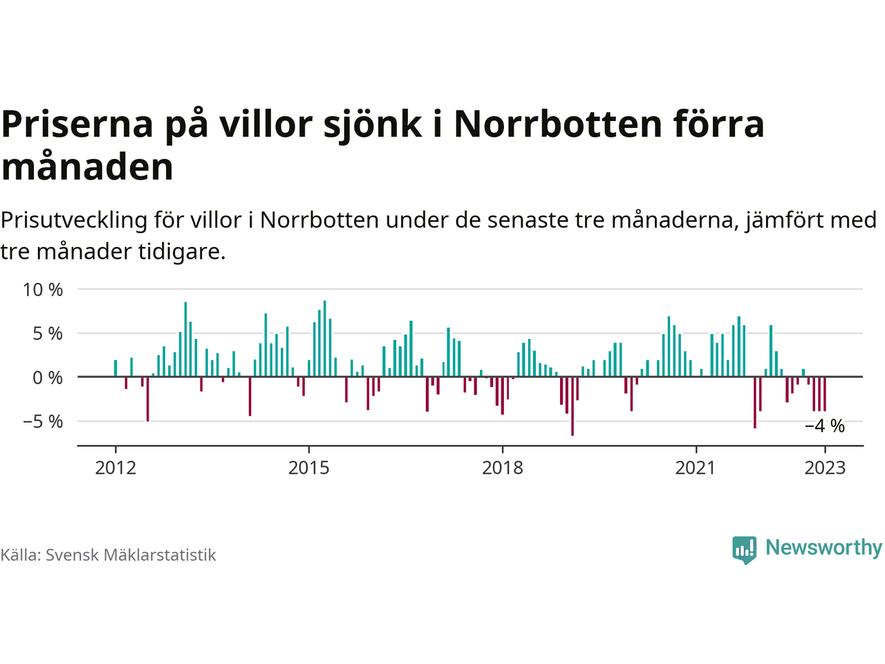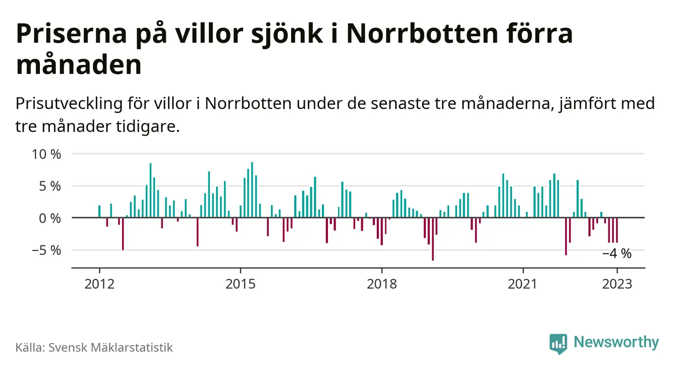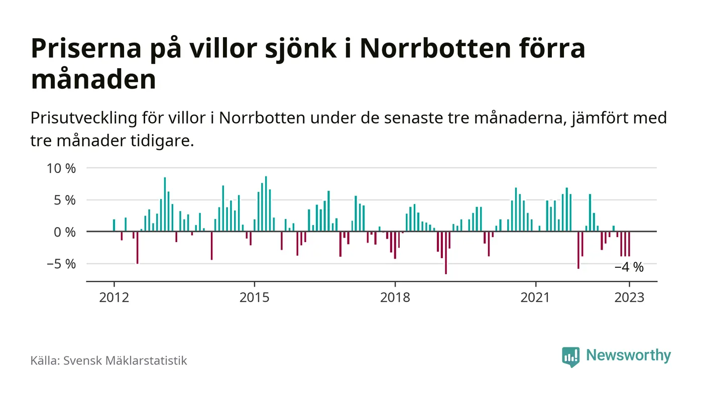 Statistiken visar även på en kännbar prisnedgång i Norrbottens län. Medelpriset på försäljningarna av villor i länet var 4 procent lägre än för tre månader sedan. Även i hela Sverige sjunker villapriserna. I hela riket noterades en prisnedgång på 7 procent.
