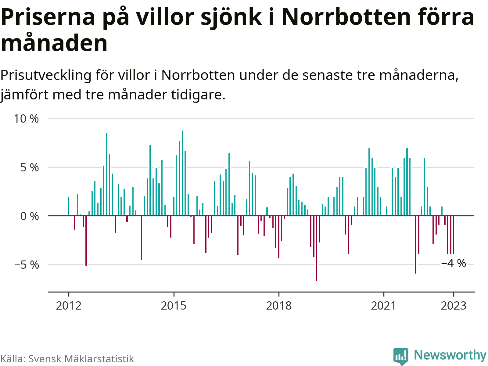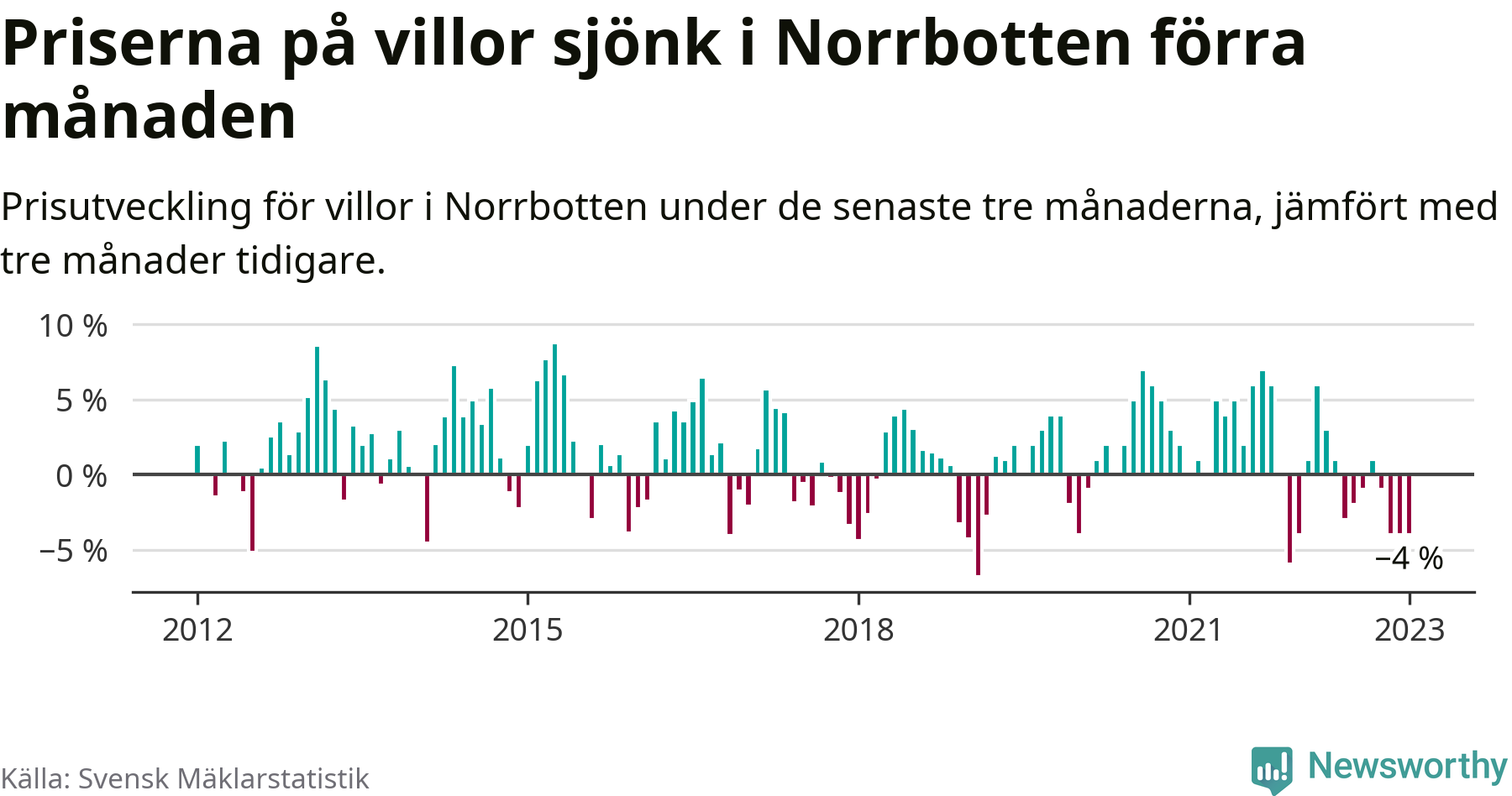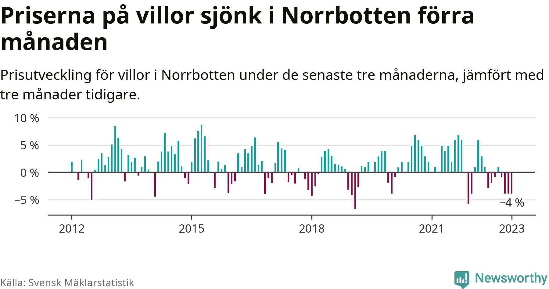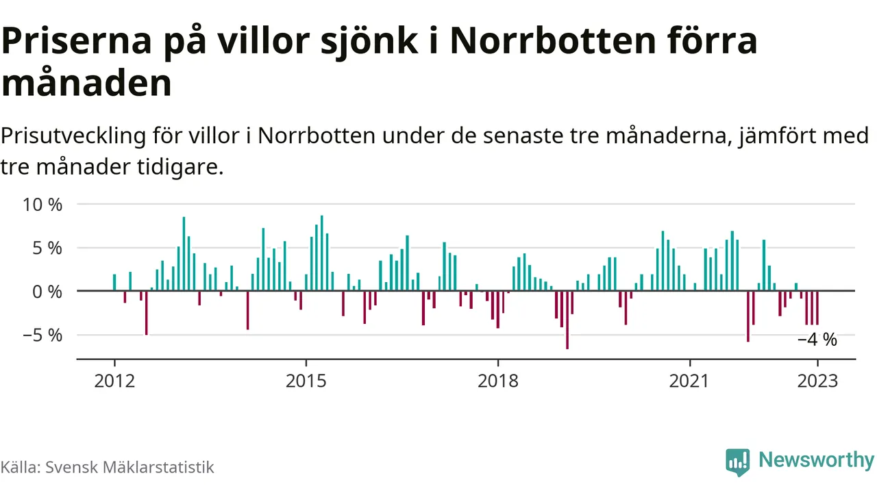 Statistiken visar även på en kännbar prisnedgång i Norrbottens län. Medelpriset på försäljningarna av villor i länet var 4 procent lägre än för tre månader sedan. Även i hela Sverige sjunker villapriserna. I hela riket noterades en prisnedgång på 7 procent.