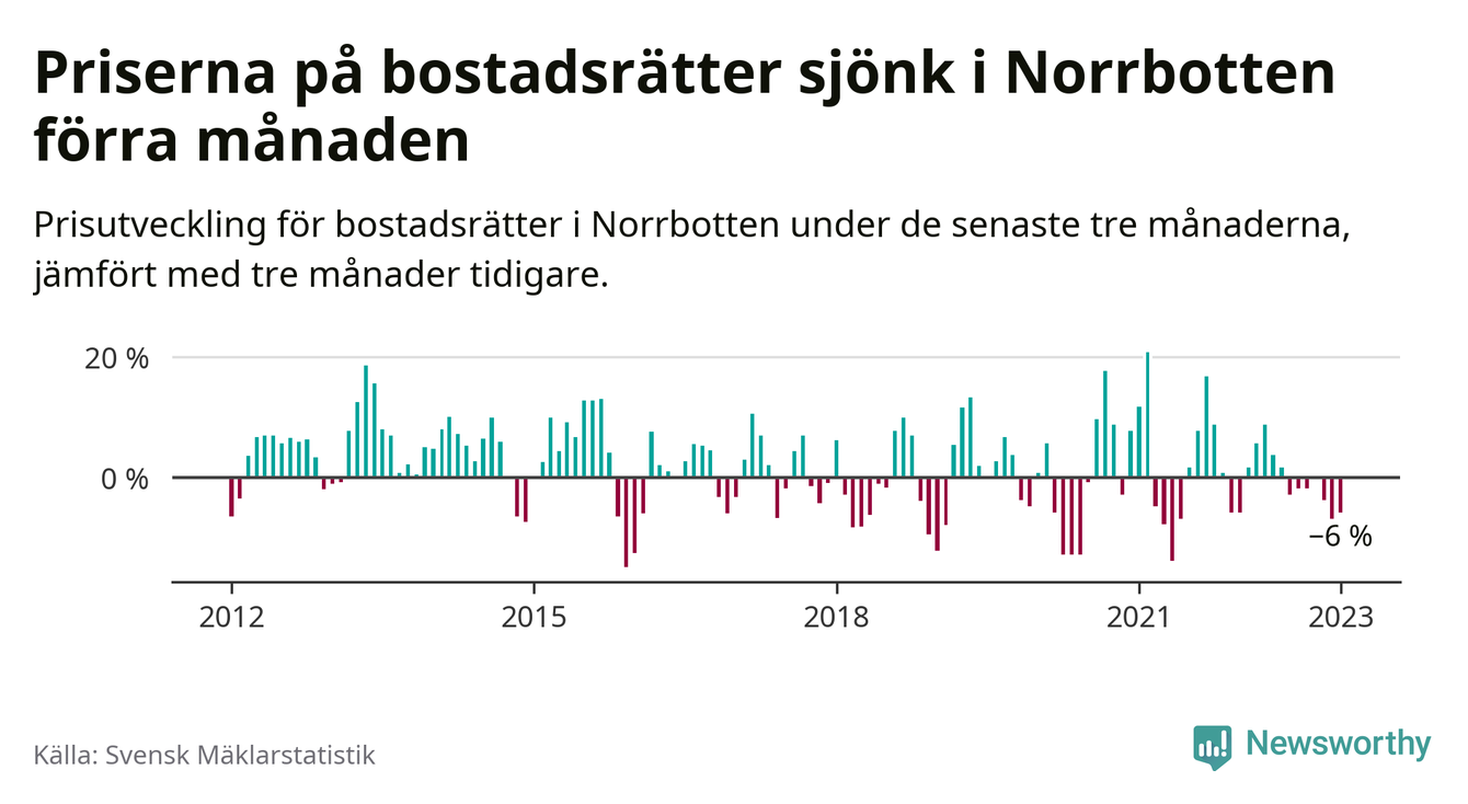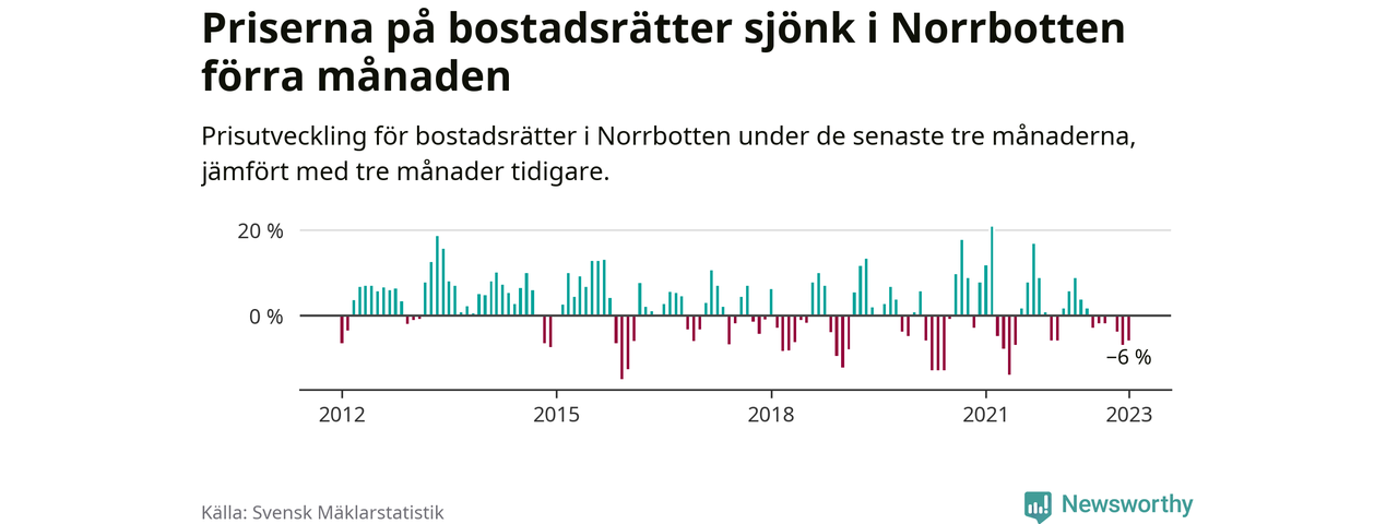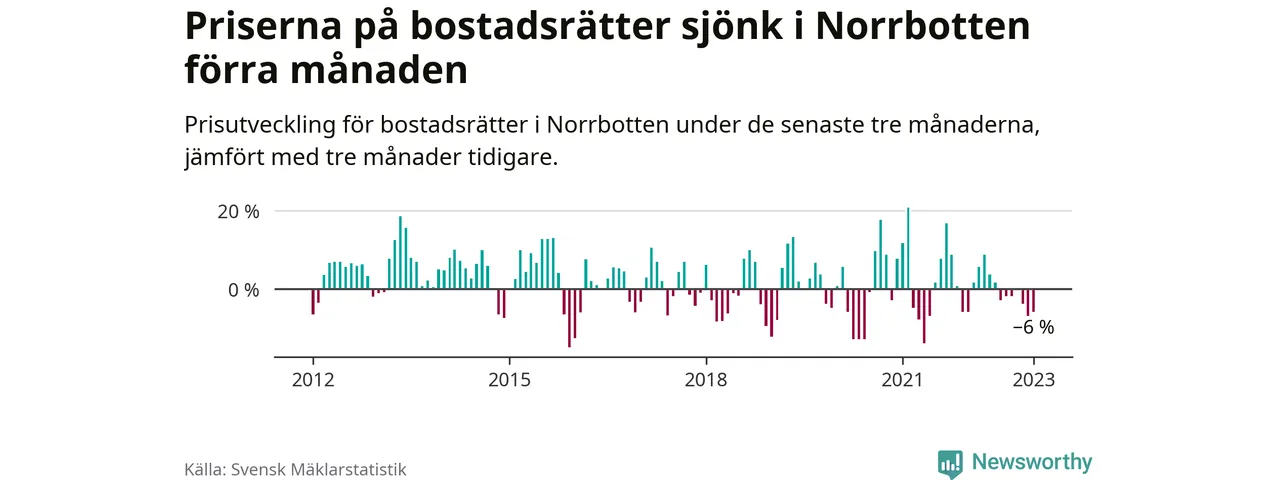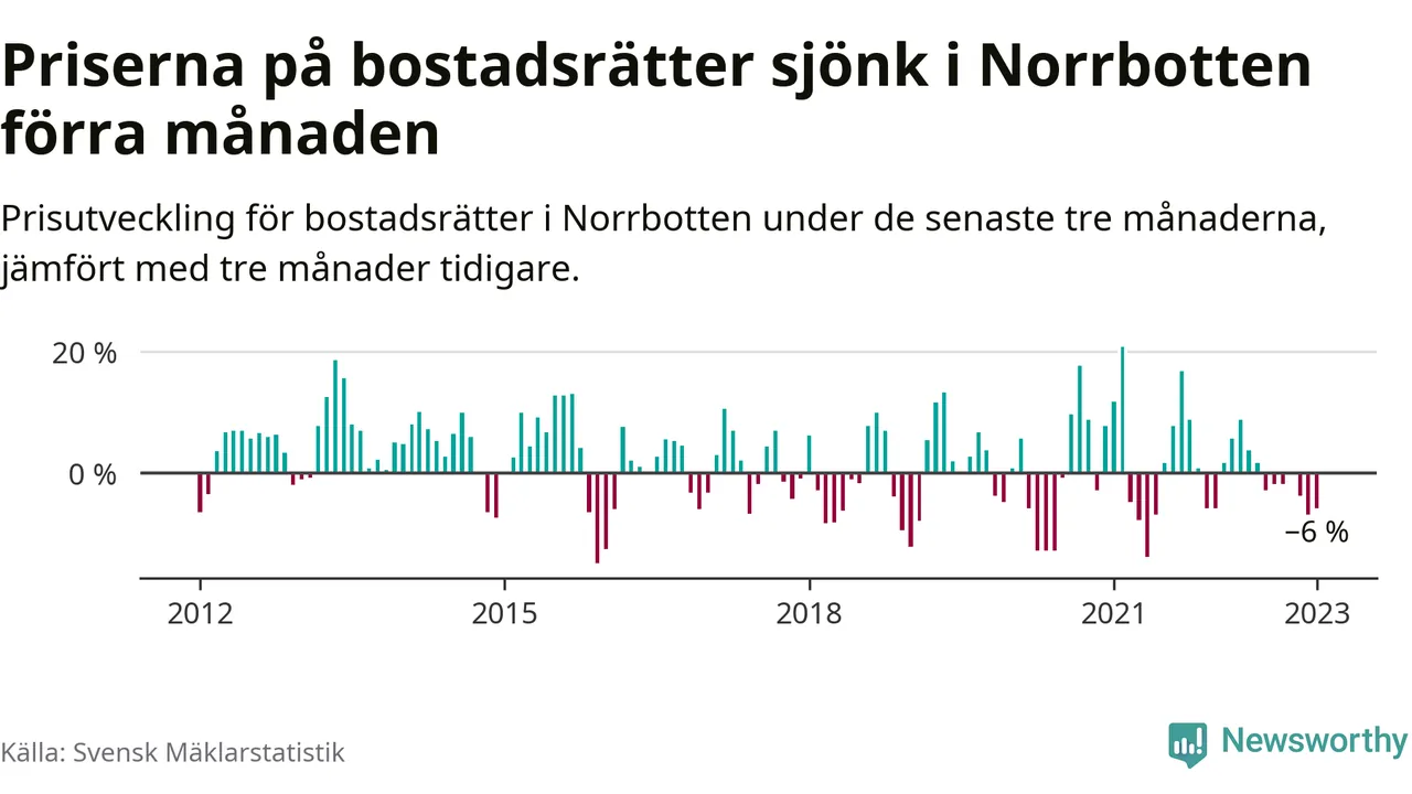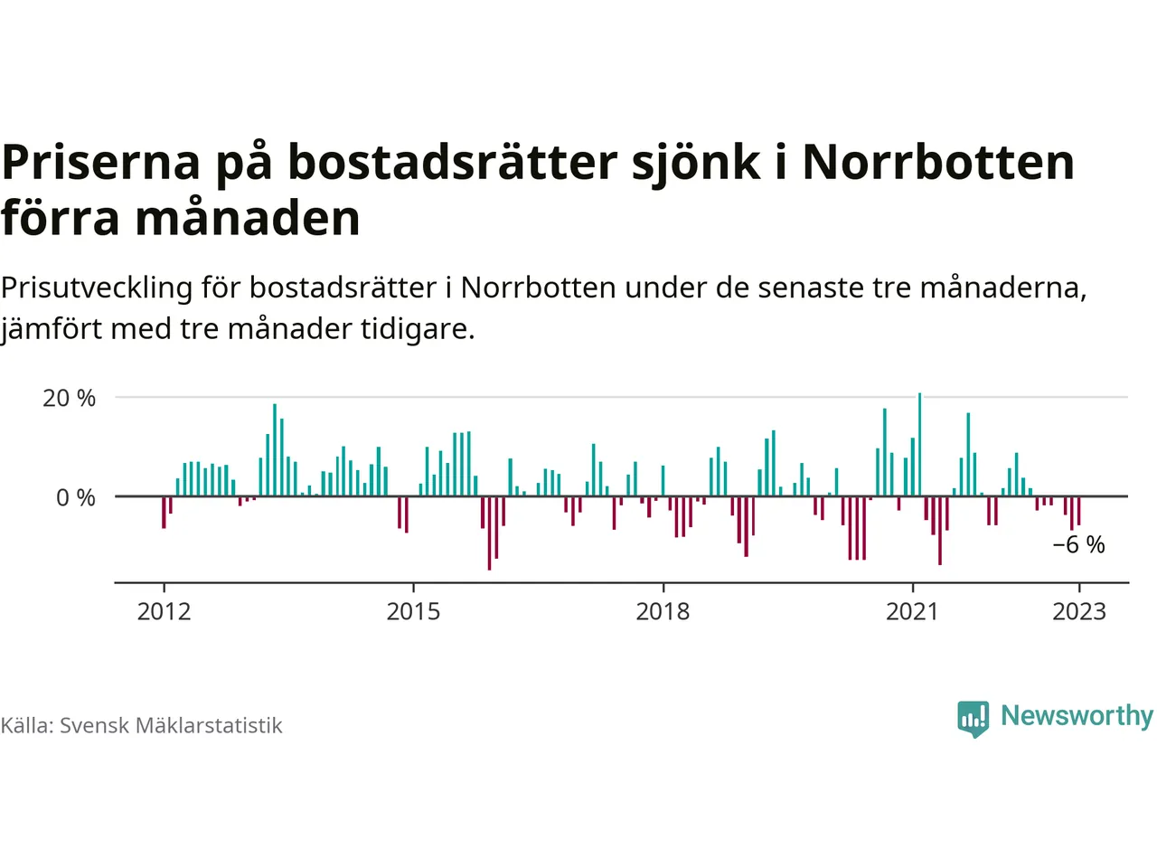 Statistiken visar även på en kännbar prisnedgång i Norrbottens län. Medelpriset på försäljningarna av bostadsrätter i länet var 6 procent lägre än för tre månader sedan. Även i hela Sverige sjunker priserna på bostadsrätter. I hela riket noterades en prisnedgång på 4 procent.