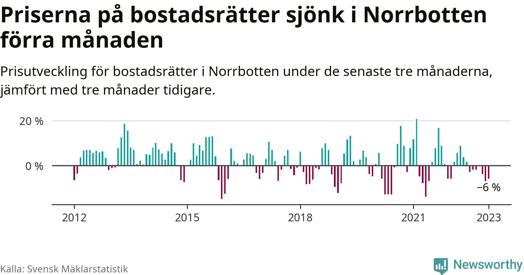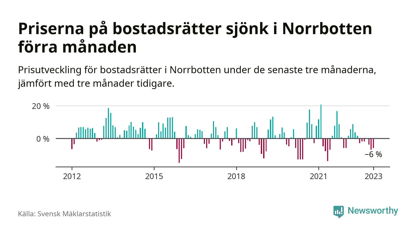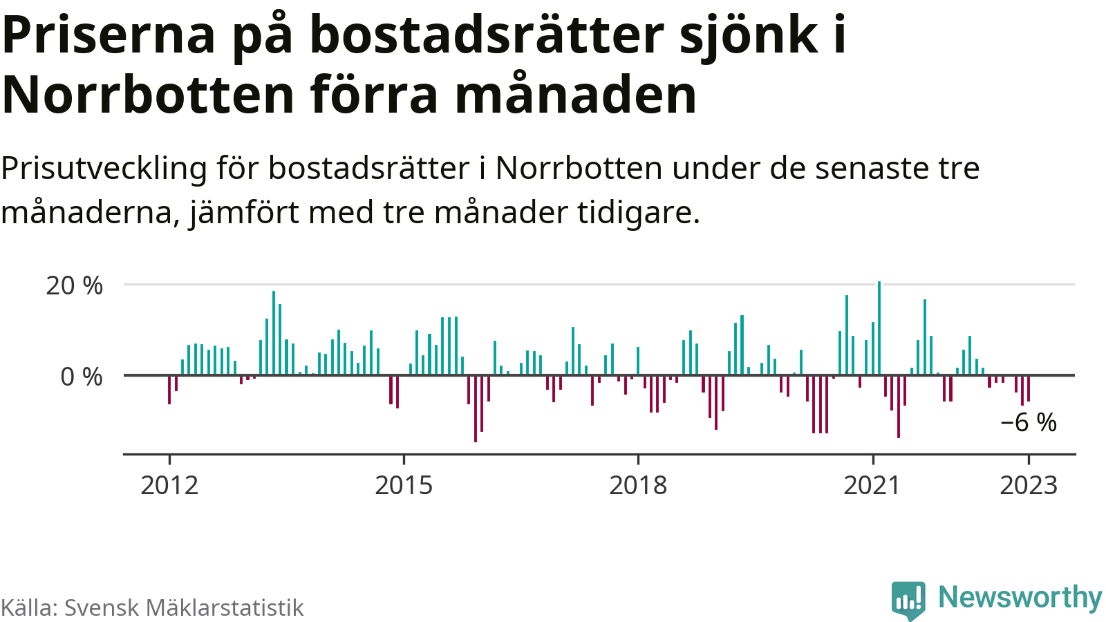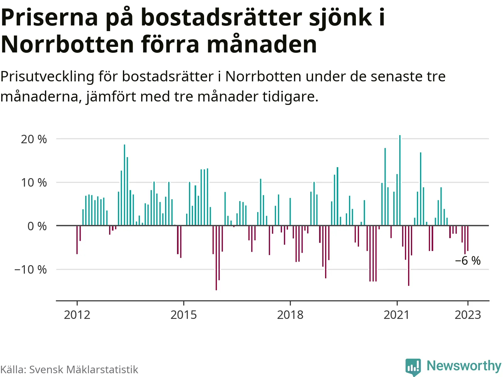 Statistiken visar även på en kännbar prisnedgång i Norrbottens län. Medelpriset på försäljningarna av bostadsrätter i länet var 6 procent lägre än för tre månader sedan. Även i hela Sverige sjunker priserna på bostadsrätter. I hela riket noterades en prisnedgång på 4 procent.