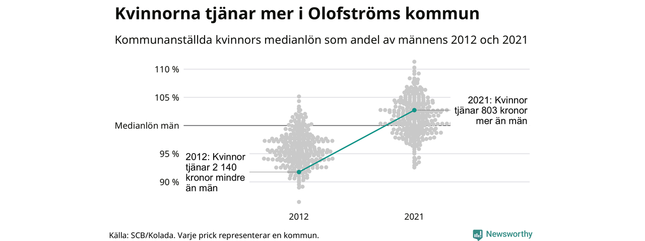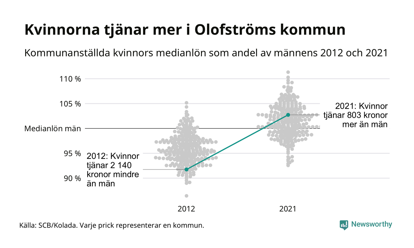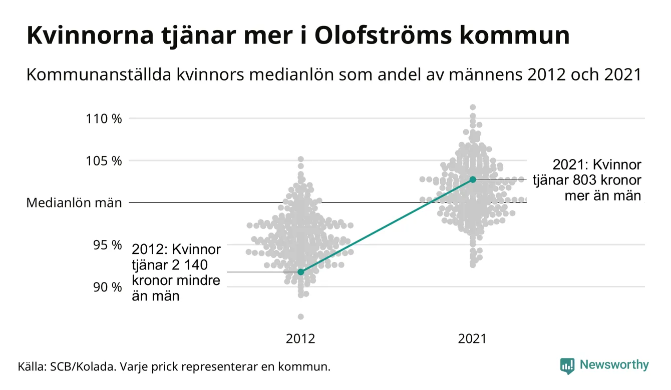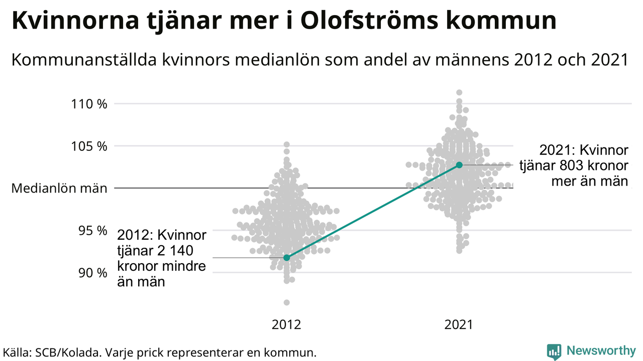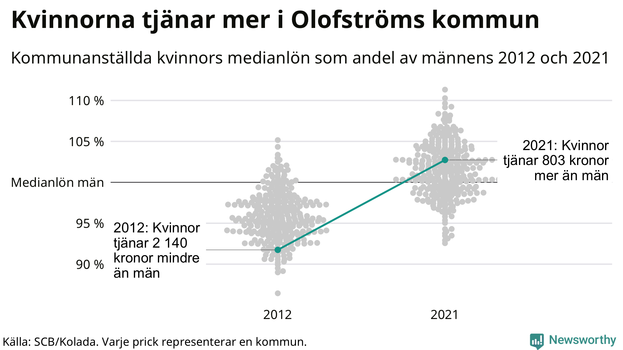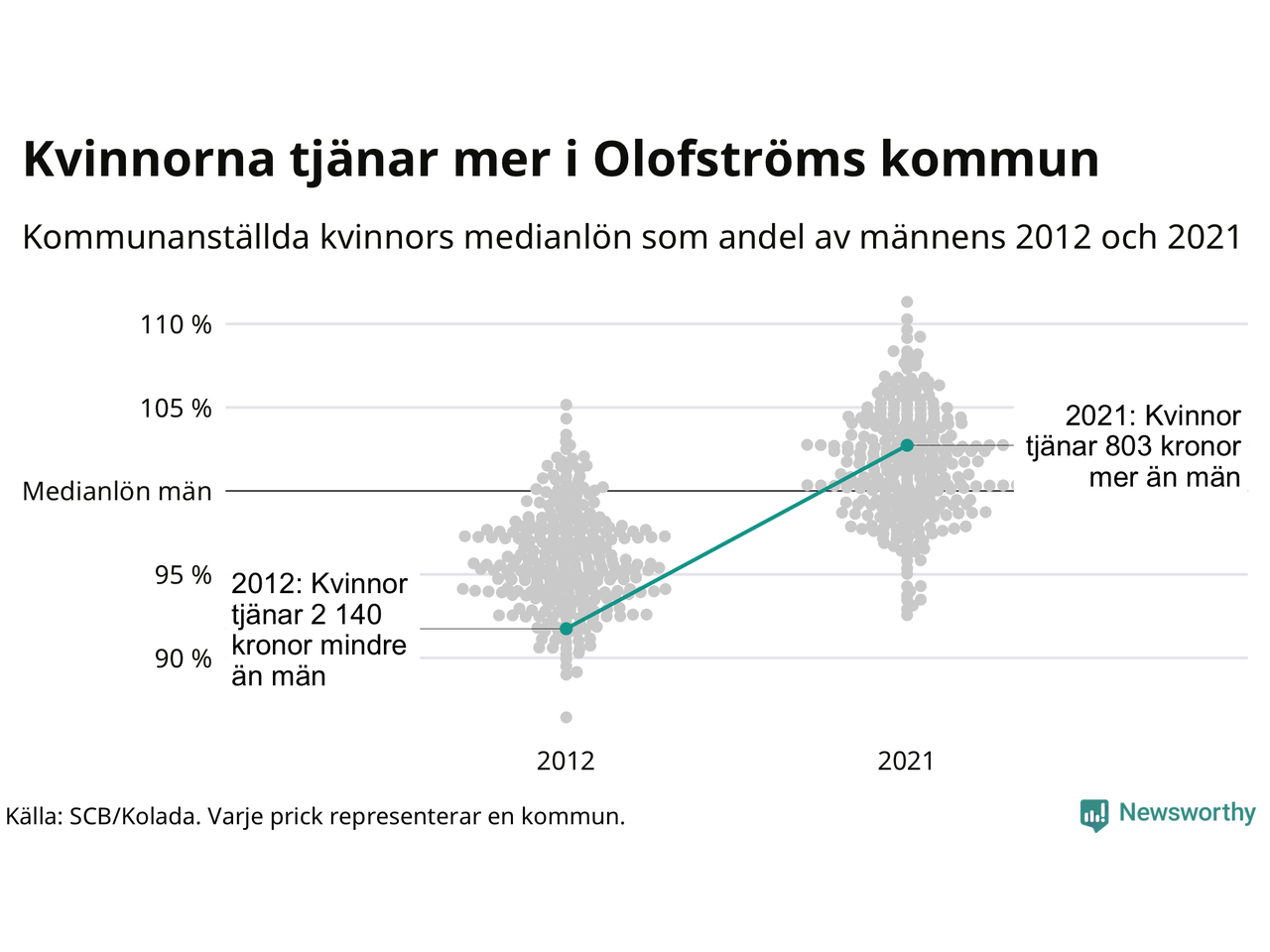 Och även i Olofströms kommun har utvecklingen gått åt samma håll: 2012 tjänade mediankvinnan 92 procent av medianmannens lön. 2021 låg de anställda kvinnornas medianlön på 30 218, vilket är 803 kronor mer än medianlönen för män.