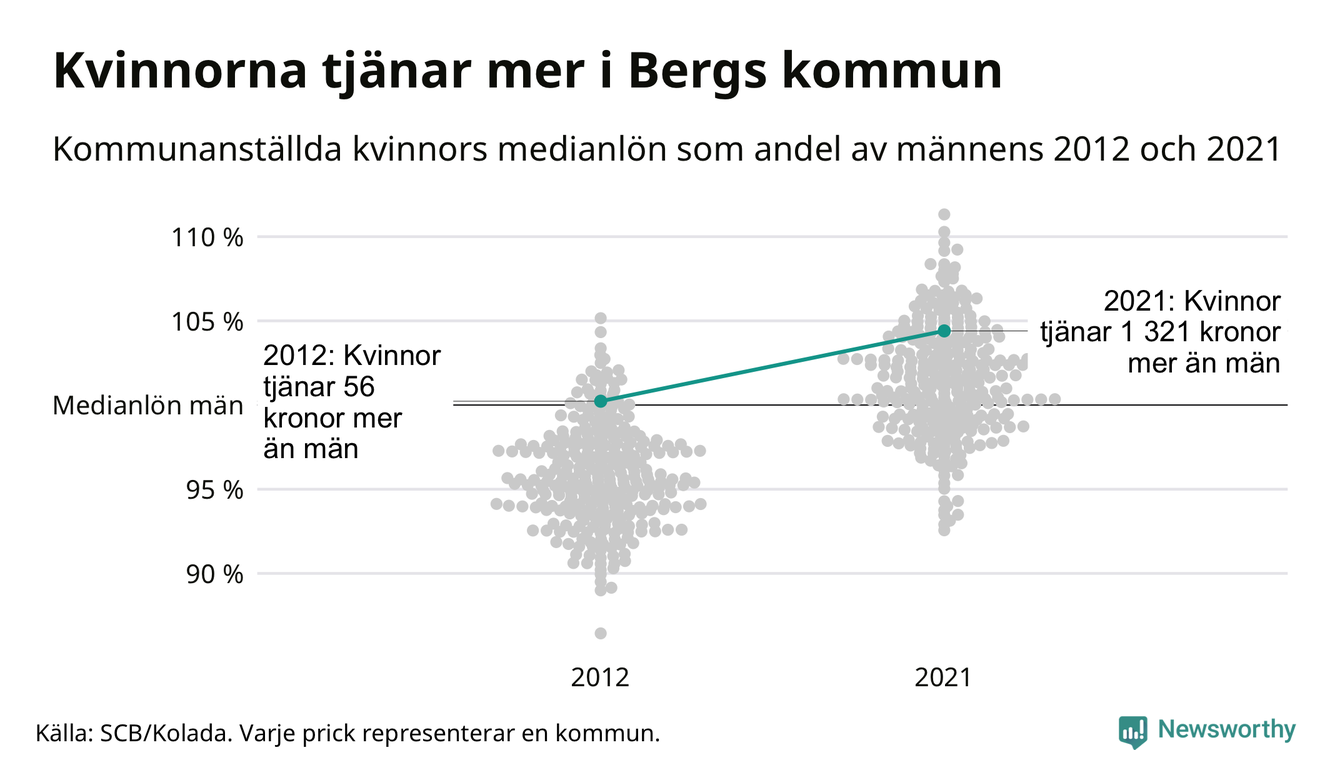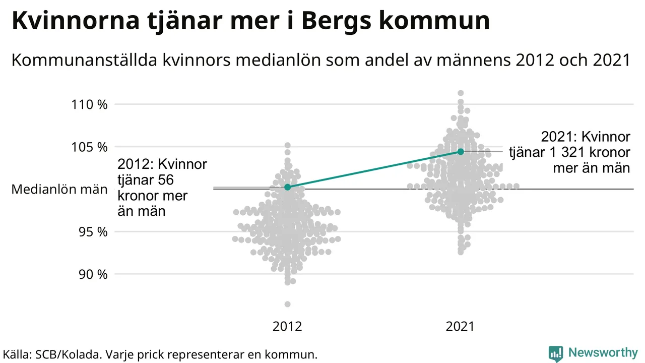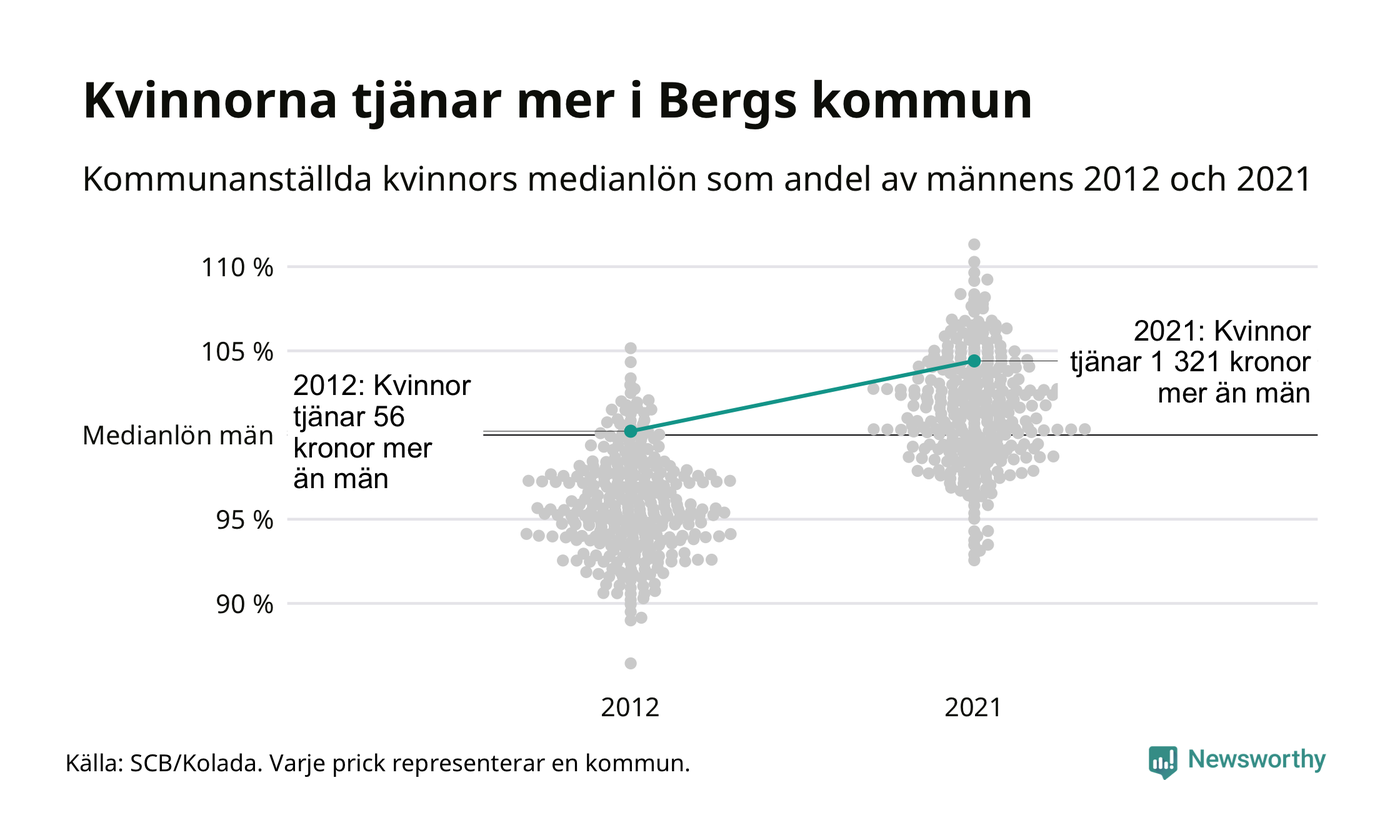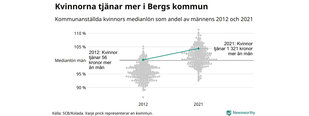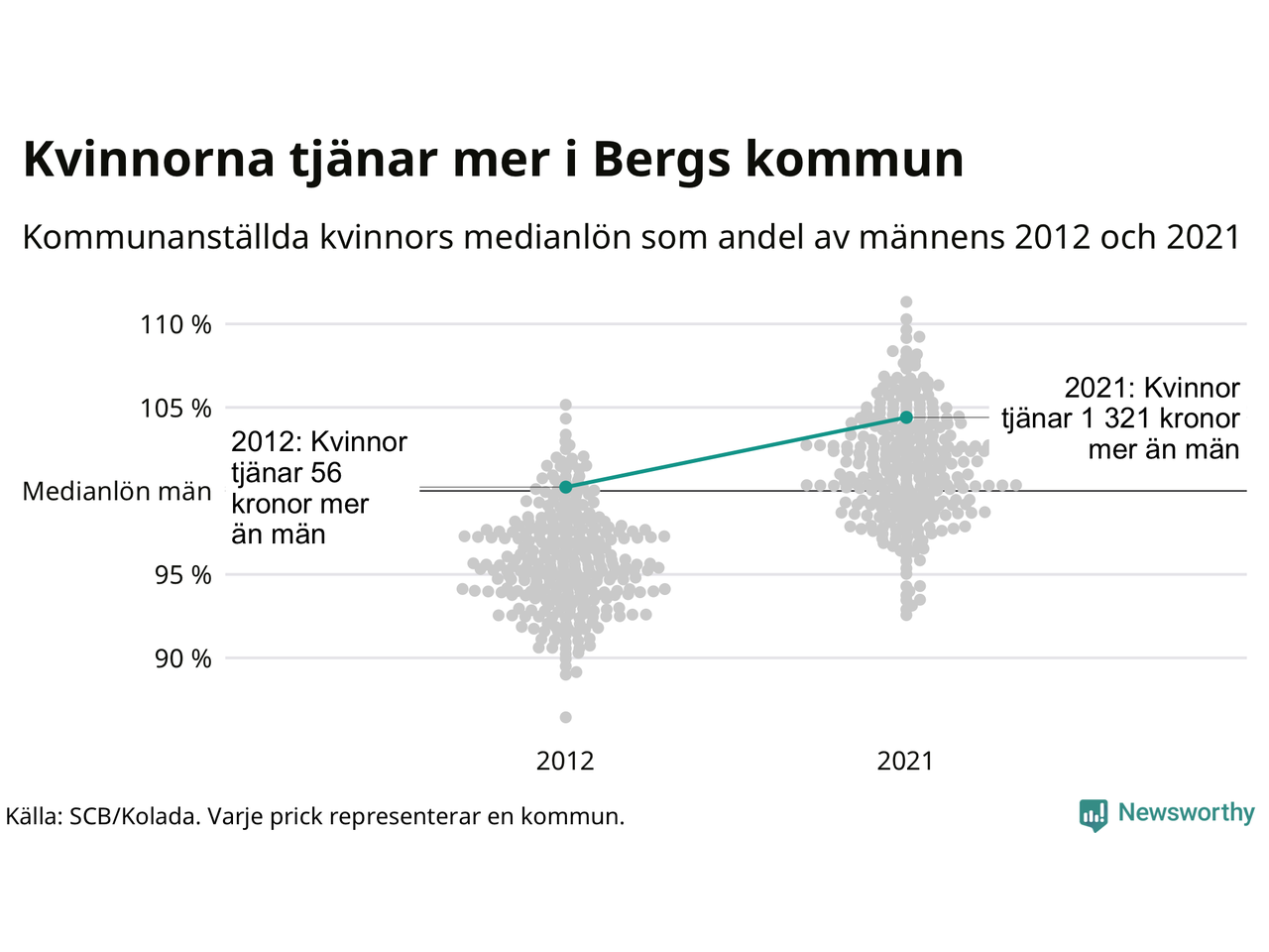 Även i Bergs kommun har utvecklingen gått åt samma håll: även 2012 låg medianlönerna nära varandra i Bergs kommun (24 733 kronor för kvinnor, 24 677 kronor för män) och sedan dess har kvinnorna dragit ifrån. Nu ligger medianlönen för kvinnor på 31 321 kronor – vilket är 1 321 kronor mer än för män.