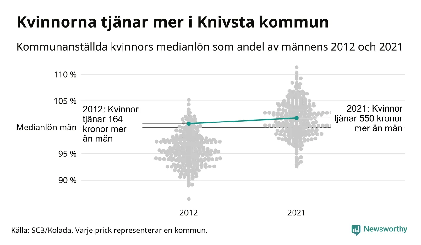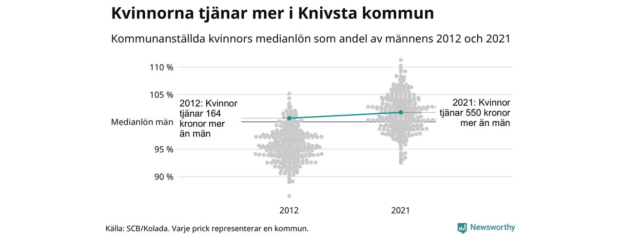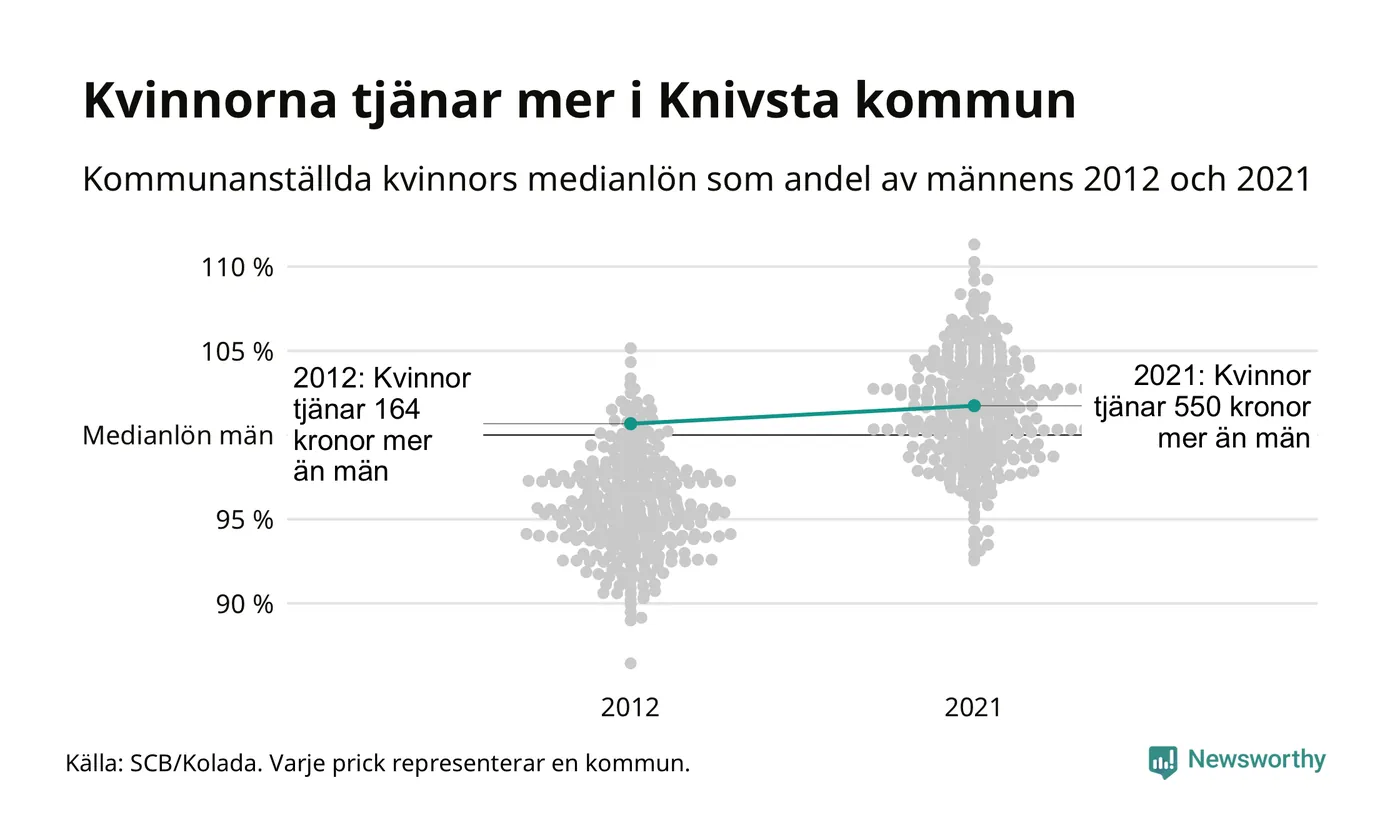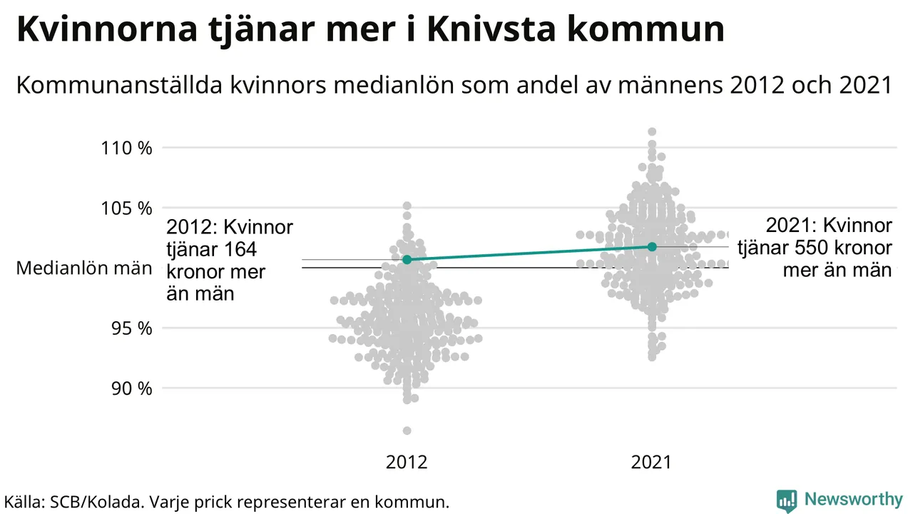 Även i Knivsta kommun har utvecklingen gått åt samma håll: redan 2012 låg medianlönerna högre för kvinnor i Knivsta kommun och sedan dess har kvinnorna dragit ifrån. Nu ligger medianlönen för kvinnor på 32 150 kronor – vilket är 550 kronor mer än för män.