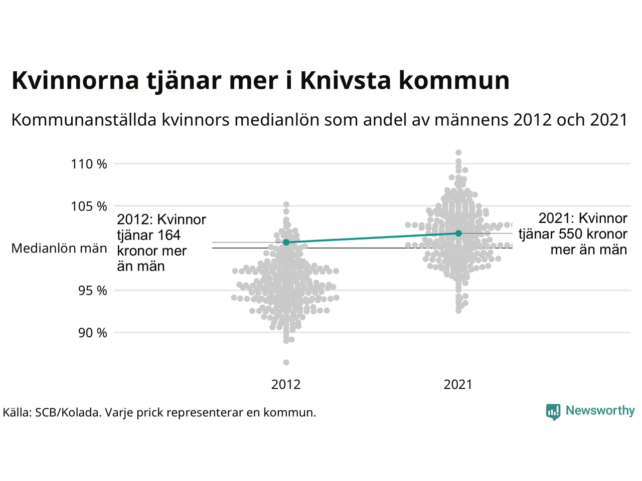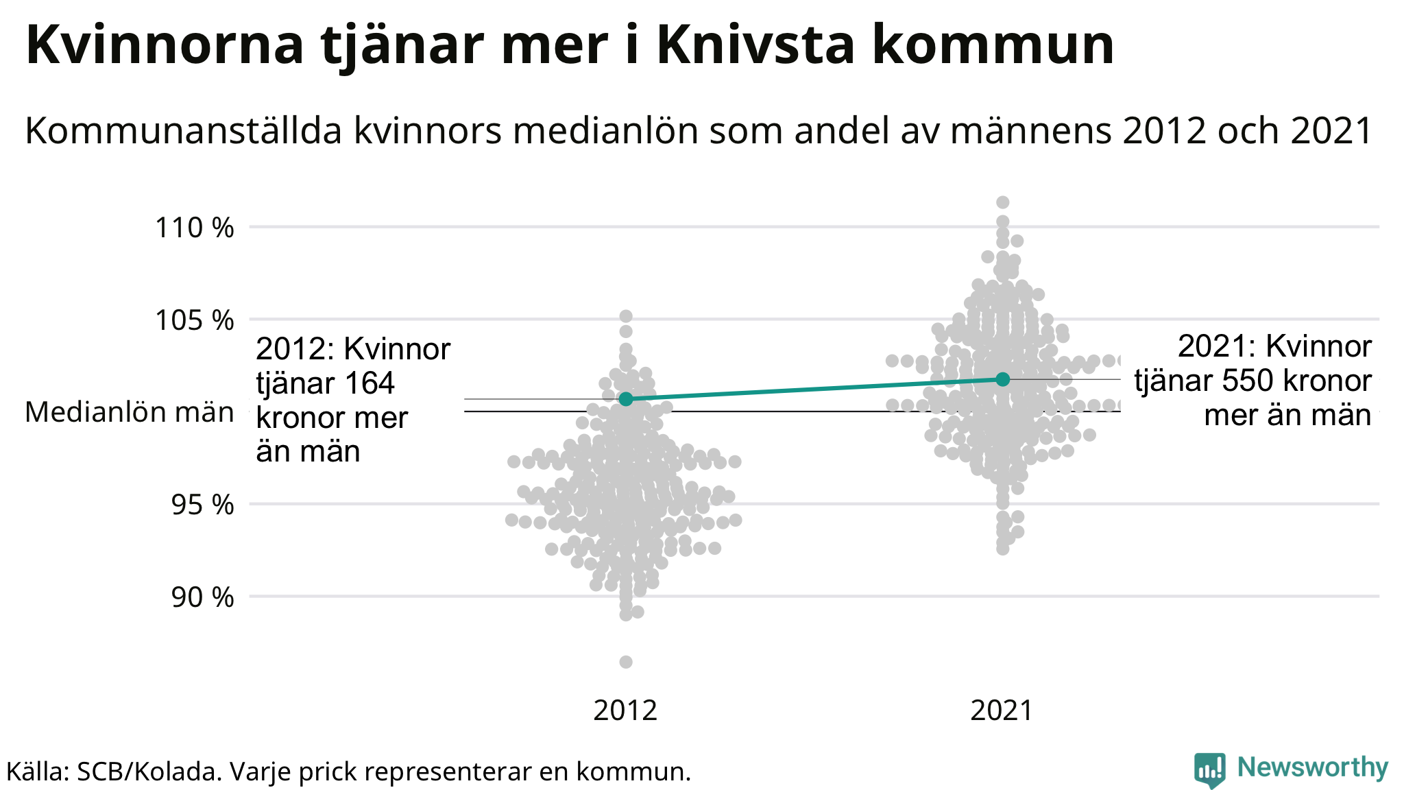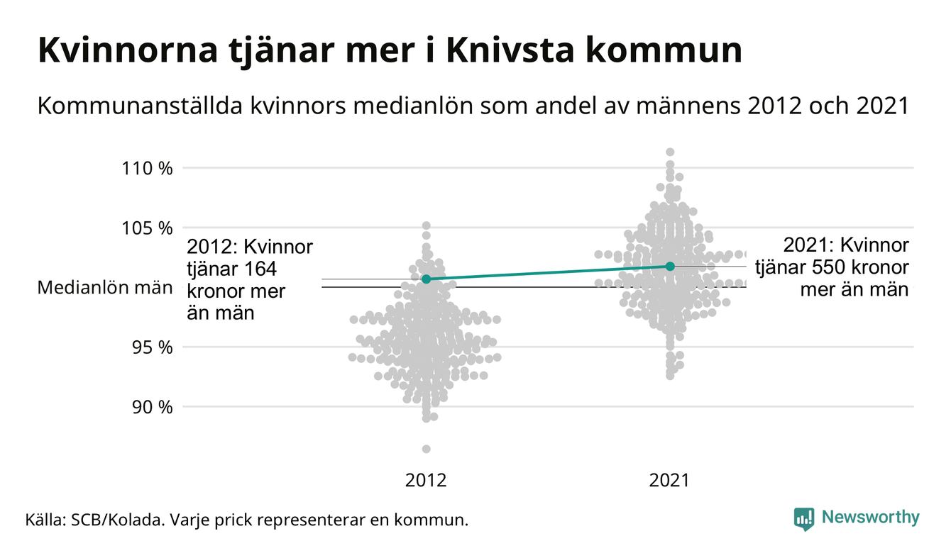 Även i Knivsta kommun har utvecklingen gått åt samma håll: redan 2012 låg medianlönerna högre för kvinnor i Knivsta kommun och sedan dess har kvinnorna dragit ifrån. Nu ligger medianlönen för kvinnor på 32 150 kronor – vilket är 550 kronor mer än för män.