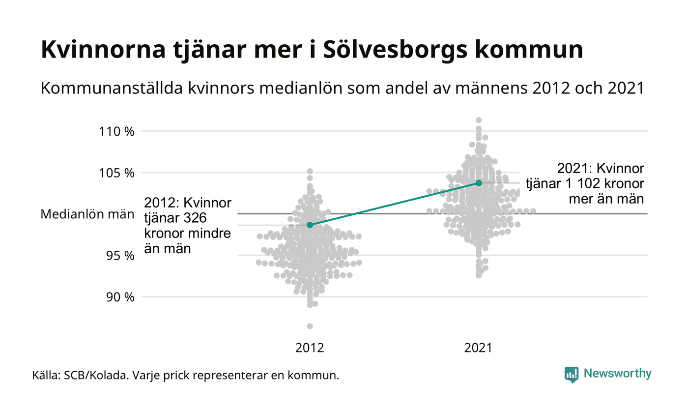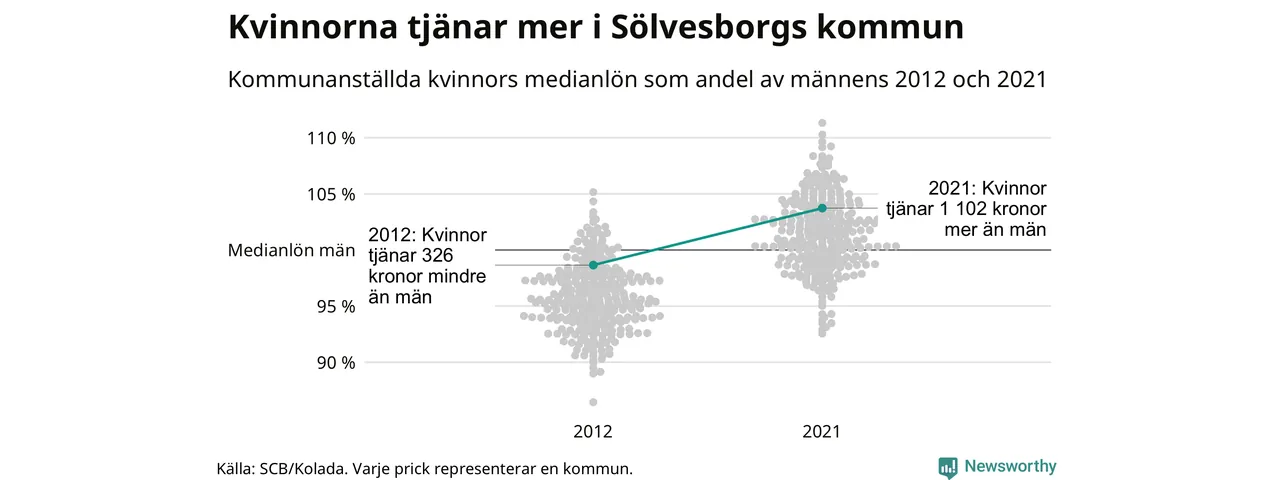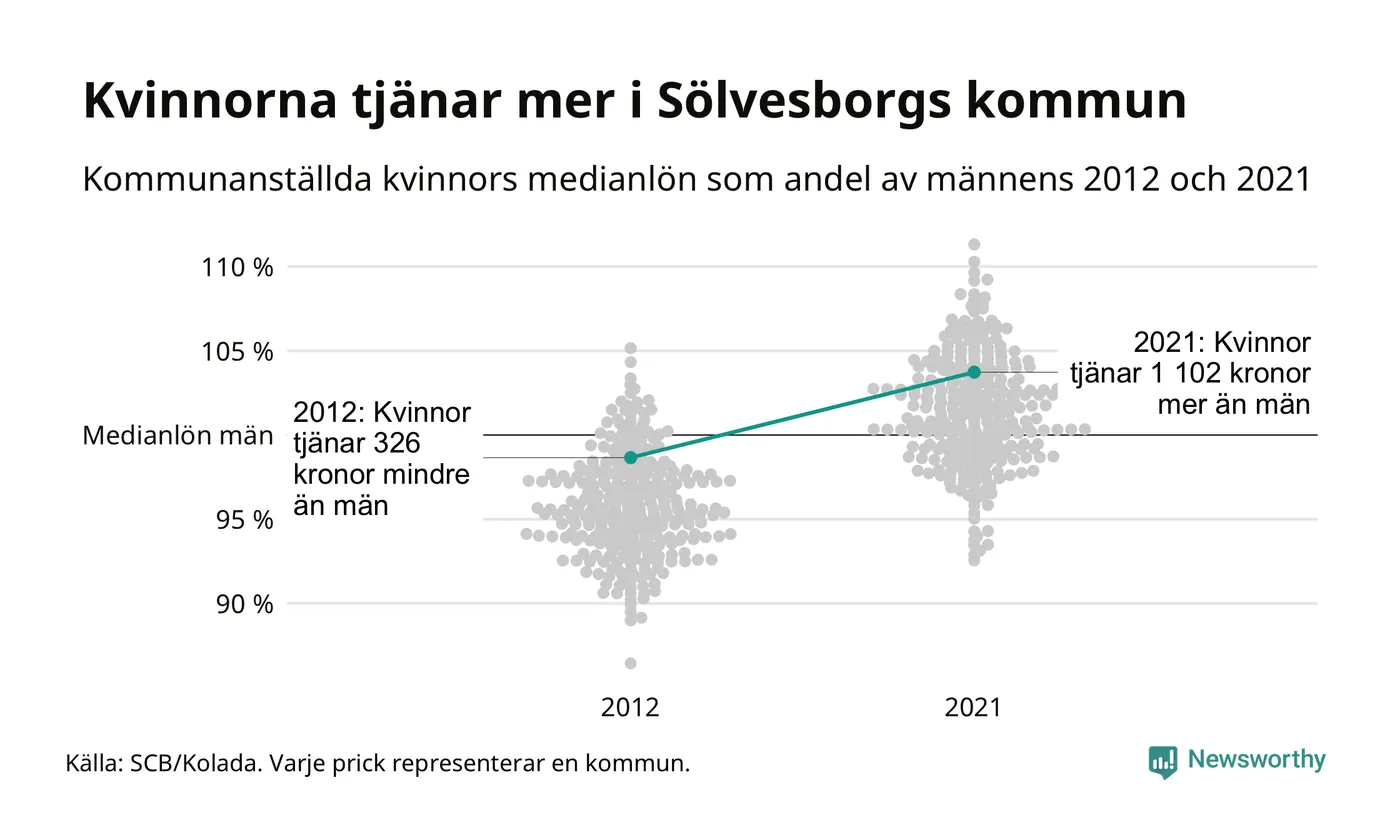 Och även i Sölvesborgs kommun har utvecklingen gått åt samma håll: 2012 tjänade mediankvinnan 99 procent av medianmannens lön. 2021 låg de anställda kvinnornas medianlön på 30 622, vilket är 1 102 kronor mer än medianlönen för män.