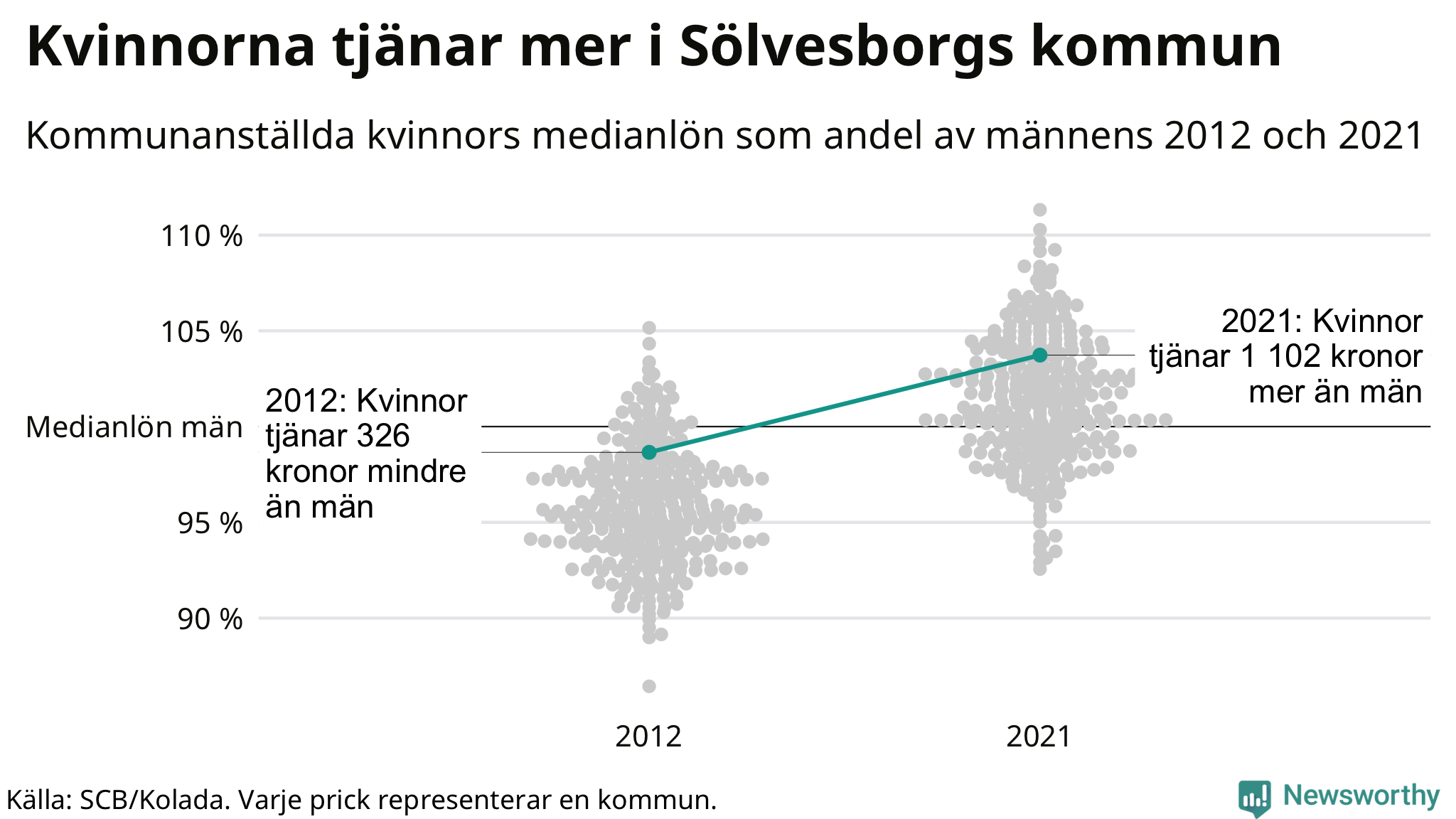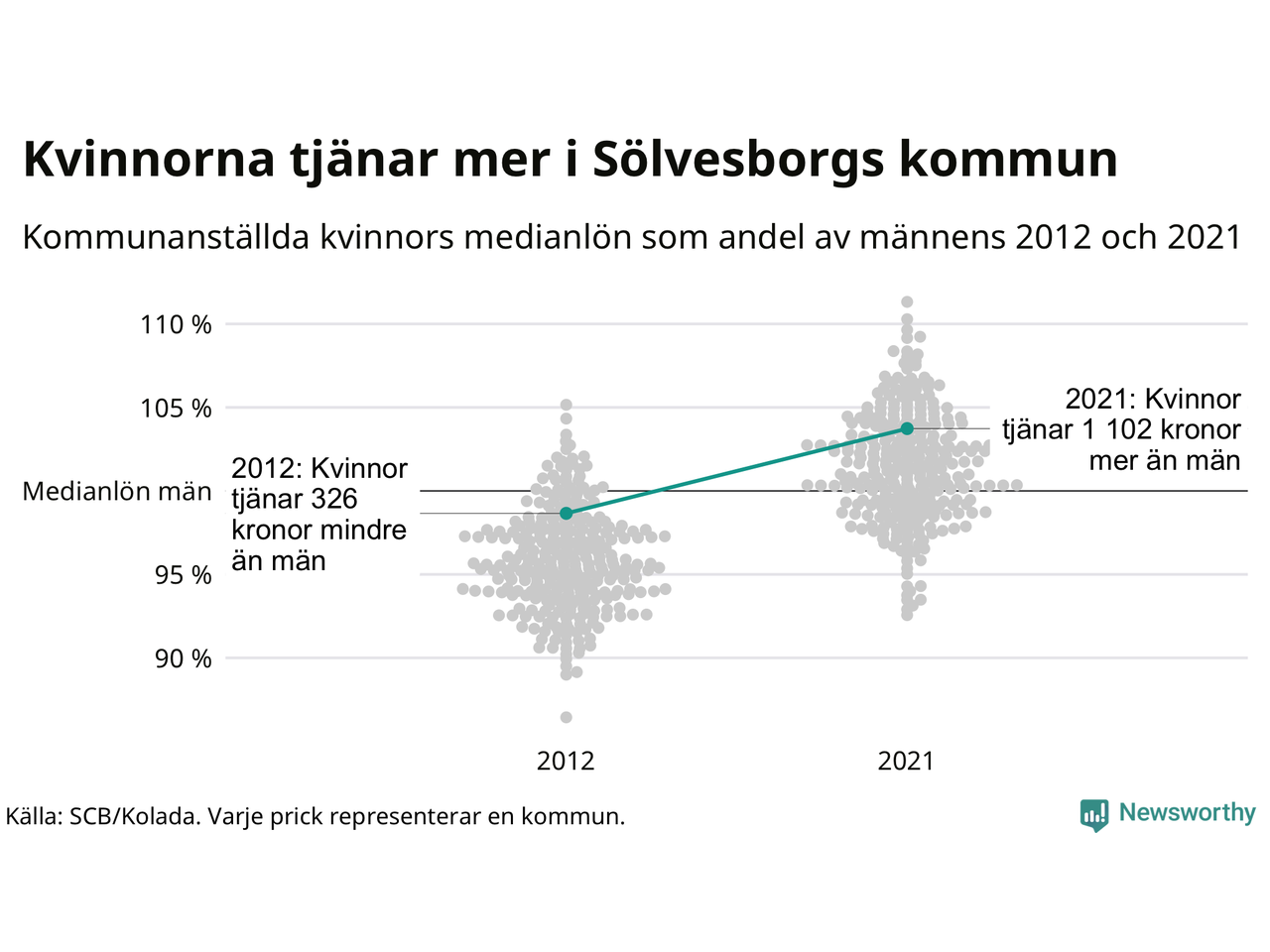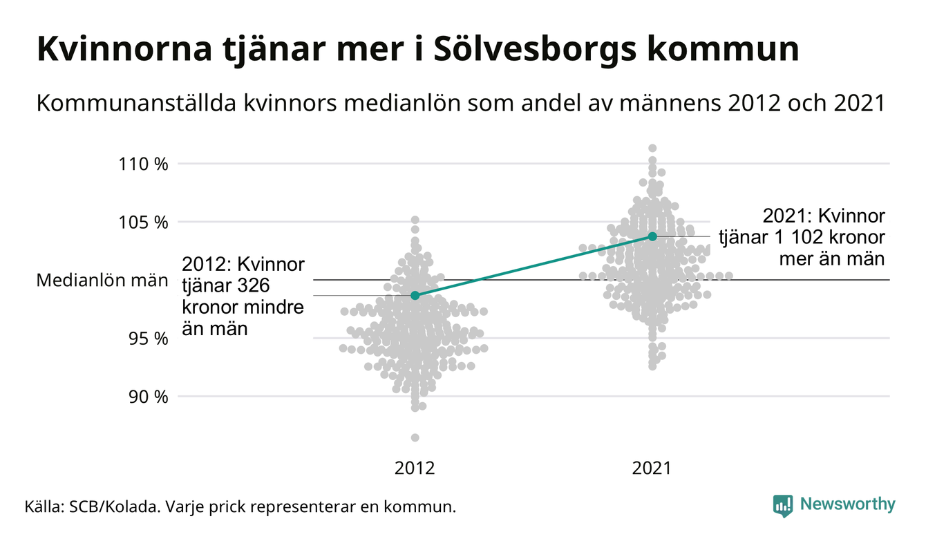 Och även i Sölvesborgs kommun har utvecklingen gått åt samma håll: 2012 tjänade mediankvinnan 99 procent av medianmannens lön. 2021 låg de anställda kvinnornas medianlön på 30 622, vilket är 1 102 kronor mer än medianlönen för män.