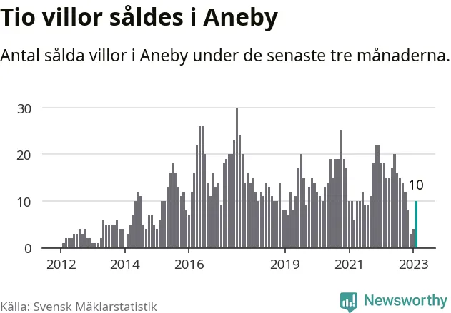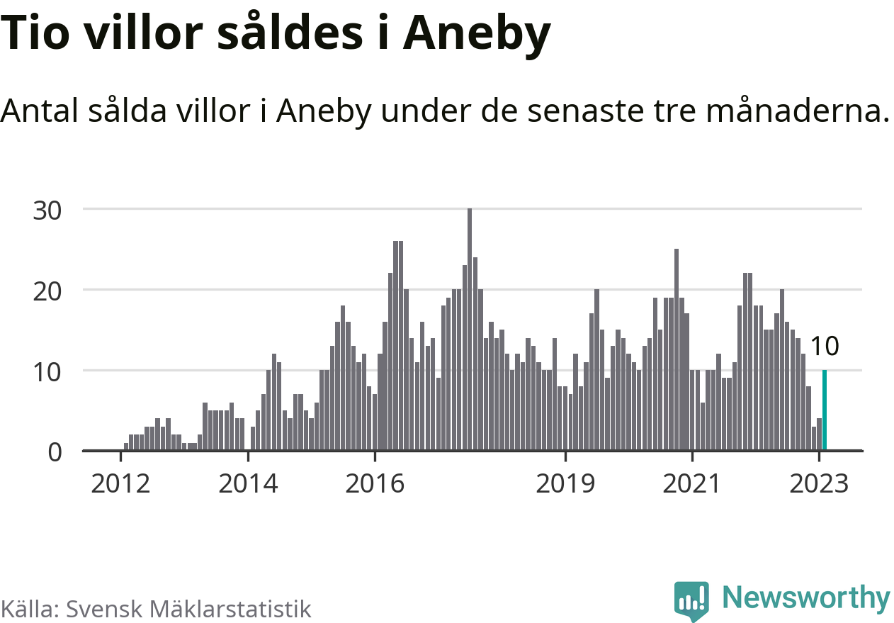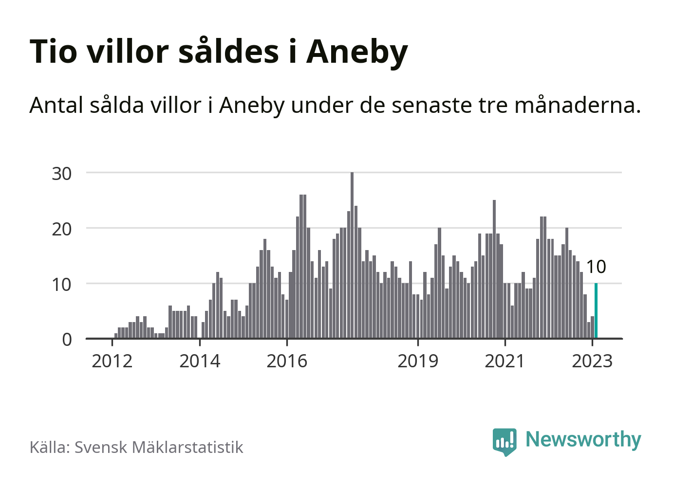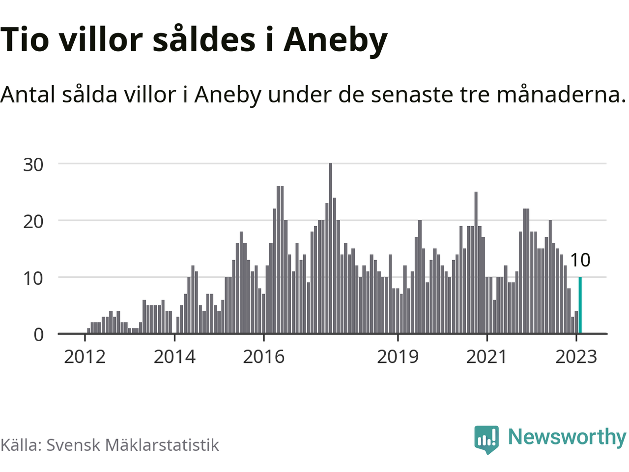 Mellan december och februari gjordes sammanlagt tio affärer med villor i Aneby kommun. Det kan jämföras med 18 vid motsvarande tid i fjol.