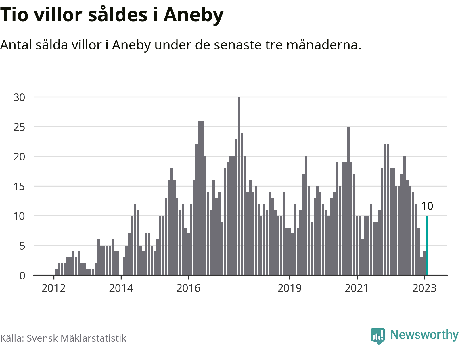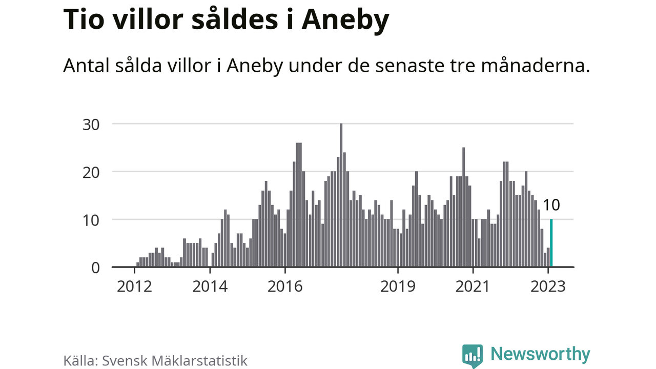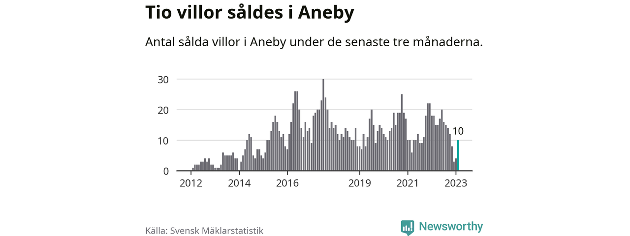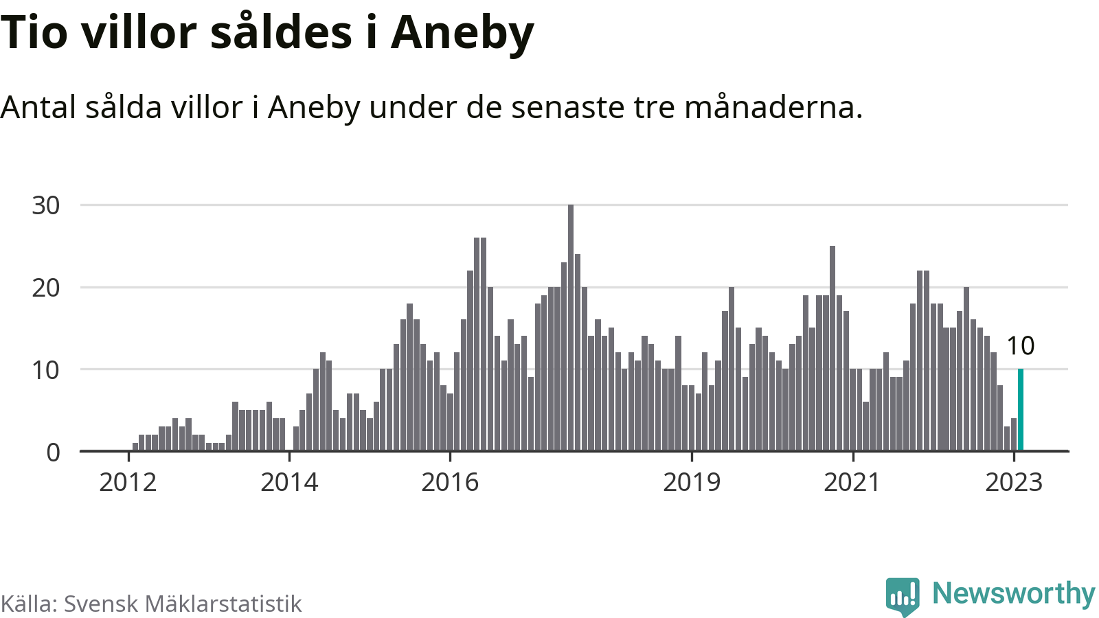 Mellan december och februari gjordes sammanlagt tio affärer med villor i Aneby kommun. Det kan jämföras med 18 vid motsvarande tid i fjol.