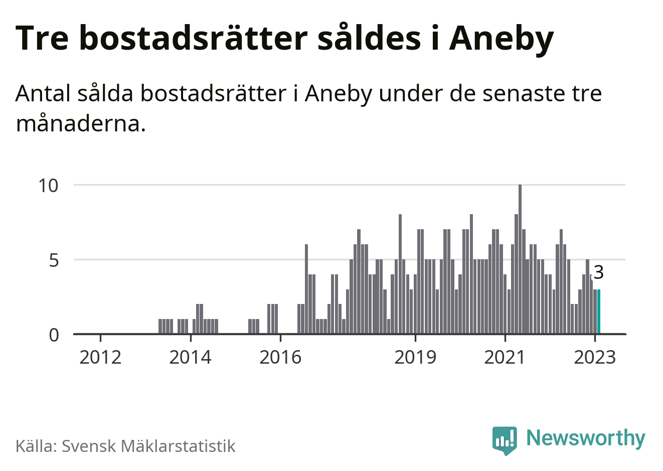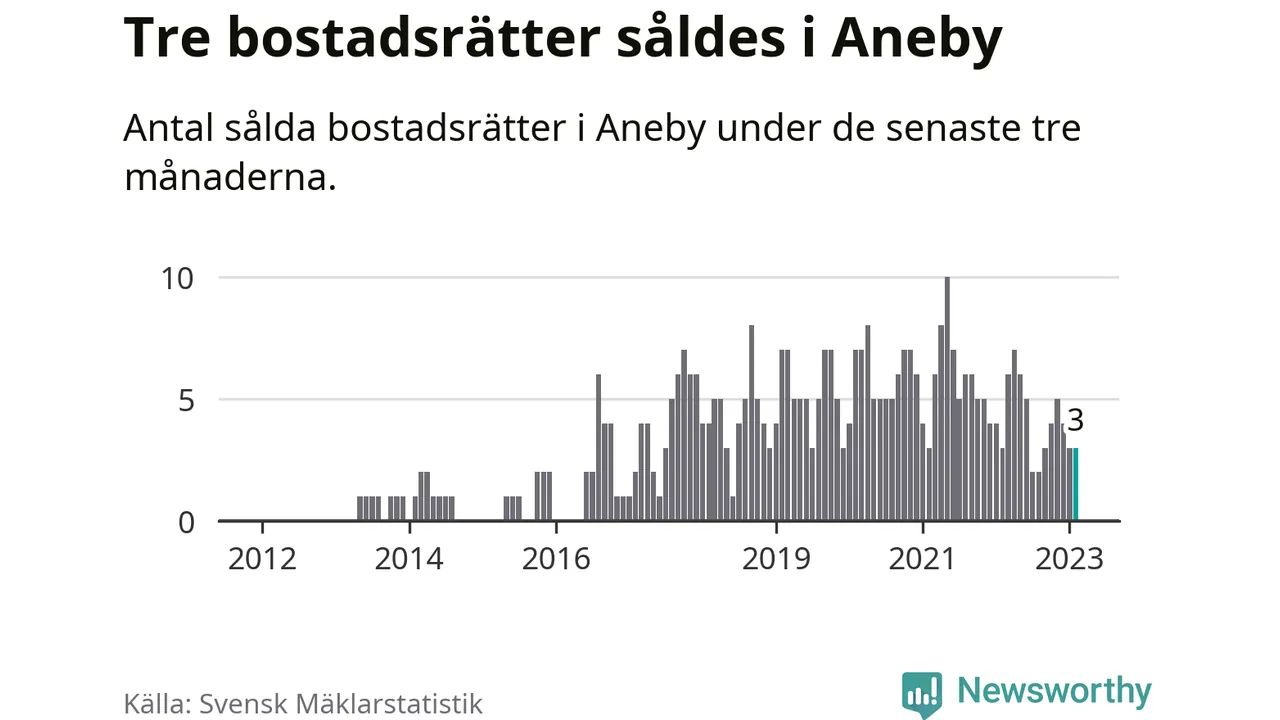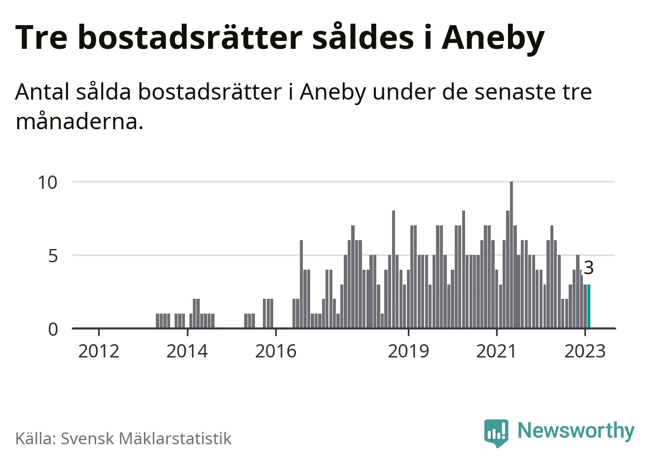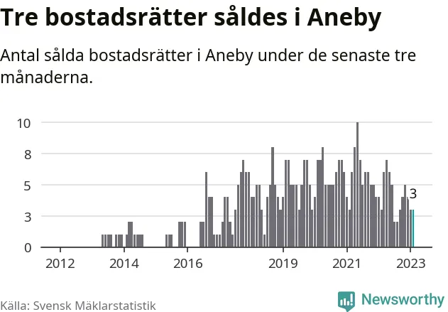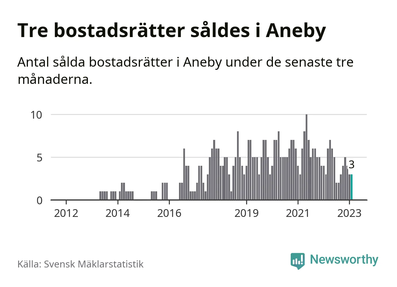 Mellan december och februari gjordes sammanlagt tre affärer med bostadsrätter i Aneby kommun. Det är lika många affärer som vid motsvarande tid i fjol.