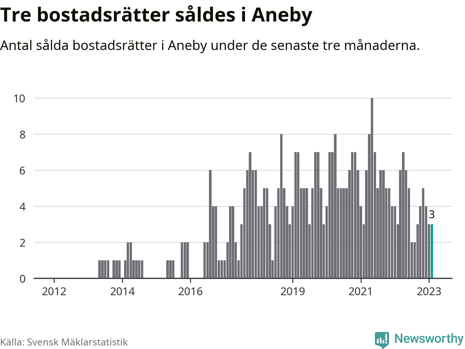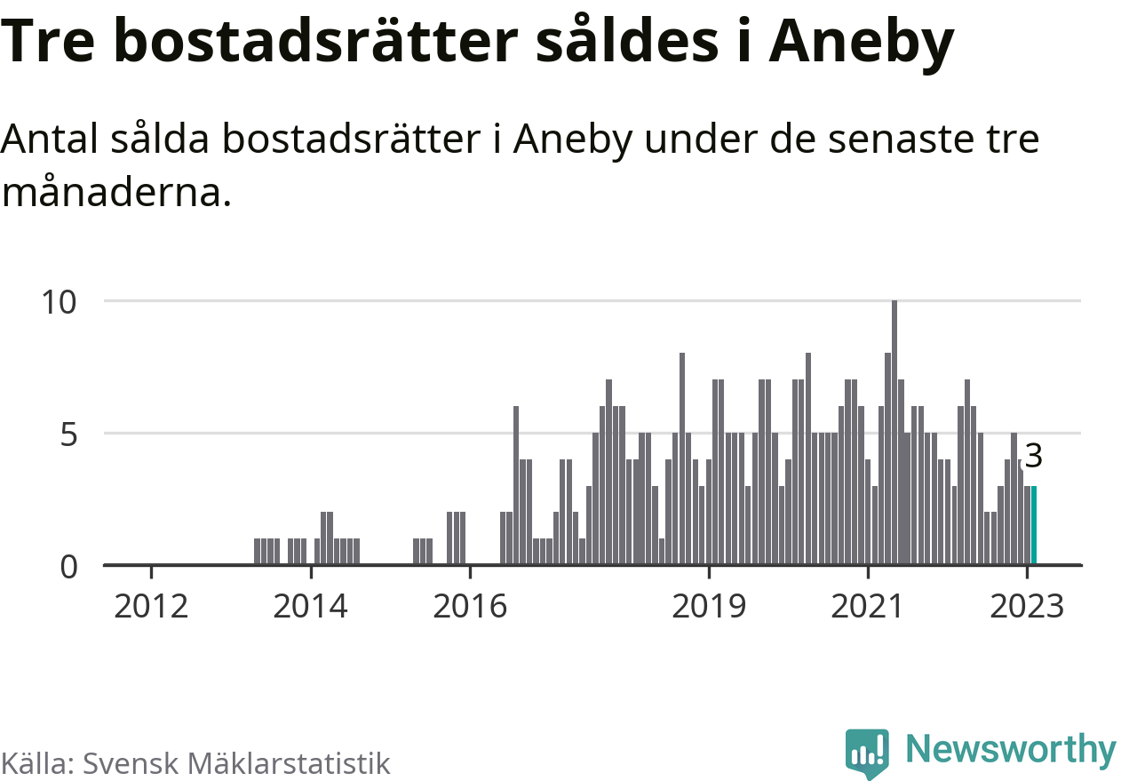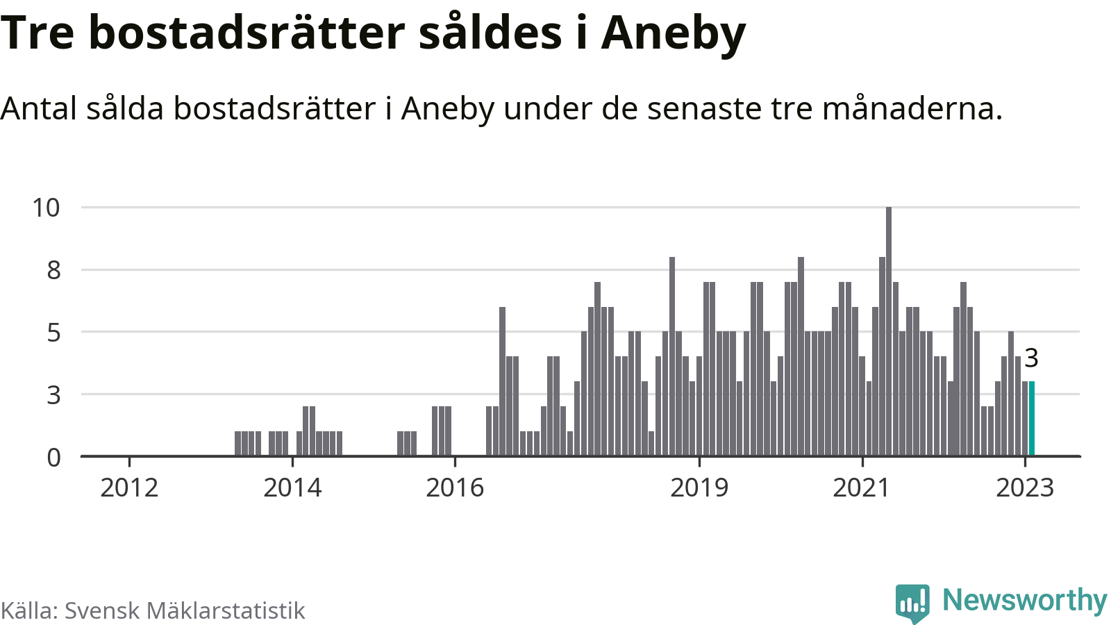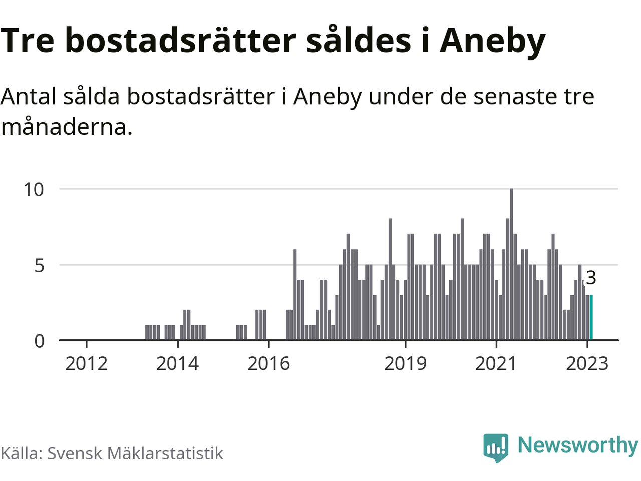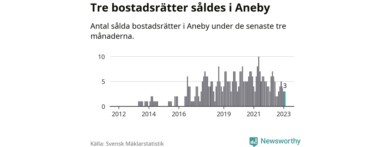 Mellan december och februari gjordes sammanlagt tre affärer med bostadsrätter i Aneby kommun. Det är lika många affärer som vid motsvarande tid i fjol.