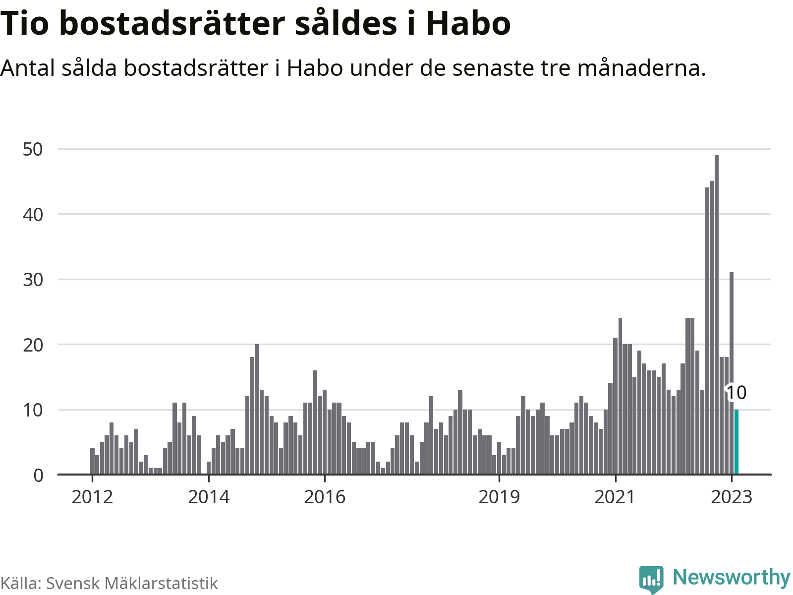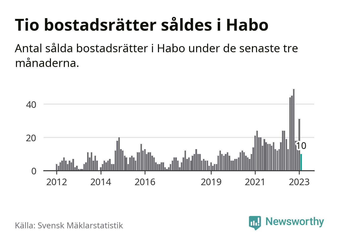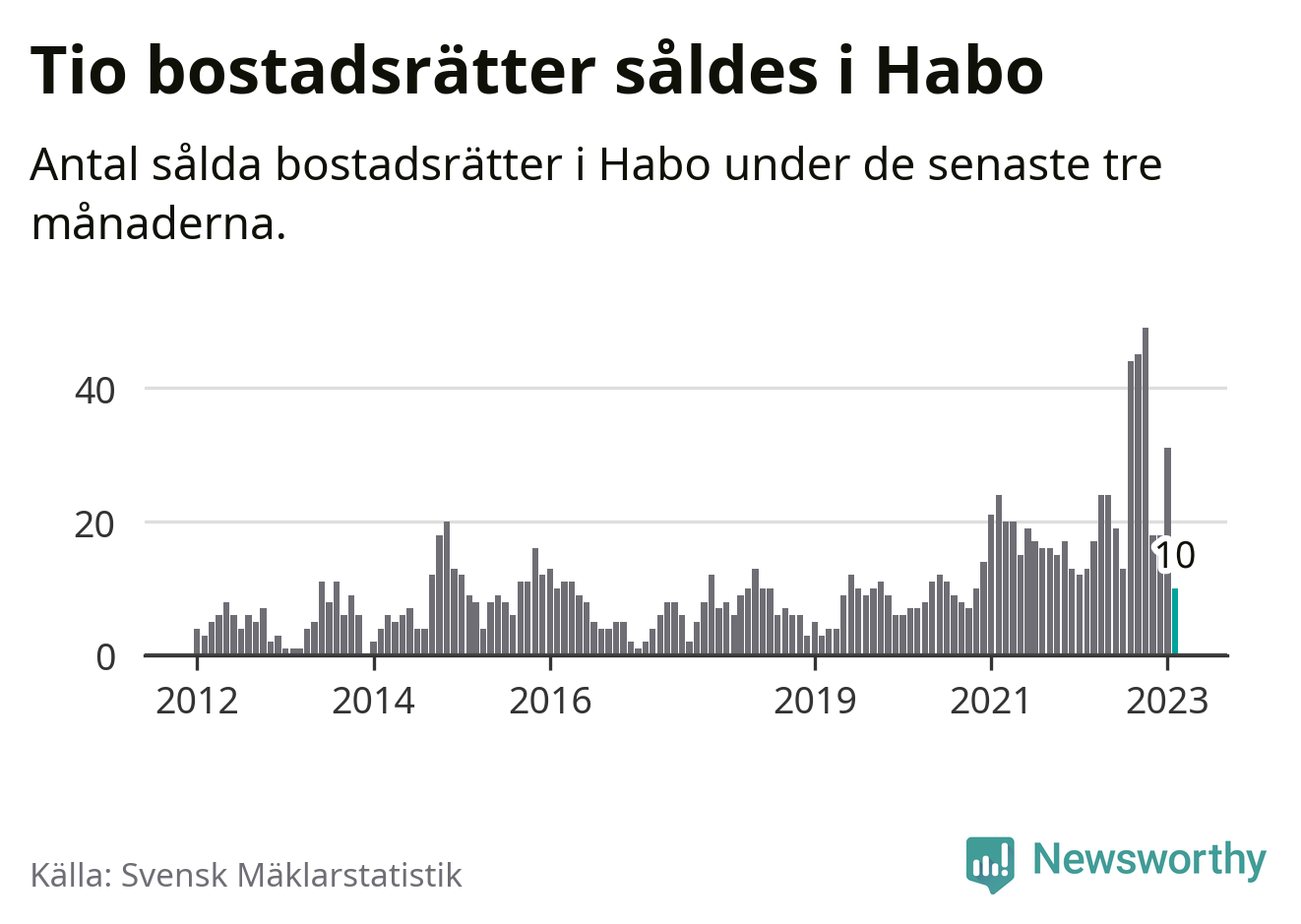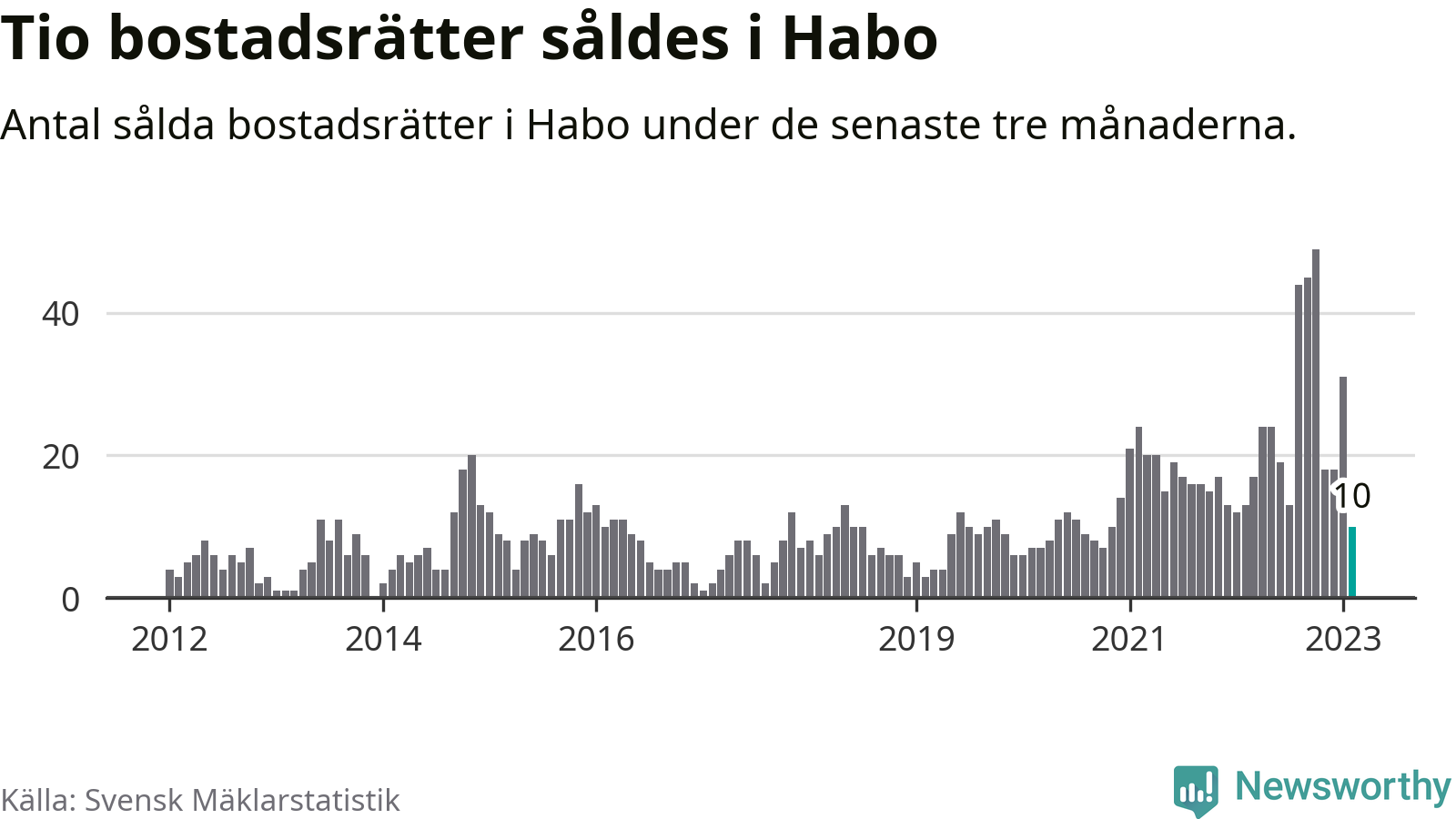 Mellan december och februari gjordes sammanlagt tio affärer med bostadsrätter i Habo kommun. Det kan jämföras med 13 vid motsvarande tid i fjol.