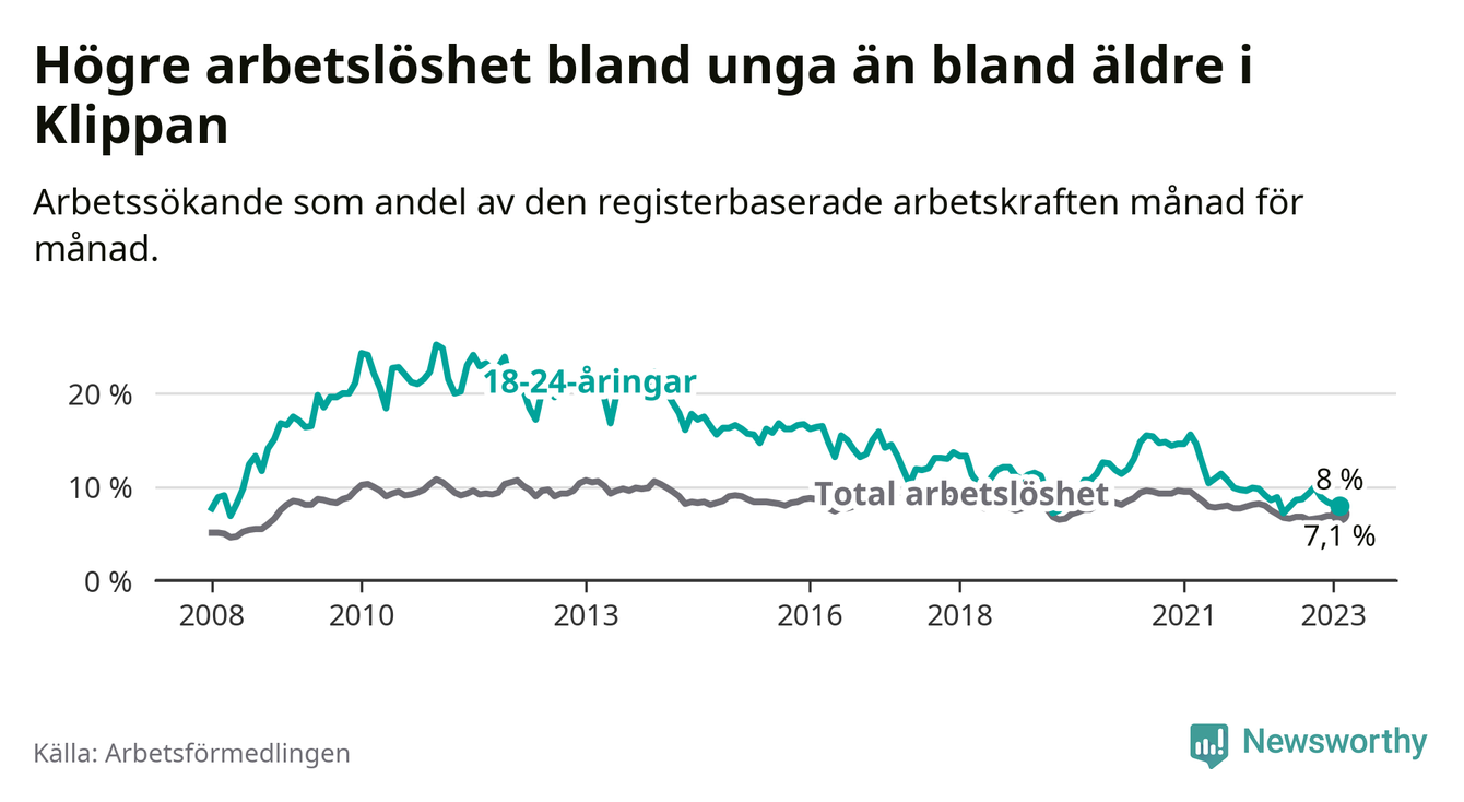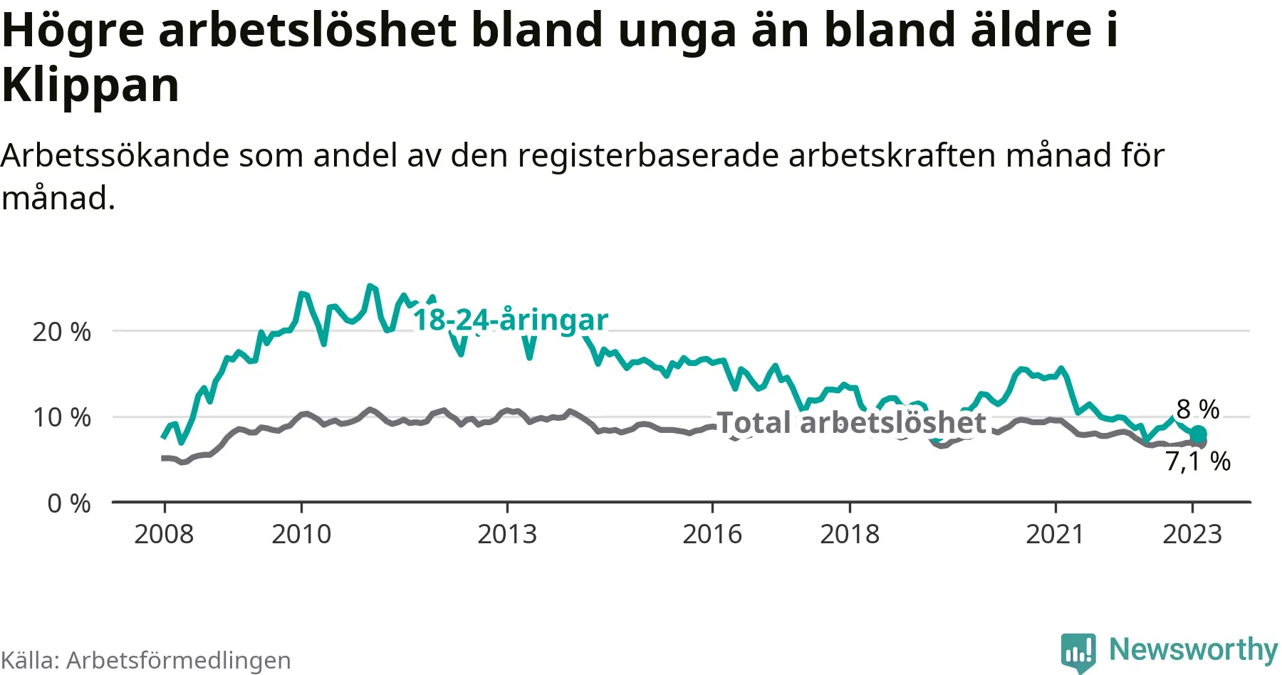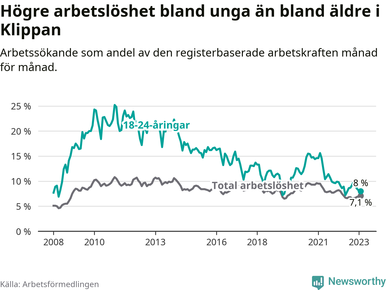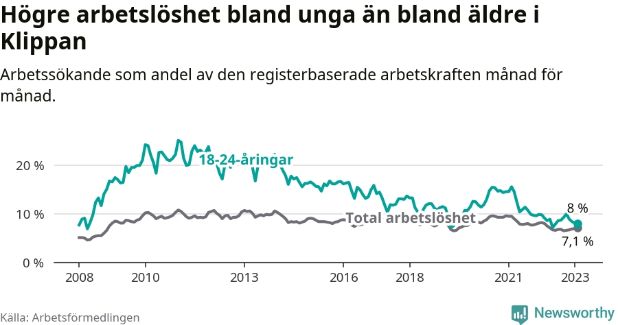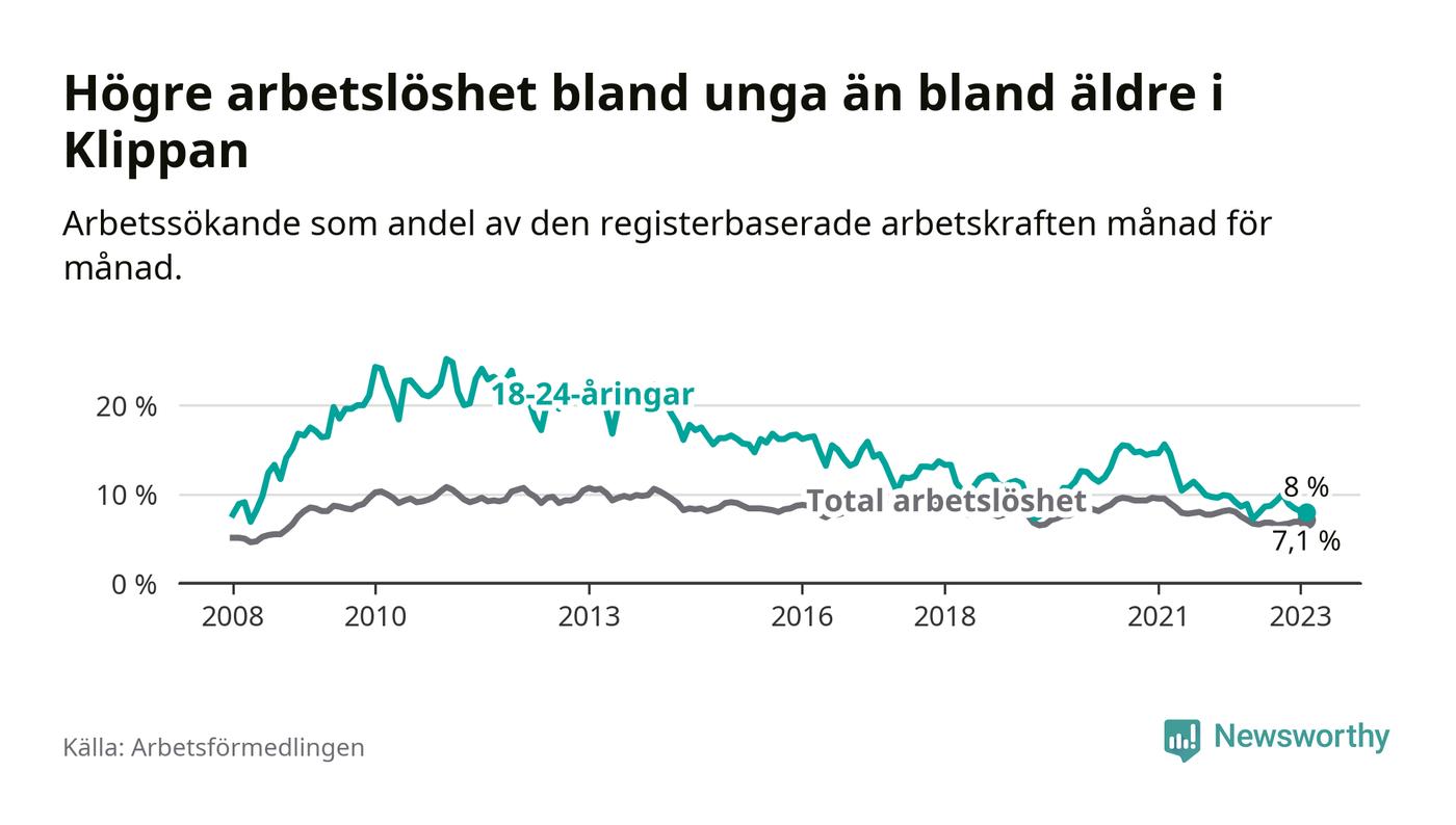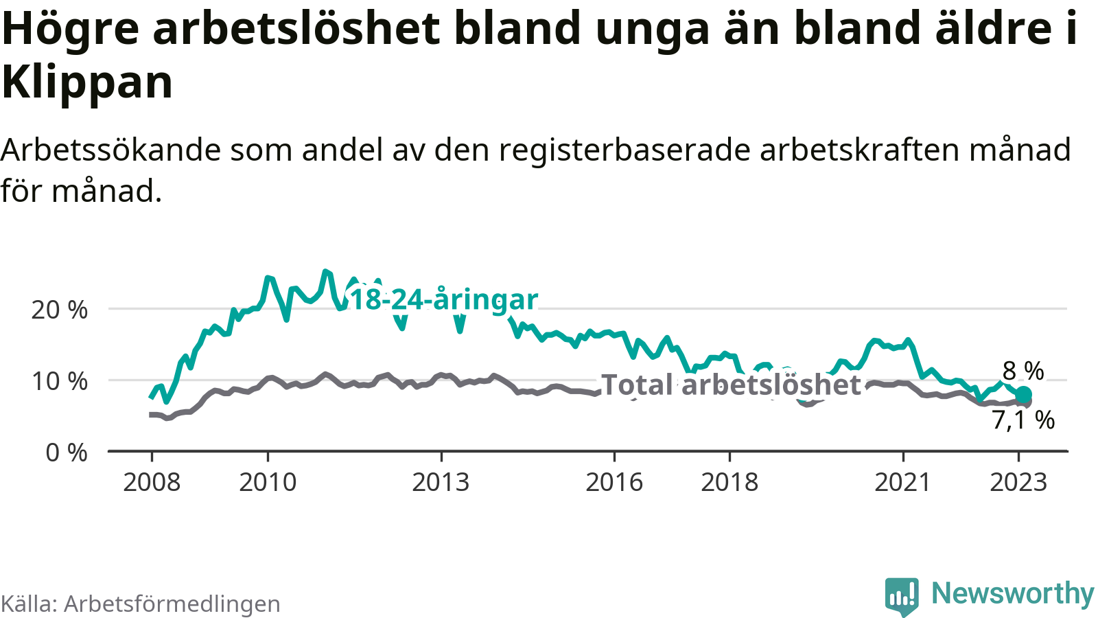 Precis som den totala arbetslösheten sjunker arbetslösheten bland unga (−1,1 procentenheter). I februari var 8,0 procent av 18–24-åringarna inskrivna som arbetssökande (motsvarande 73 personer). Mäter vi antalet inskrivna ser vi en ökning med 64 personer på ett års sikt.