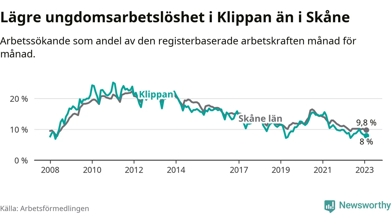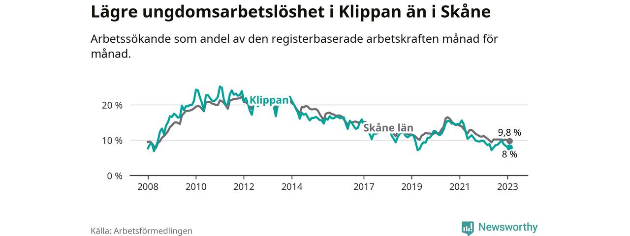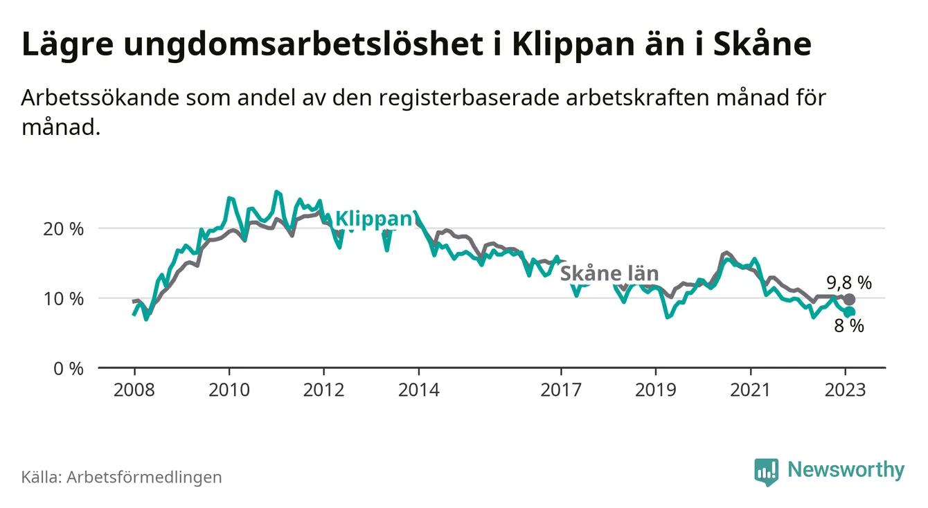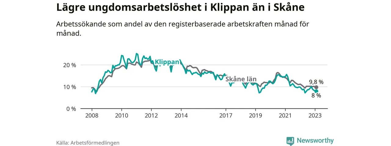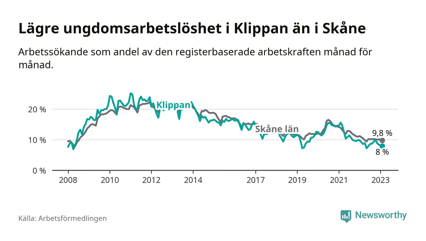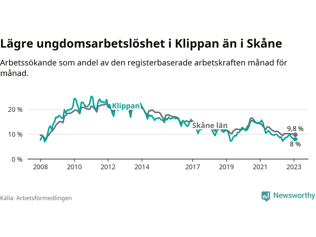 Precis som den totala arbetslösheten ligger ungdomsarbetslösheten i Klippan lägre än i Skåne som helhet. Skillnaden mellan kommunen och länet är 1,8 procentenheter.