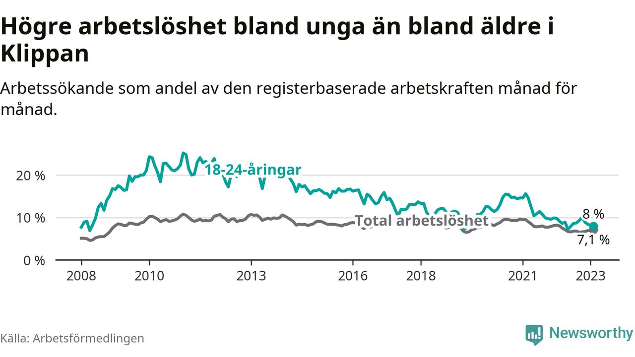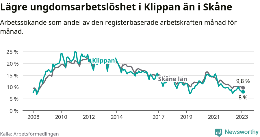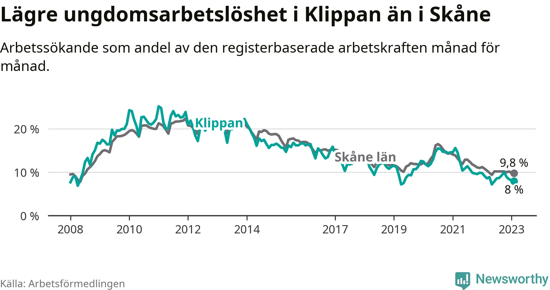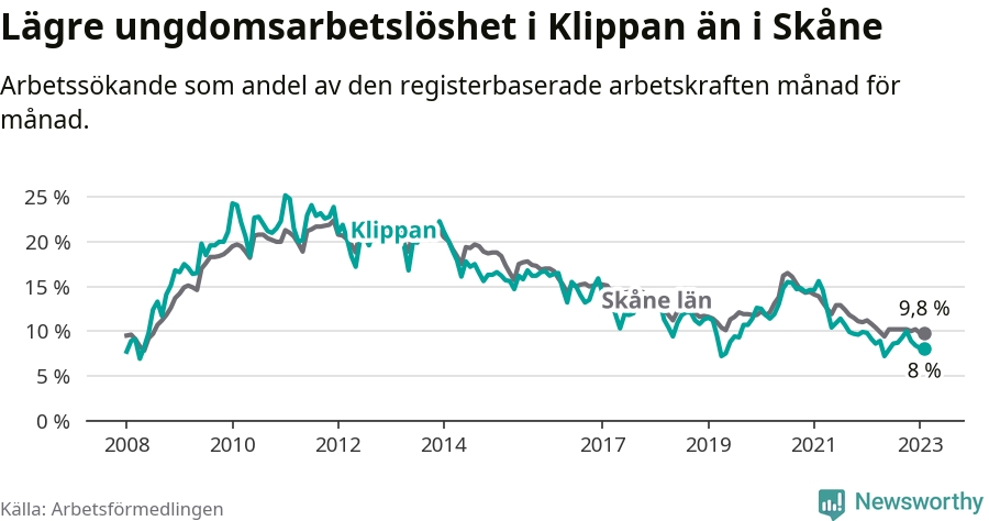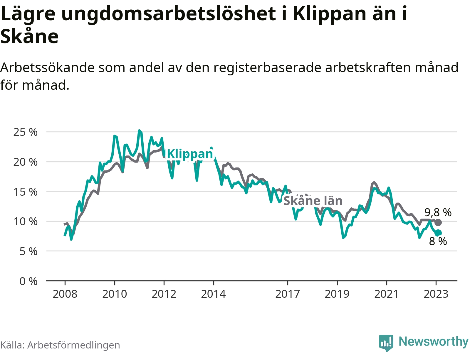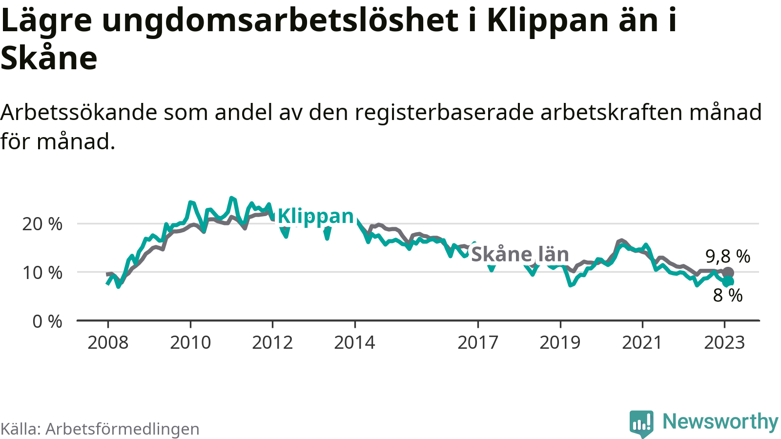Precis som den totala arbetslösheten ligger ungdomsarbetslösheten i Klippan lägre än i Skåne som helhet. Skillnaden mellan kommunen och länet är 1,8 procentenheter.