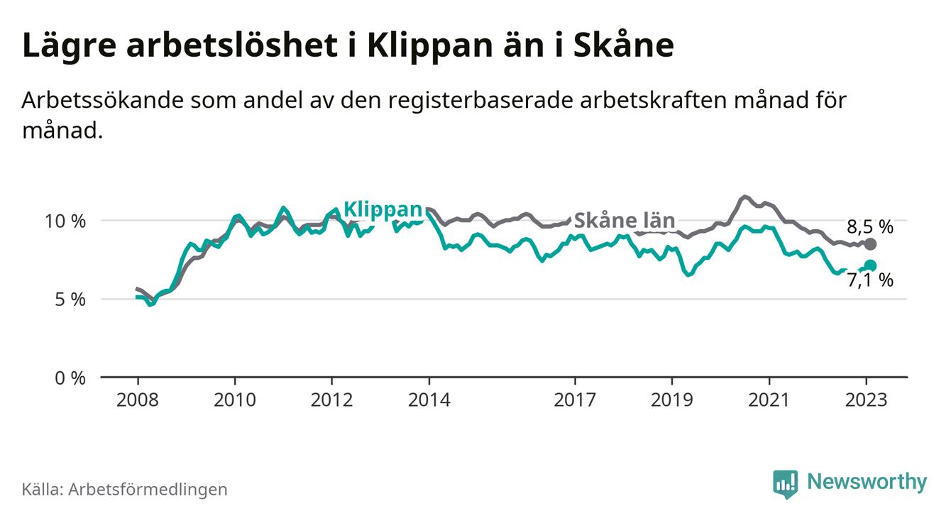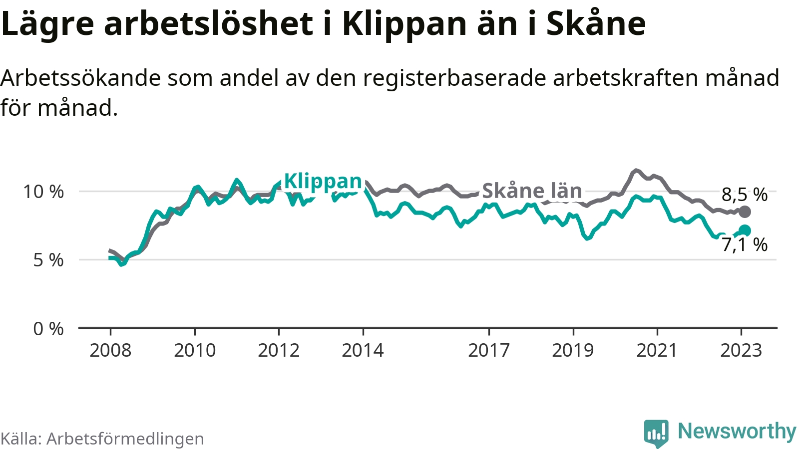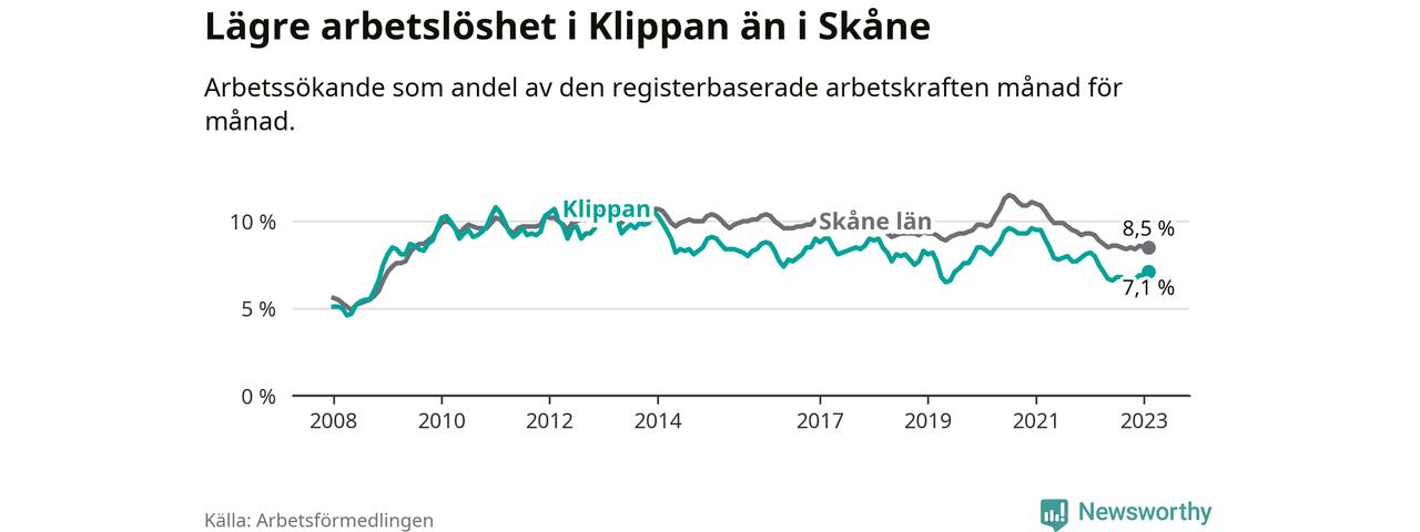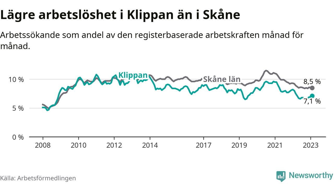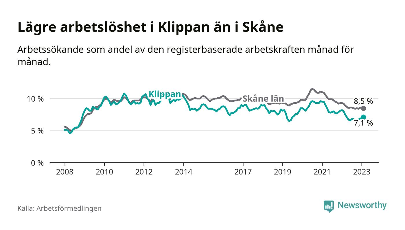Klippan hade redan tidigare lägre arbetslöshet än snittet i hela Skåne län och nu växer klyftan (7,1 procent i kommunen, jämfört med 8,5 procent i hela länet). Lomma har den lägsta arbetslösheten i länet (3,2 procent), medan Perstorp har den högsta (12,9 procent). För att Klippan skulle komma ner i samma arbetslöshetsnivå som Lomma skulle 329 personer behöva sysselsättas.