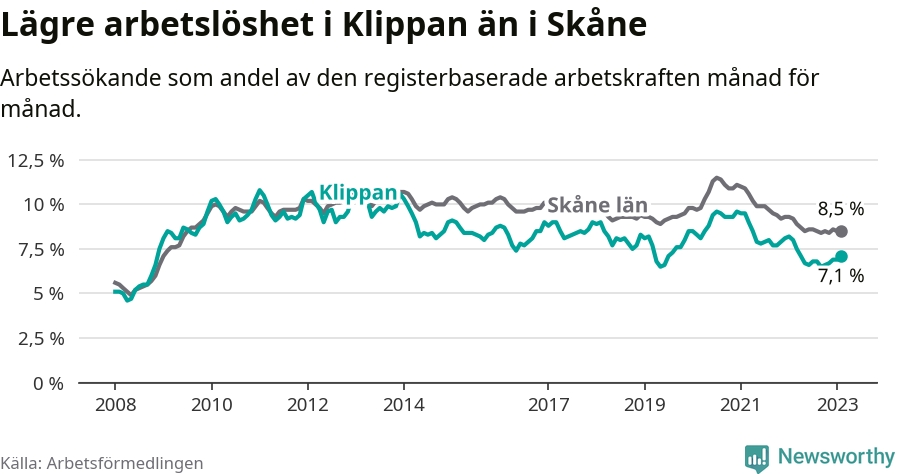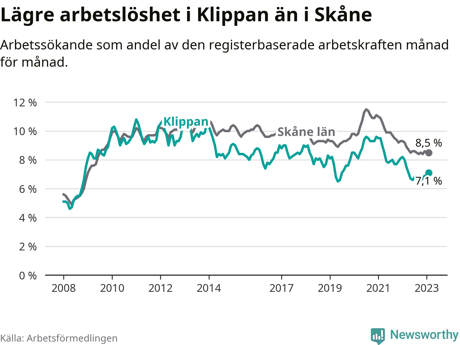 Under februari månad rapporterade Klippans kommun en total arbetslöshet på 7,1 procent. Det är en minskning jämfört med samma tidpunkt i fjol (−0,9 procentenheter). Även i Skåne län sjunker arbetslösheten .
