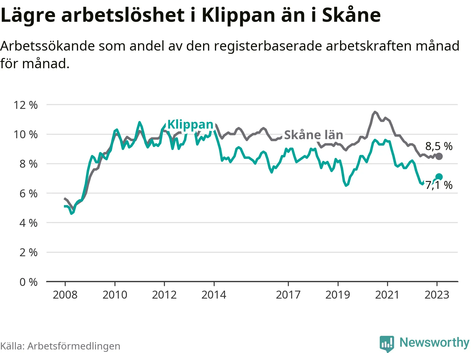 Det är 22:a månaden i följd som arbetslösheten i Klippan är lägre än den var under samma tidpunkt året innan. Sedan april 2021 har arbetslösheten gått ner från 8,5 till 7,1 procent.