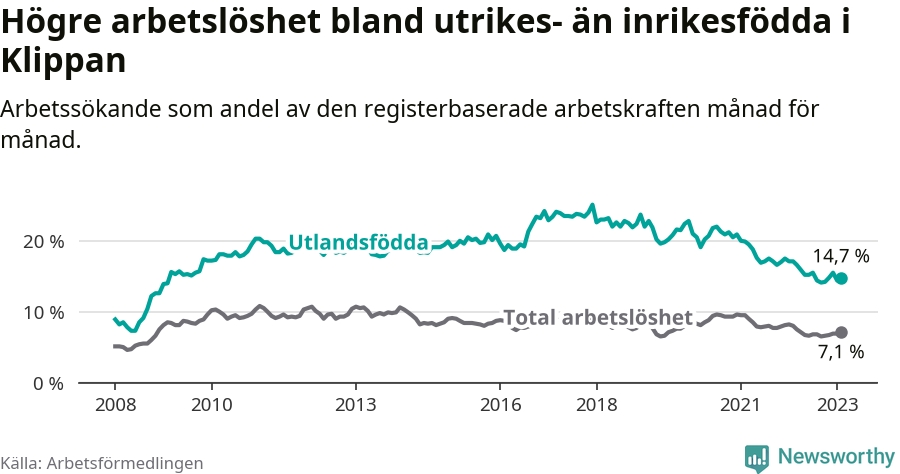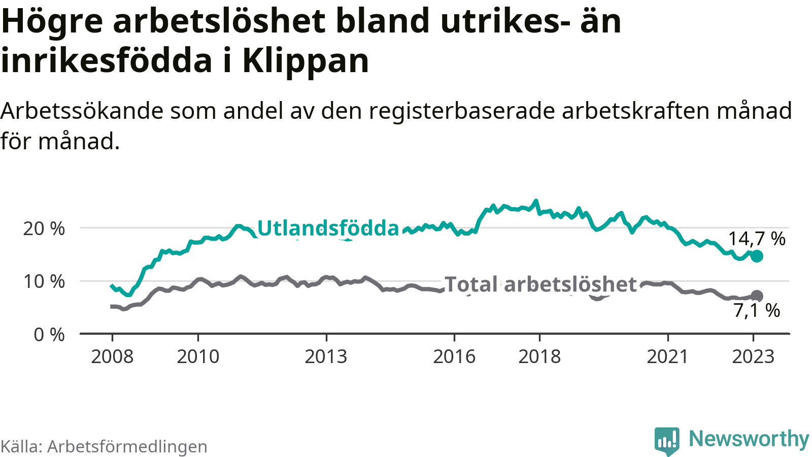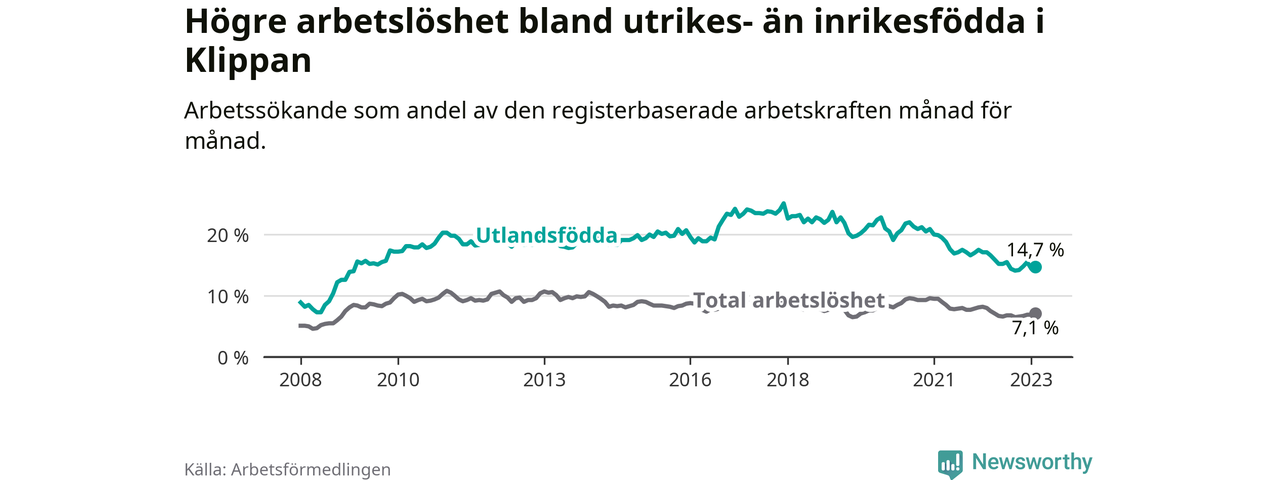 Arbetslösheten bland utlandsfödda var 14,7 procent i Klippan under februari månad, motsvarande 273 av 1 857 personer. Det är 2,4 procentenheter färre än vid samma tidpunkt i fjol (+256 om man räknar personer). Därmed är de utlandsföddas arbetslöshet lägre än vid samma tidpunkt i fjol för 23:e månaden i följd. Sedan mars 2021 har arbetslösheten bland utlandsfödda minskat från 19,5 till 14,7 procent.