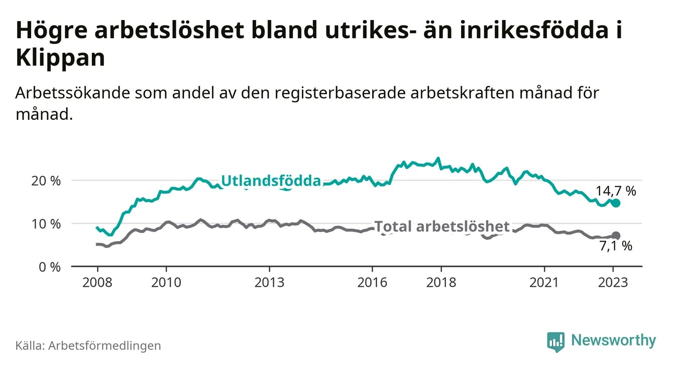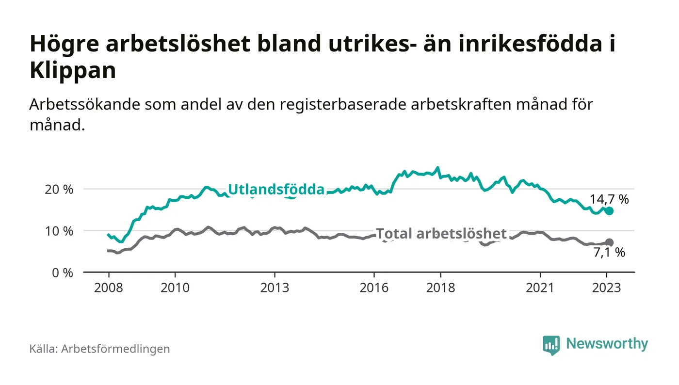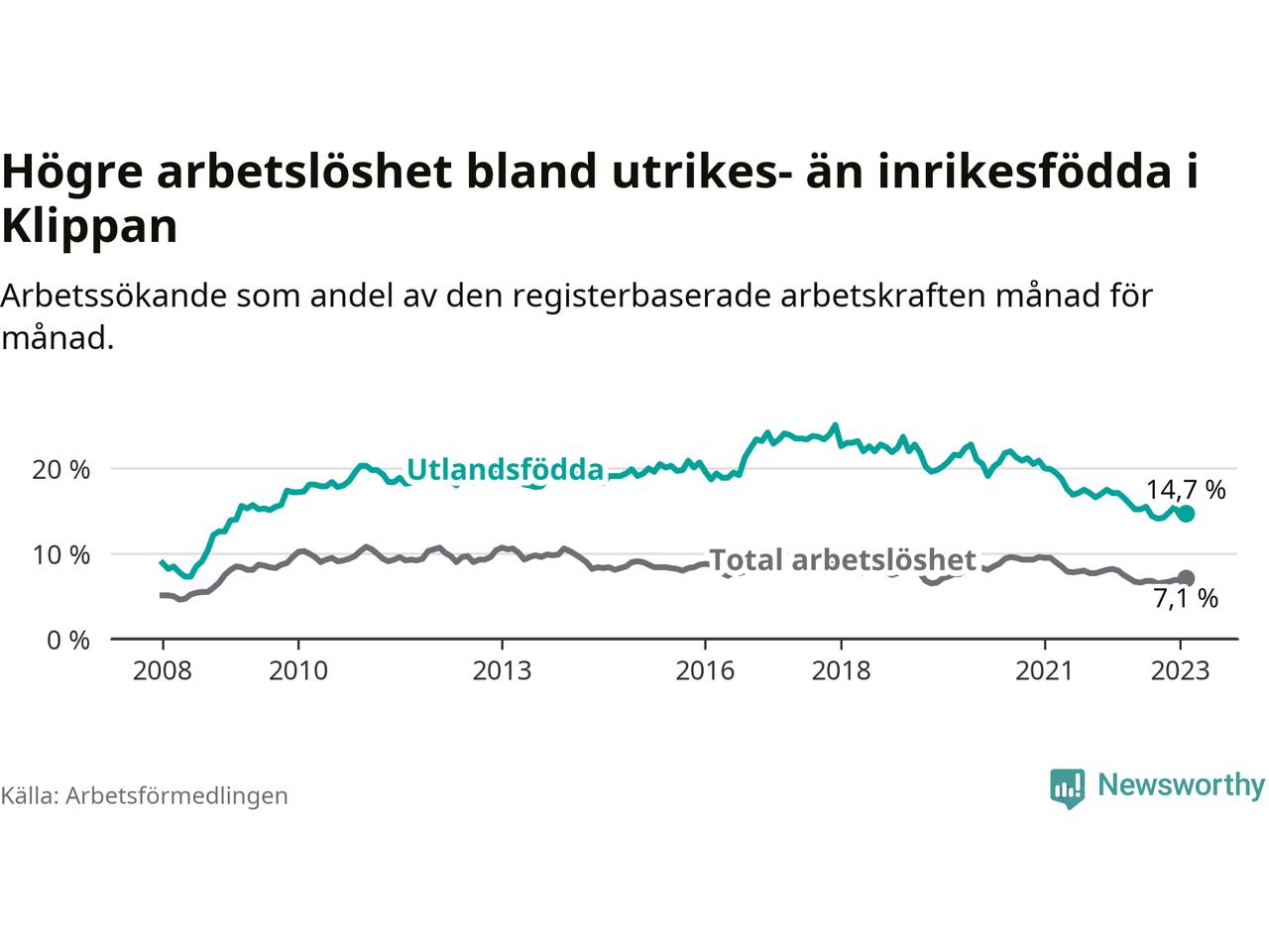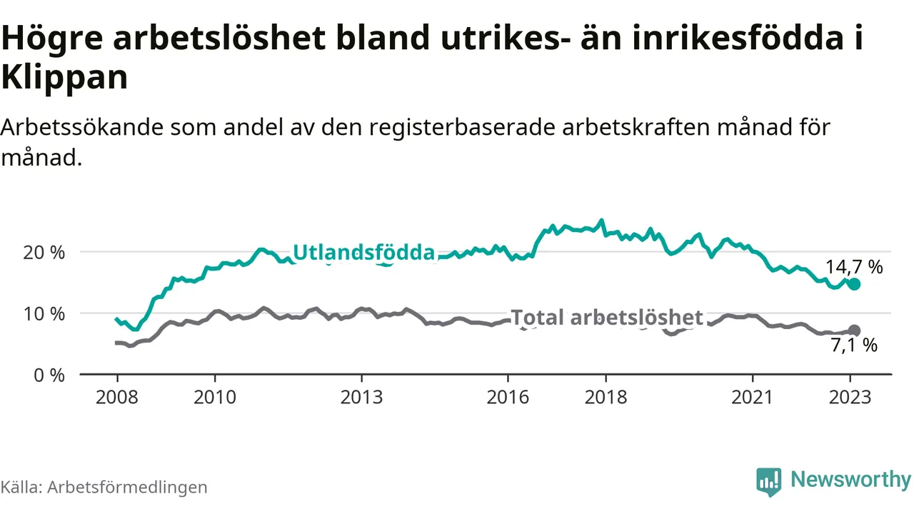 Skillnaden i arbetslöshet mellan utrikesfödda och hela befolkningen är 7,6 procentenheter i Klippan. Det är en betydligt mindre skillnad än för ett år sedan (−1,5 procentenheter).