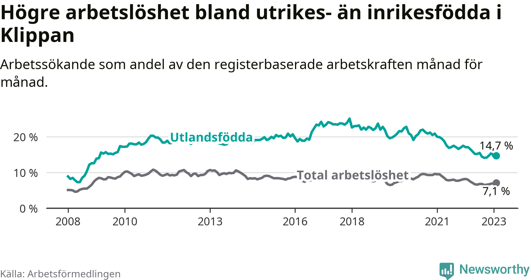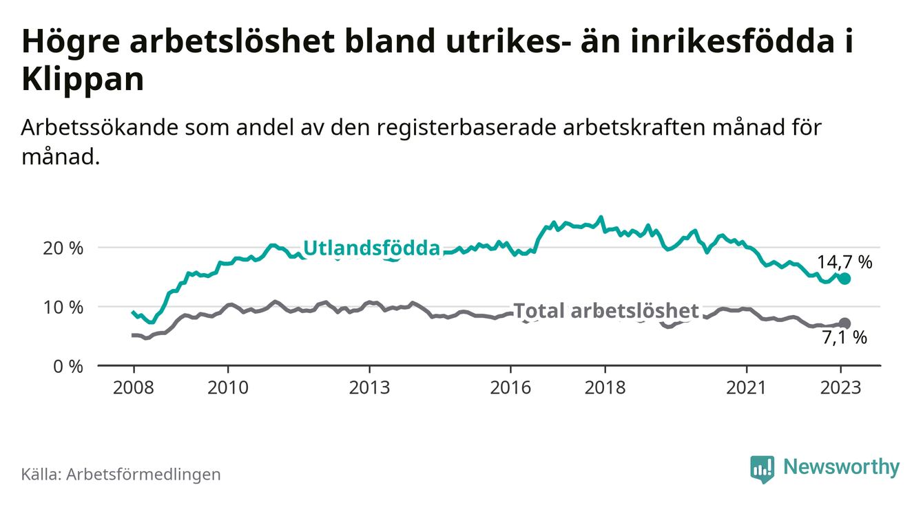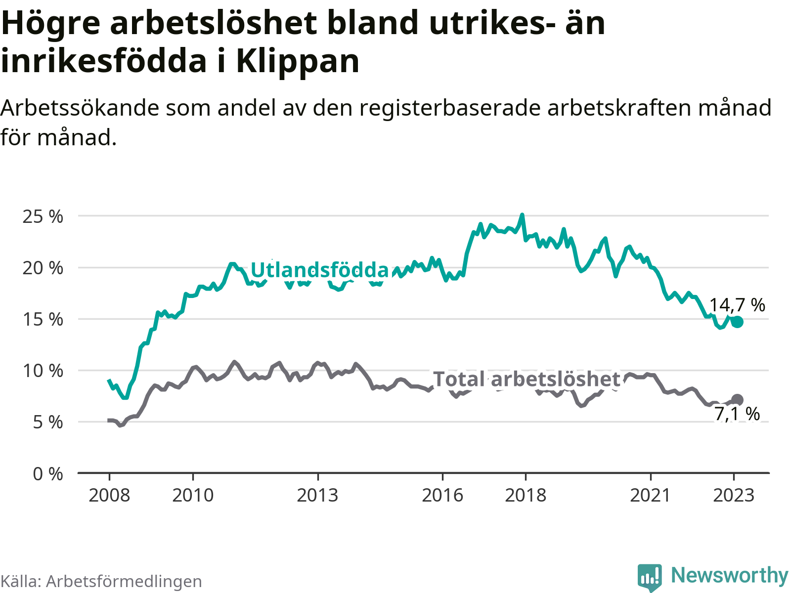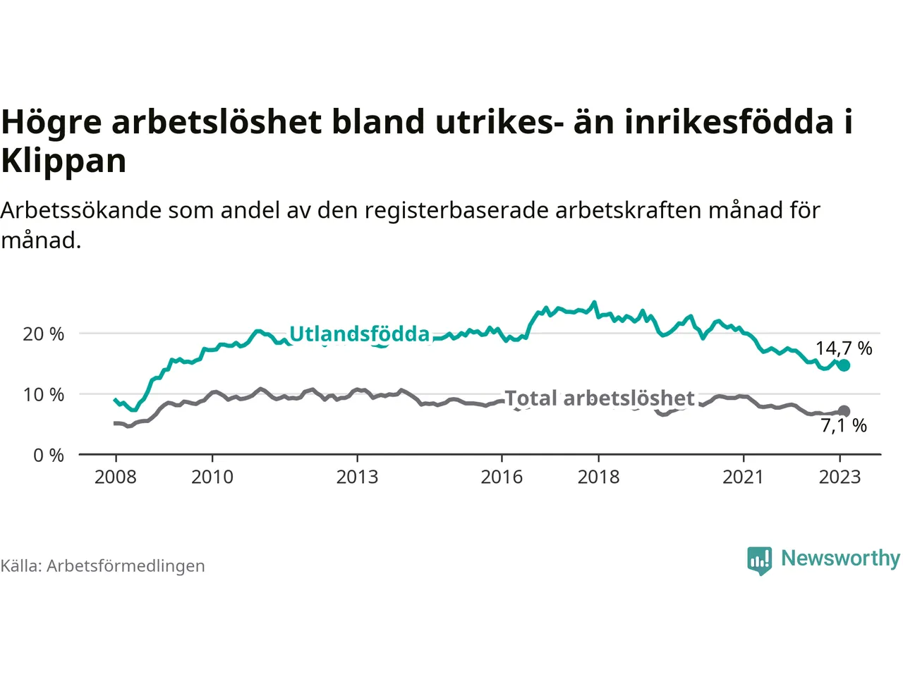 Skillnaden i arbetslöshet mellan utrikesfödda och hela befolkningen är 7,6 procentenheter i Klippan. Det är en betydligt mindre skillnad än för ett år sedan (−1,5 procentenheter).