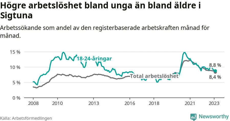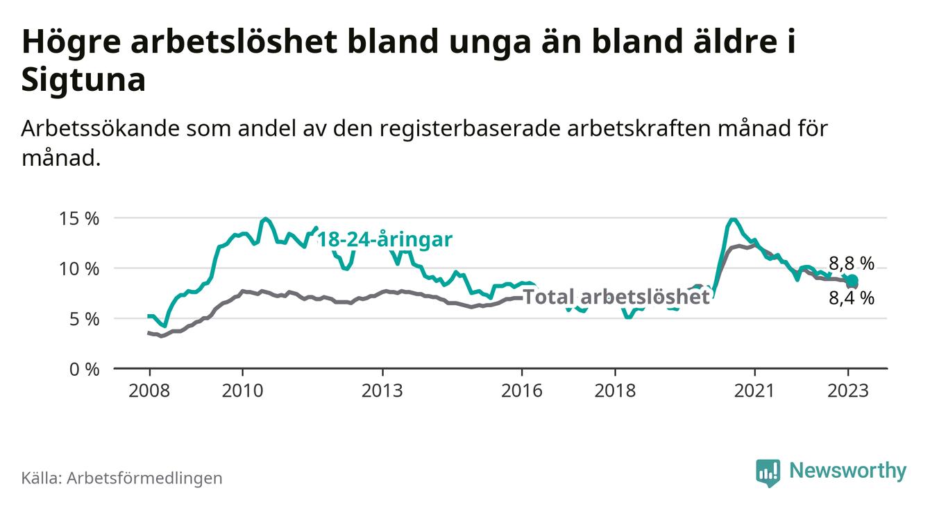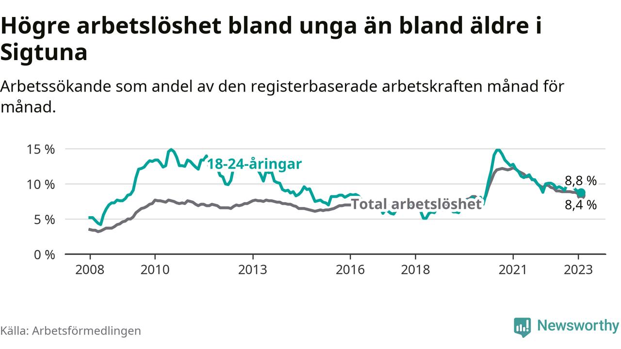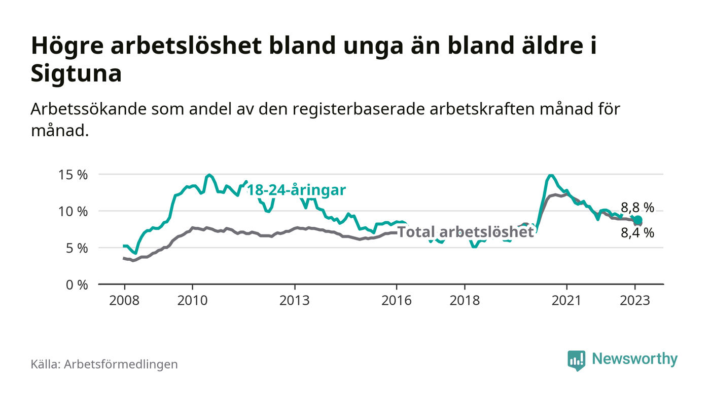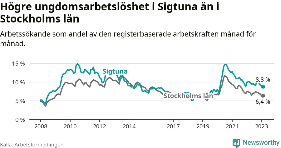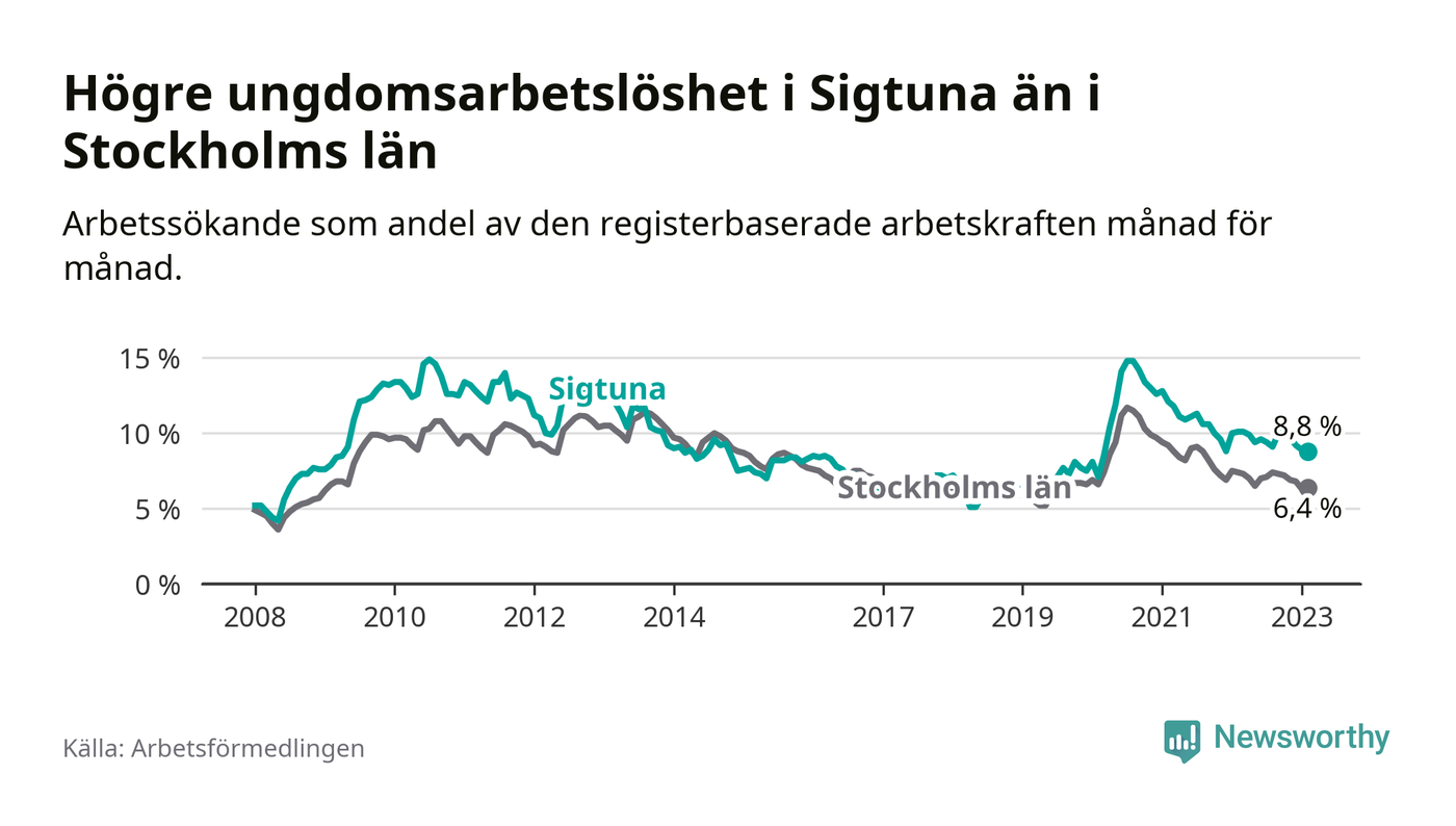 Precis som den totala arbetslösheten ligger ungdomsarbetslösheten i Sigtuna högre än i Stockholms län som helhet. Skillnaden mellan kommunen och länet är 2,4 procentenheter.