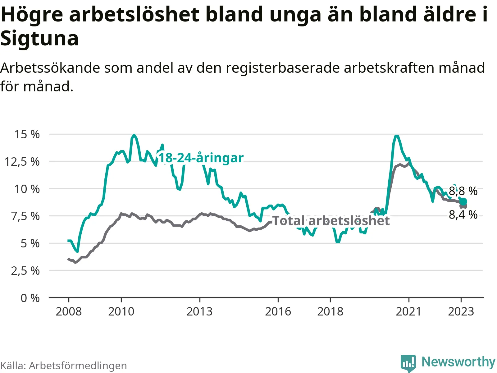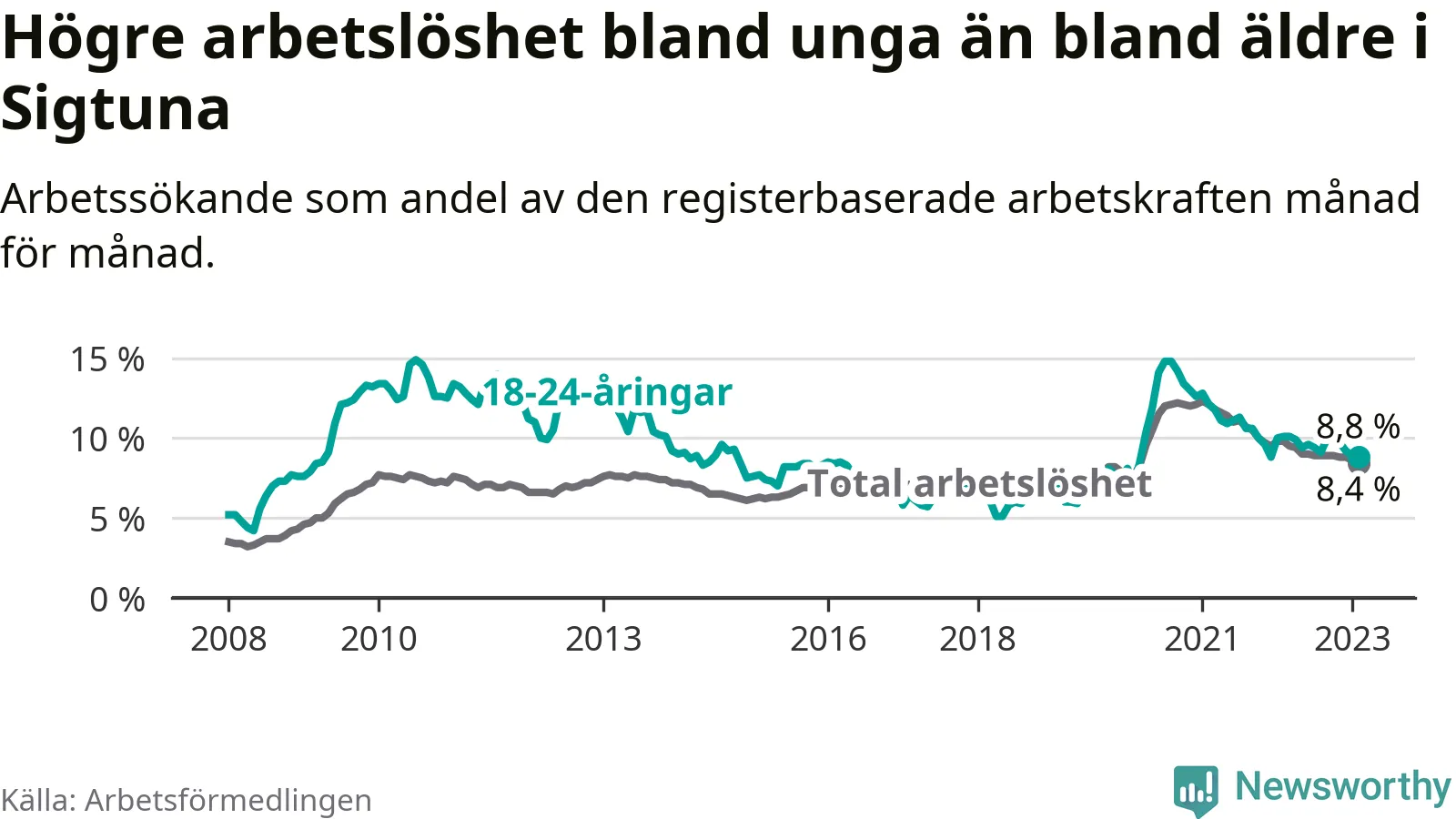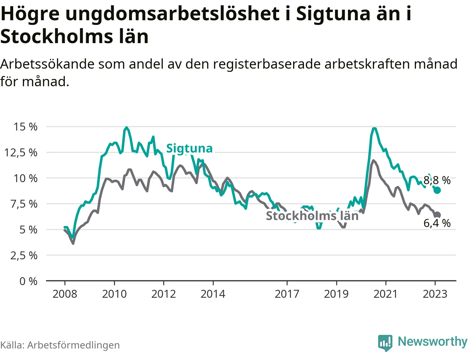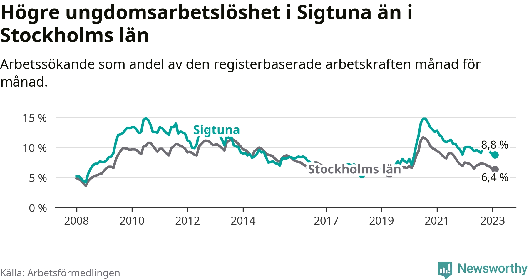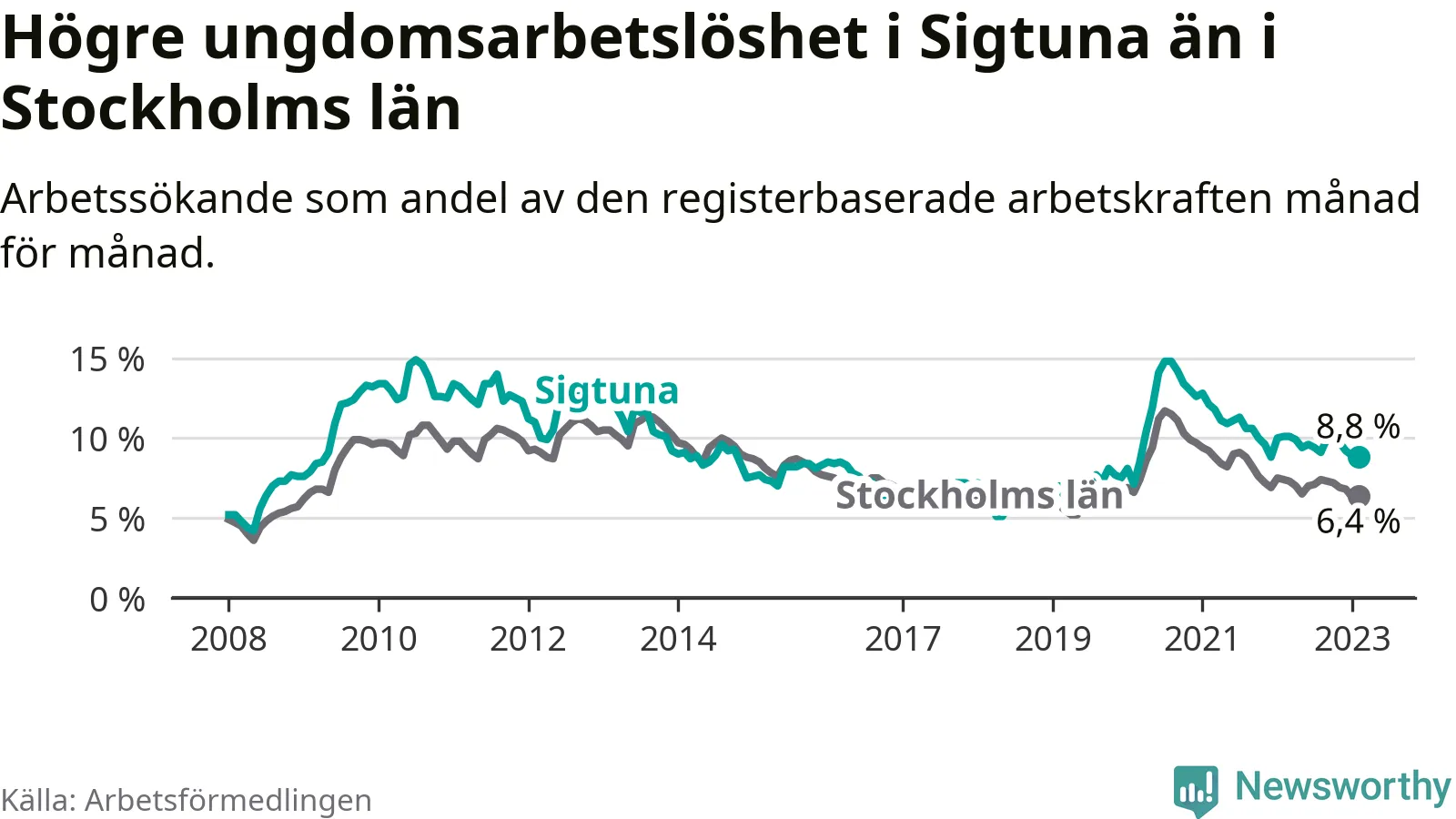 Precis som den totala arbetslösheten ligger ungdomsarbetslösheten i Sigtuna högre än i Stockholms län som helhet. Skillnaden mellan kommunen och länet är 2,4 procentenheter.