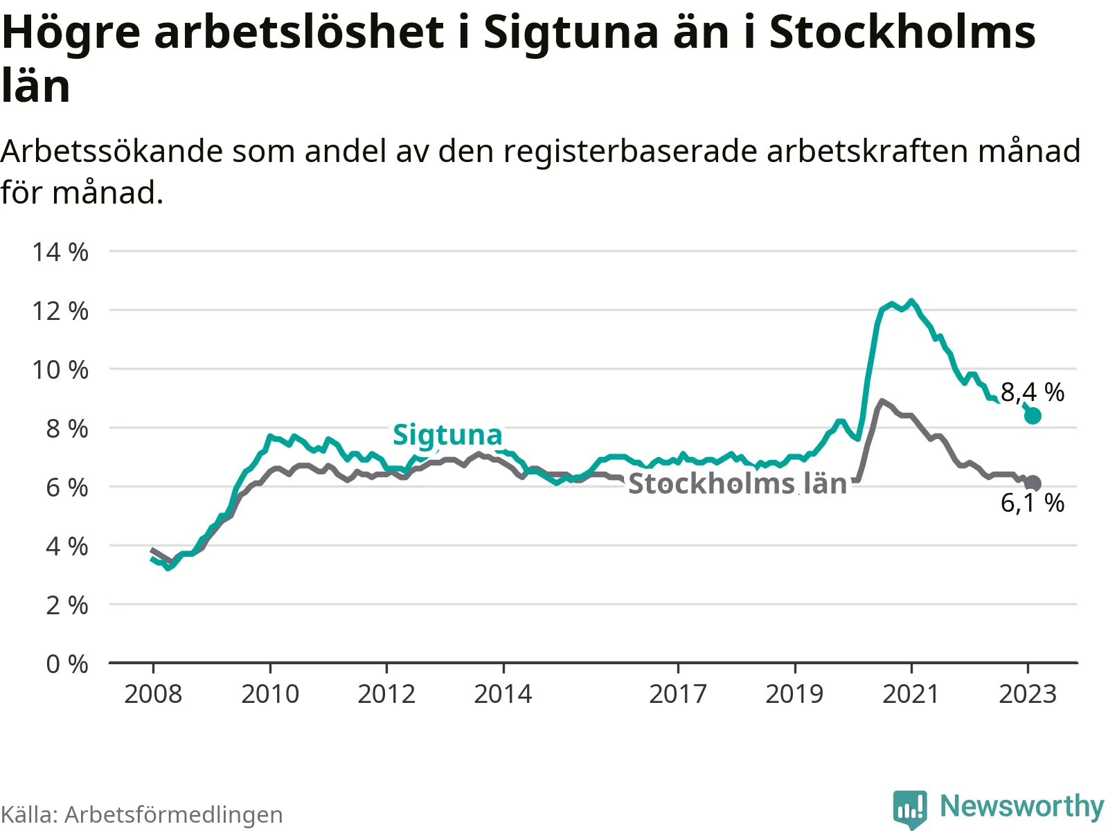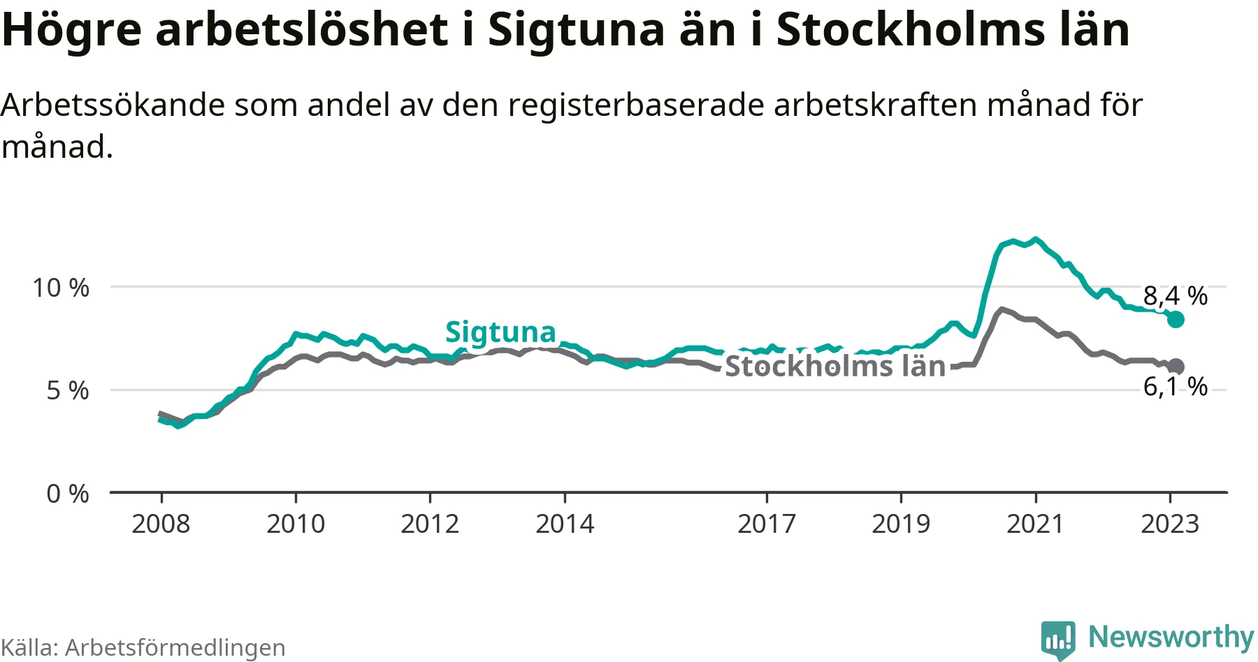 Under februari månad rapporterade Sigtuna kommun en total arbetslöshet på 8,4 procent. Det är en minskning jämfört med samma tidpunkt i fjol (−1,4 procentenheter). Även i Stockholms län sjunker arbetslösheten .