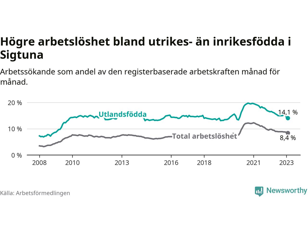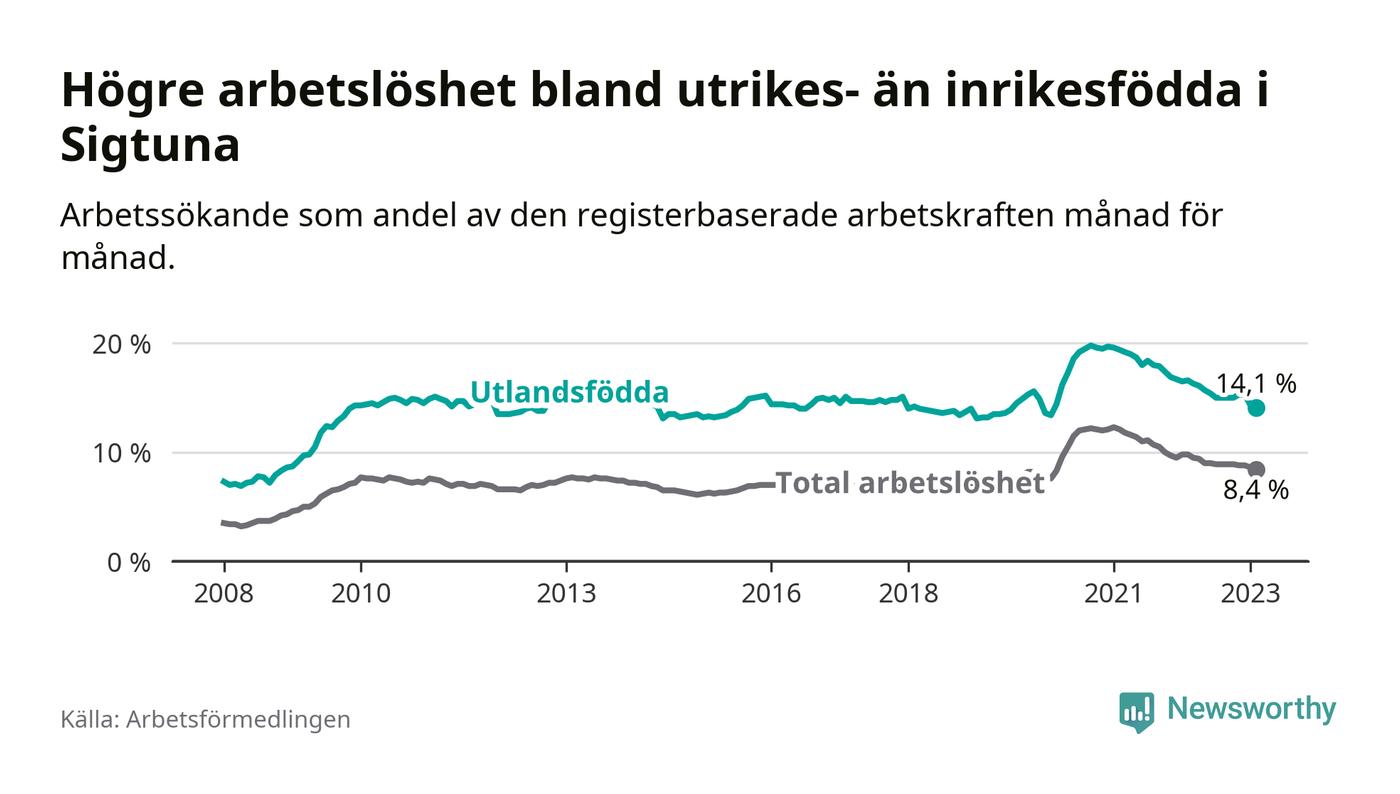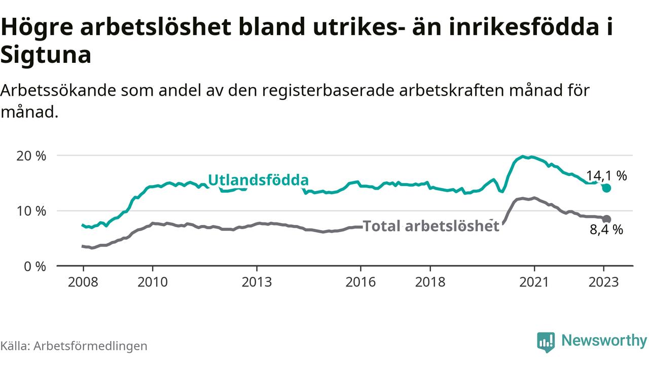 Arbetslösheten bland utlandsfödda var 14,1 procent i Sigtuna under februari månad, motsvarande 1 648 av 11 688 personer. Det är 2,5 procentenheter färre än vid samma tidpunkt i fjol (+1 631 om man räknar personer). Därmed är de utlandsföddas arbetslöshet lägre än vid samma tidpunkt i fjol för 21:a månaden i följd. Sedan maj 2021 har arbetslösheten bland utlandsfödda minskat från 18,7 till 14,1 procent. Den nuvarande arbetslöshetsnivån är den lägsta sedan februari 2020.
